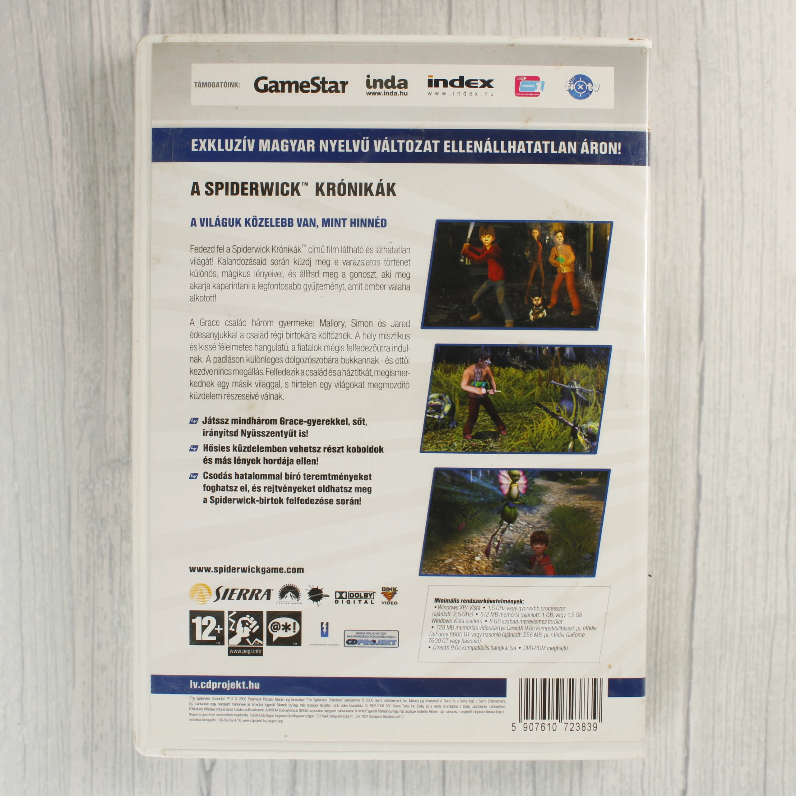 A Spiderwick Krónikák című videójáték PC-re, magyar nyelvű kiadásban. A csomag egy fehér színű, normál műanyag tokot tartalmaz, amelyben egy DVD-ROM lemez és a hozzá tartozó színes borító található. A borító előlapján a film főszereplői láthatók fantasy környezetben, a Sierra és a Nickelodeon Movies logóival. A hátoldalon magyar nyelvű leírás, képernyőmentések a játékból, valamint a minimális rendszerkövetelmények olvashatók. A lemez felülete sárgás-zöldes grafikával díszített, rajta a játék címével és a kiadók emblémáival. A tok belső részén, a jobb alsó sarokban kisebb barna elszíneződés vagy szennyeződés látható.