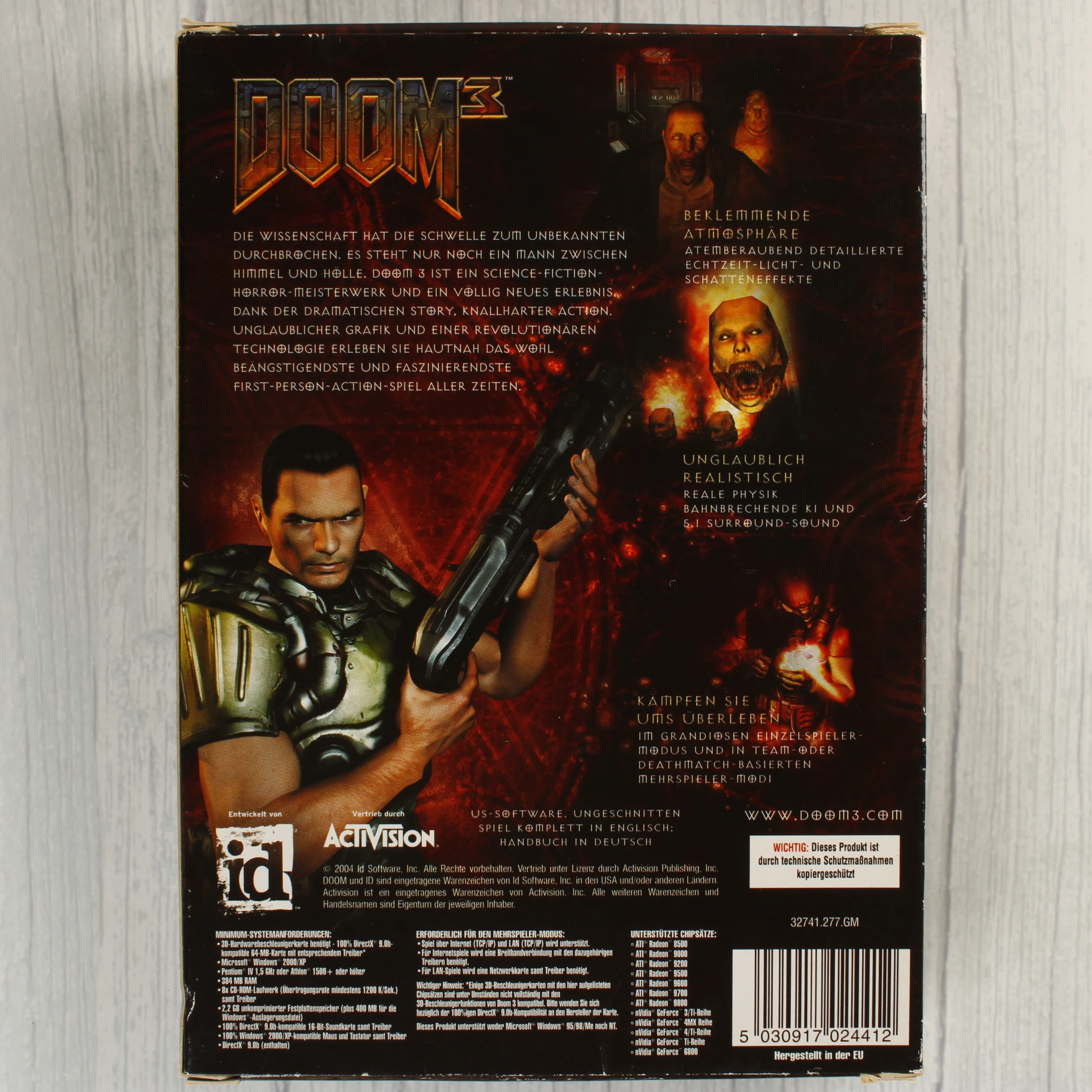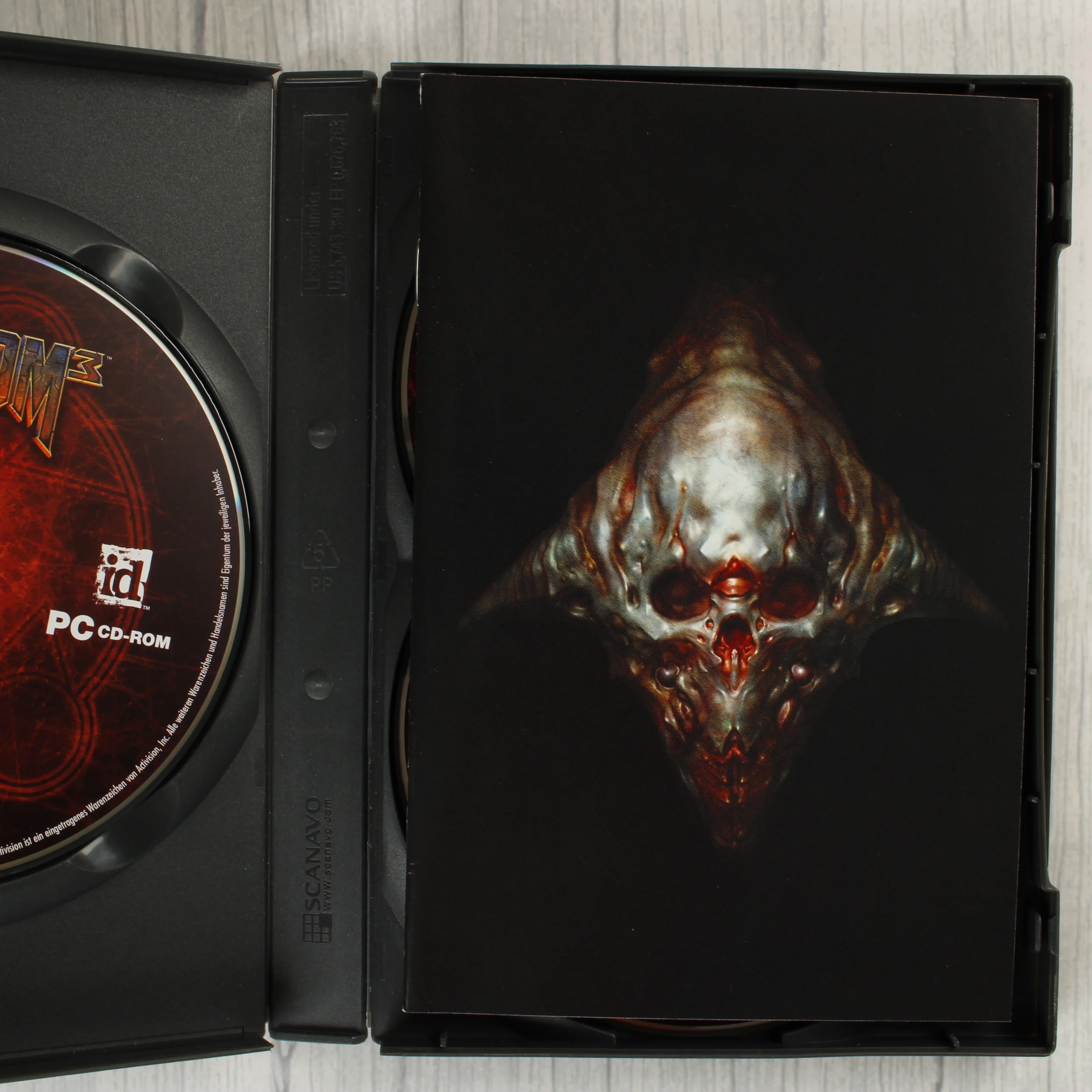 A Doom 3 videójáték PC-s kiadása, amely egy karton védőborítóból, egy fekete műanyag tokból, három CD-ROM lemezből és egy kézikönyvből áll. A külső papírborítón egy démoni lény látható, felette az 'UNCUT' felirat jelzi a vágatlan verziót. A hátoldalon német nyelvű leírás, játékmenet-fotók és a rendszerkövetelmények olvashatók. A belső műanyag tok három darab, vörös és fekete grafikával ellátott lemezt tartalmaz, melyeken az id Software logója látható. A mellékelt kézikönyv borítója sötét tónusú, közepén egy koponyaszerű motívummal. A csomagoláson látható az USK korhatár-besorolási jelzése.