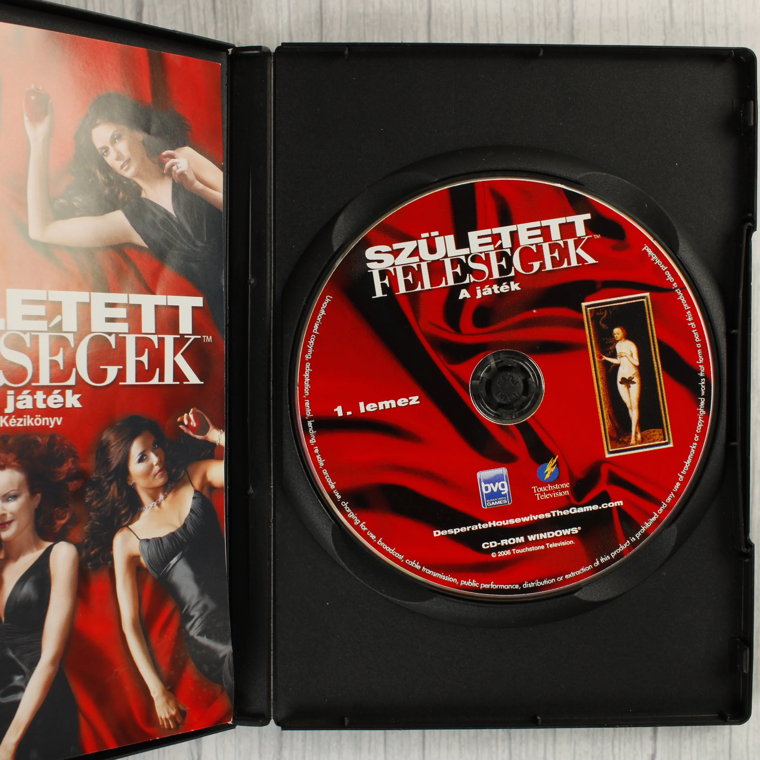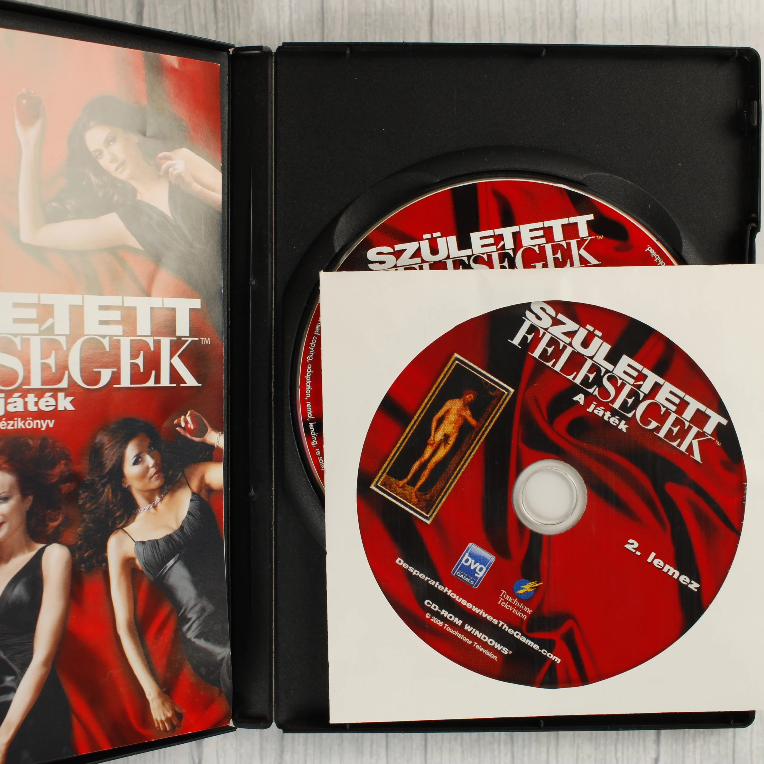 A Született feleségek: A játék című PC-s videójáték magyar nyelvű kiadása. A csomag egy fekete műanyag tokot tartalmaz, amelyben két darab CD-ROM lemez és egy színes, magyar nyelvű kézikönyv található. Az első lemez a tok belső tartójában, a második lemez egy fehér papírtokban helyezkedik el. A borítón a sorozat főszereplői láthatóak vörös háttér előtt, almákkal a kezükben. A hátoldalon magyar nyelvű ismertető szöveg, játékmenet-képek és a minimális rendszerkövetelmények olvashatóak. A kiadványon szerepel a PEGI 16-os korhatár-besorolás, valamint a Buena Vista Games és a Touchstone Television logója.