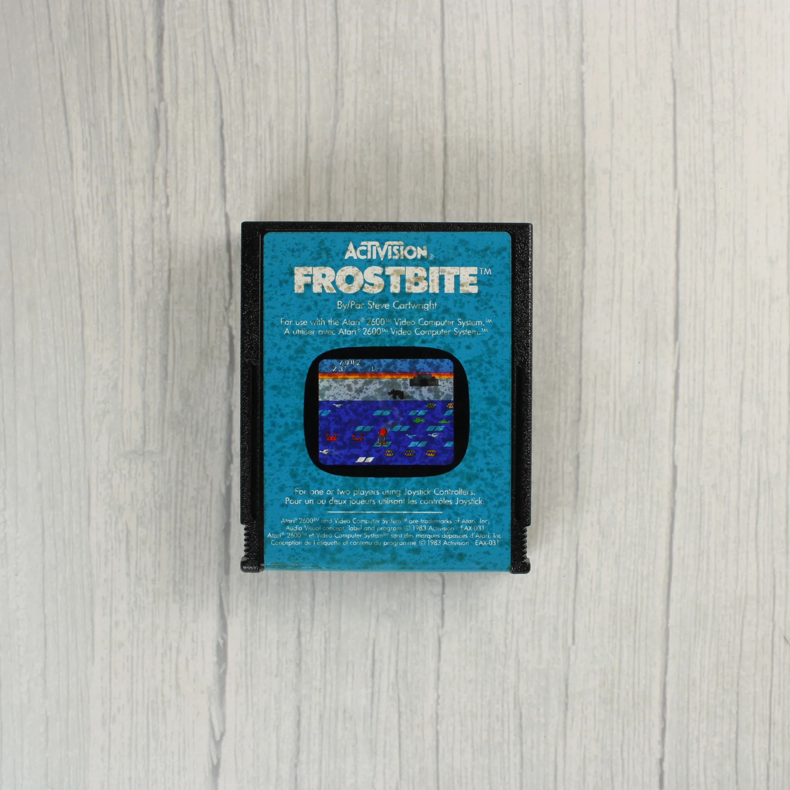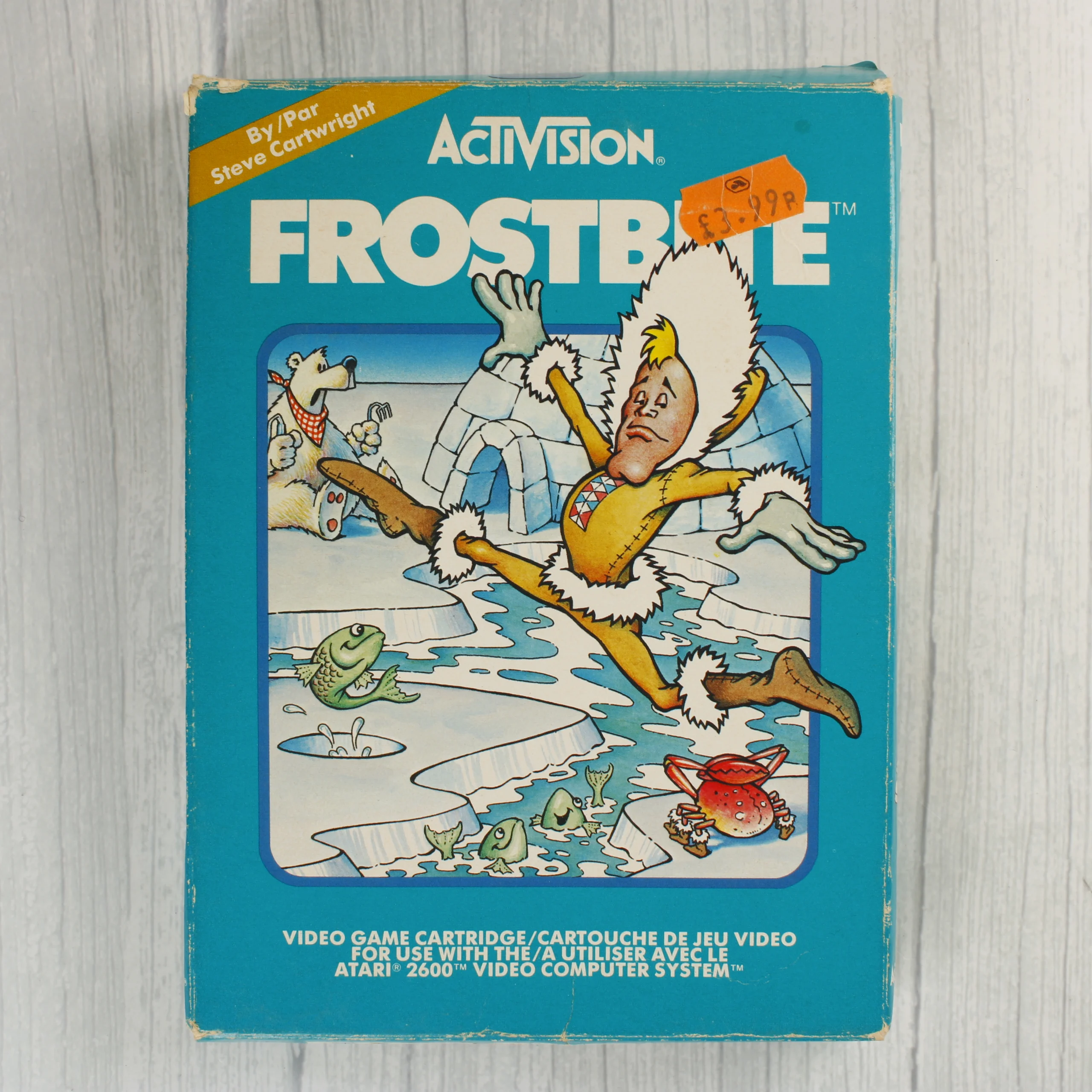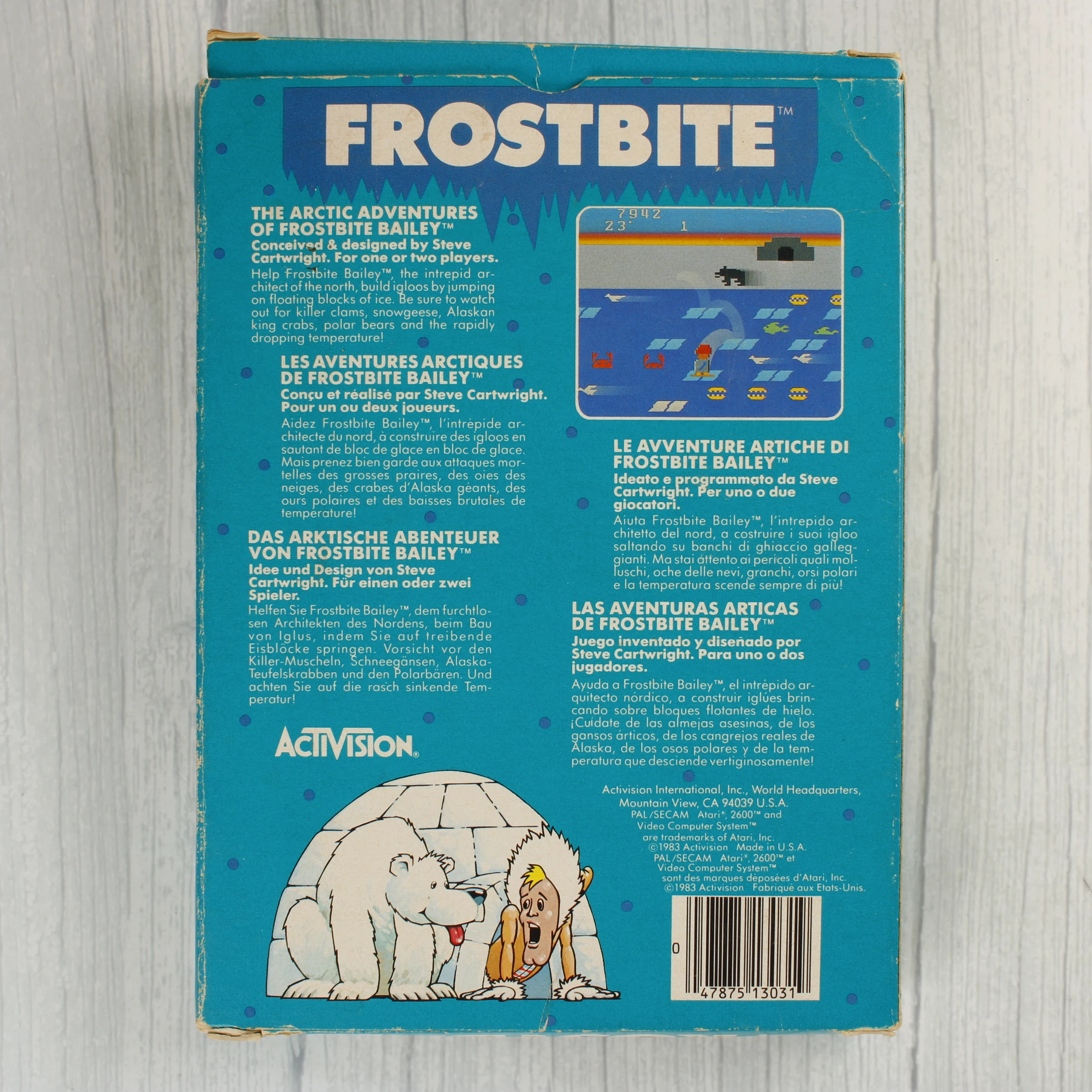 Az Activision által kiadott Frostbite egy klasszikus videójáték Atari 2600 konzolhoz. A csomag tartalmazza az eredeti kartondobozt és a fekete műanyag házas cartridge-et. A doboz előlapján színes illusztráció látható egy eszkimóról, jegesmedvéről és különféle tengeri élőlényekről jégtáblák között. A doboz hátoldalán többnyelvű leírás és egy képernyőkép található a játékról. A cartridge címkéje kék színű, rajta a játék címe, a fejlesztő neve és egy kis illusztráció szerepel. A dobozon egy narancssárga árcédula maradványa látható a jobb felső sarokban. A csomagolás élei mentén kopások és kisebb benyomódások figyelhetők meg, különösen a sarkoknál.