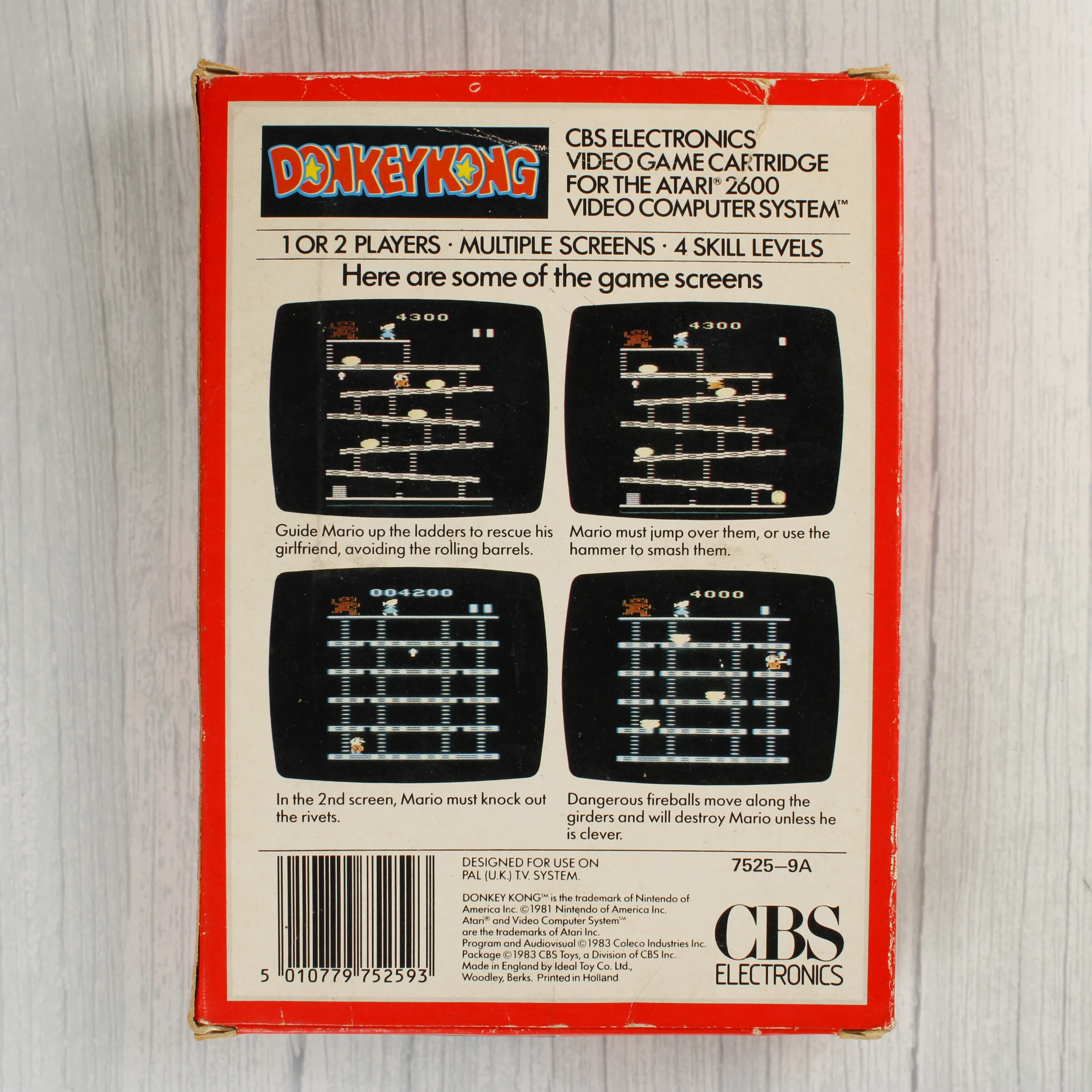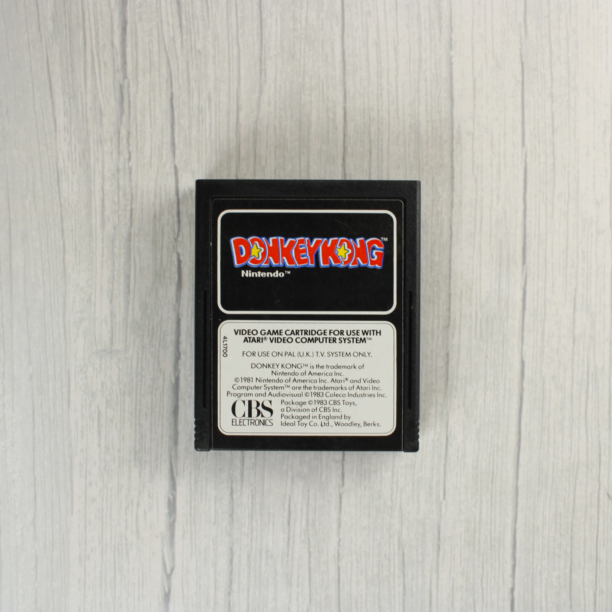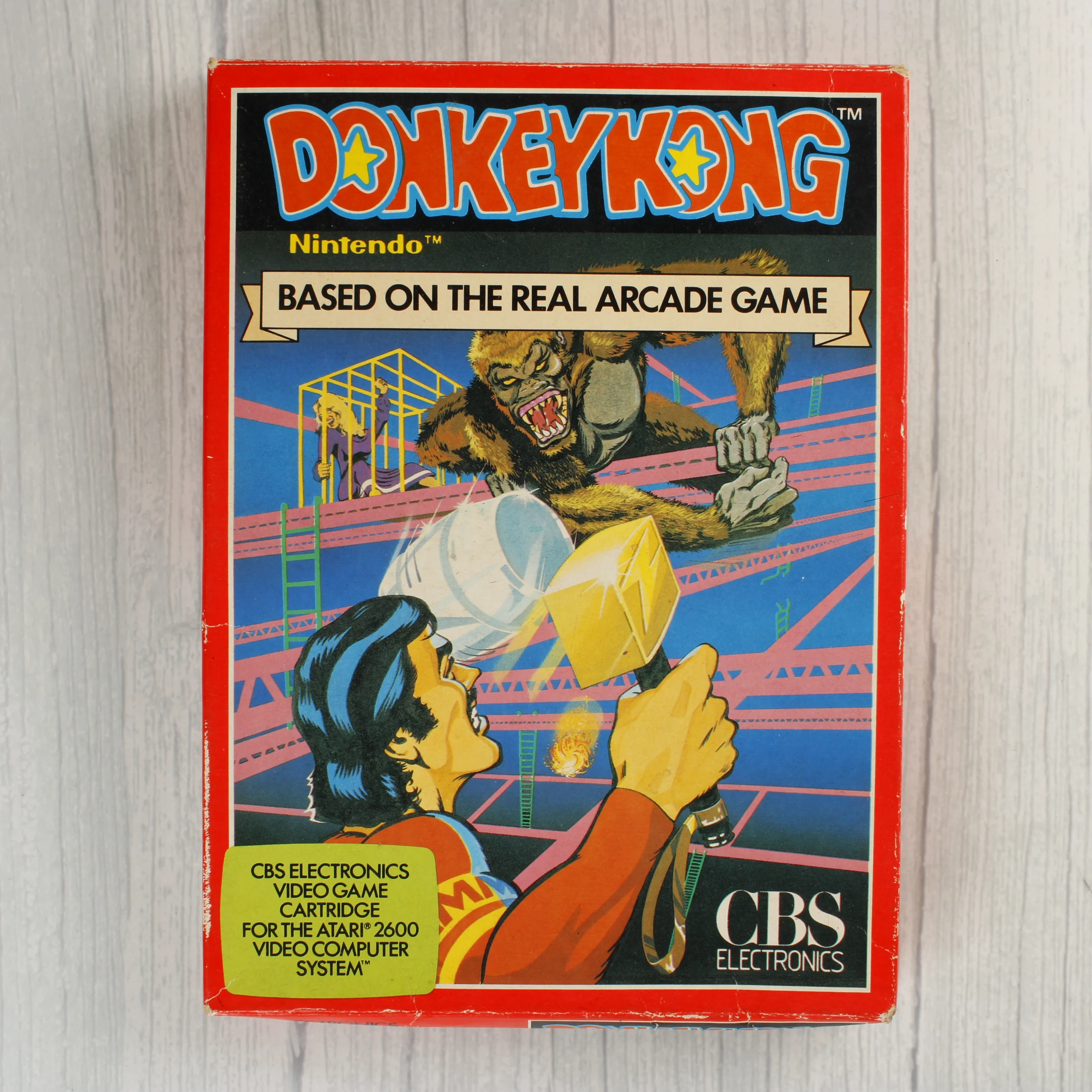 A Donkey Kong videójáték Atari 2600 konzolhoz készült kiadása, eredeti kartondobozban és fekete műanyag cartridge formátumban. A CBS Electronics által gondozott csomagolás előlapján színes illusztráció látható, amelyen Mario egy kalapáccsal néz szembe a hordókat dobáló Donkey Konggal. A doboz hátoldalán négy képernyőkép mutatja be a játékmenetet, valamint angol nyelvű leírás olvasható a szintekről. A cartridge címkéje fekete alapon fehér szöveggel és a színes logóval rendelkezik. A termék PAL rendszerű televíziókhoz készült. A doboz élei mentén látható kopások és kisebb benyomódások jelzik a korábbi használatot.