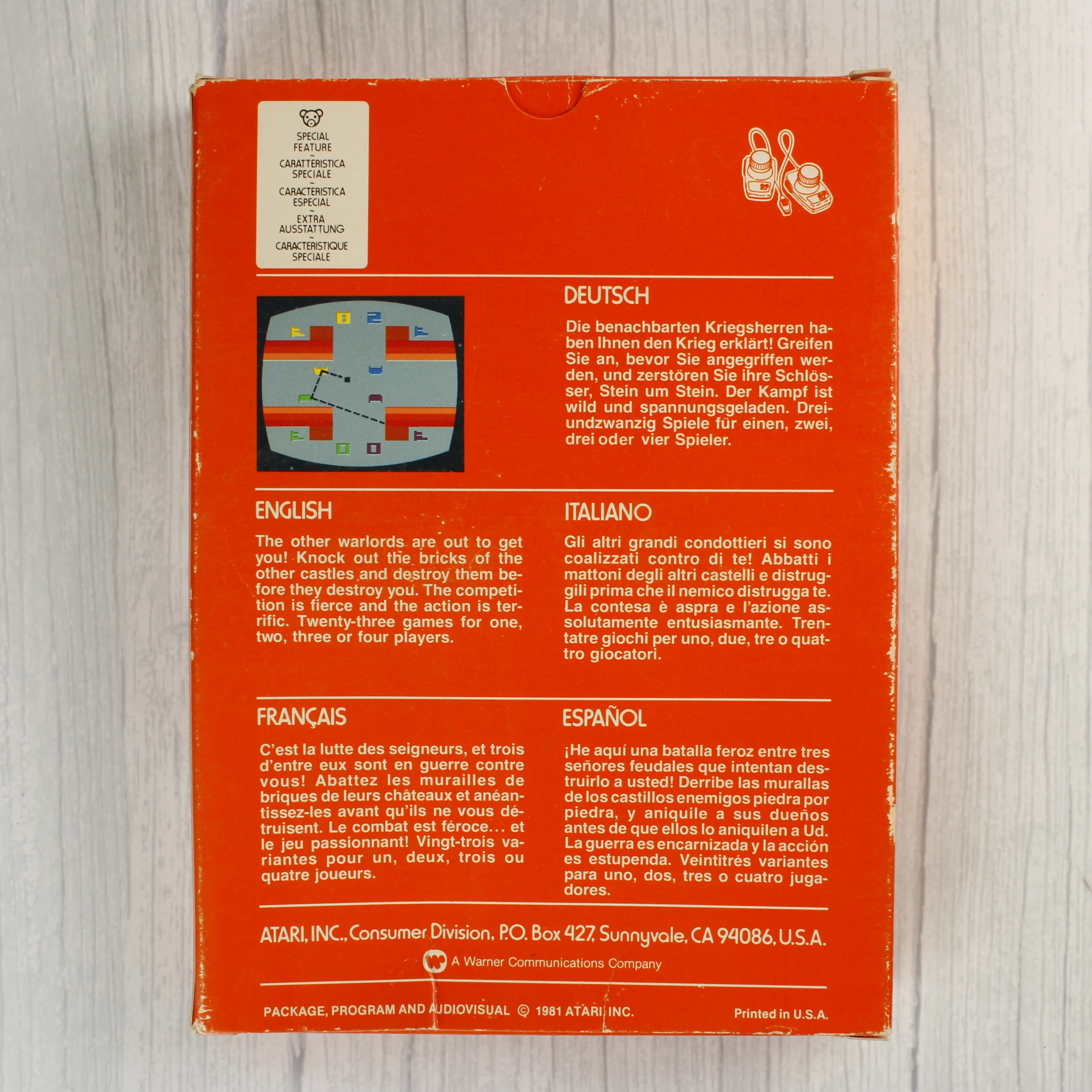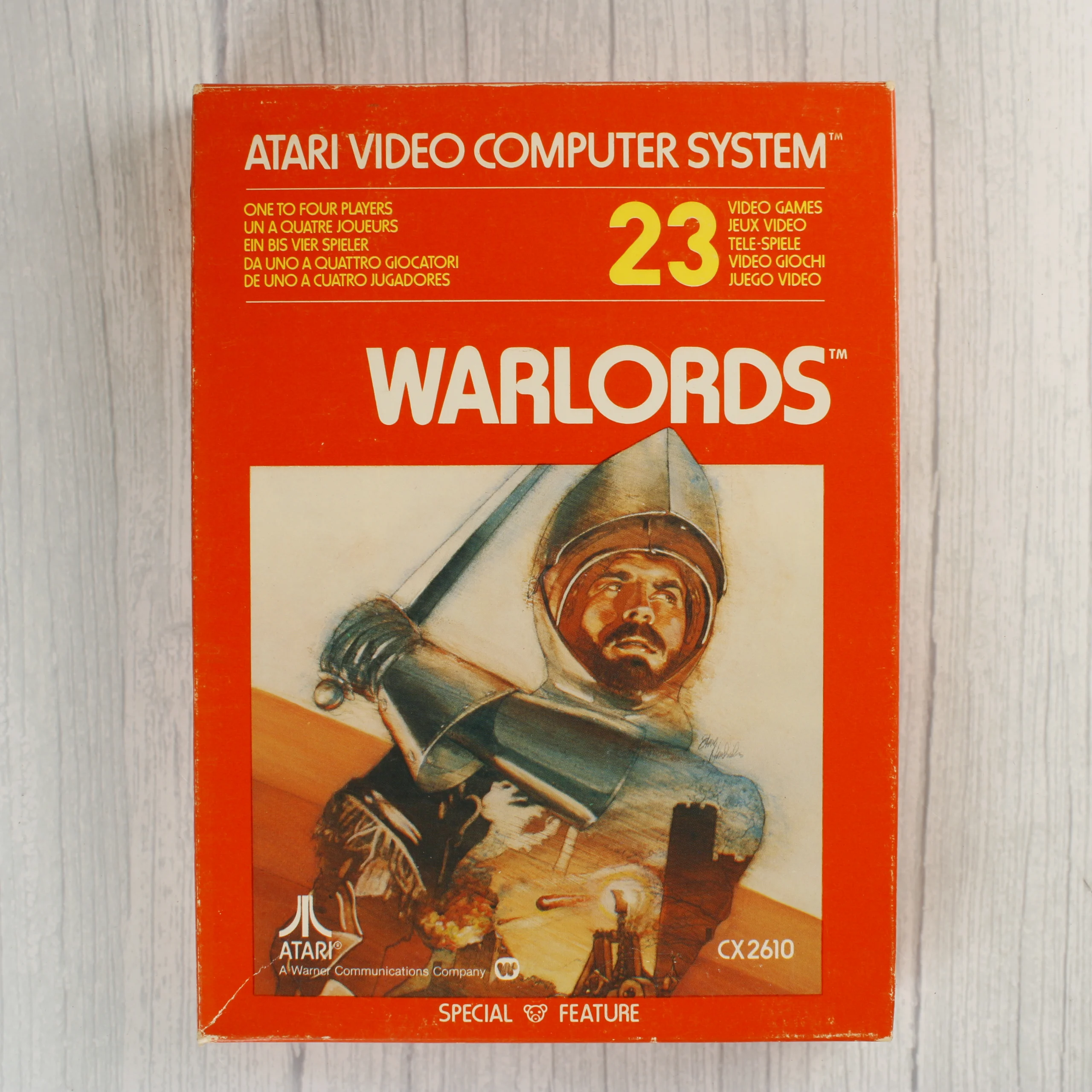 Az Atari 2600 konzolhoz készült Warlords videójáték eredeti kartondobozos kiadása. A csomag tartalmazza a fekete műanyag házas cartridge-et és a színes illusztrációval ellátott papírdobozt. A doboz előlapján egy páncélos lovag látható, felette a Warlords felirat és a 23-as szám, amely a játékvariációk számára utal. A hátoldalon többnyelvű leírás és egy képernyőkép található a játékról. A cartridge címkéje megegyezik a doboz grafikájával, és jelzi, hogy a játékhoz paddle kontroller szükséges. A termék az 1981-es kiadásból származik, a CX2610-es modellszámot viseli. A doboz élei mentén látható némi kopás, de a grafika és a szövegek jól olvashatóak maradnak.
