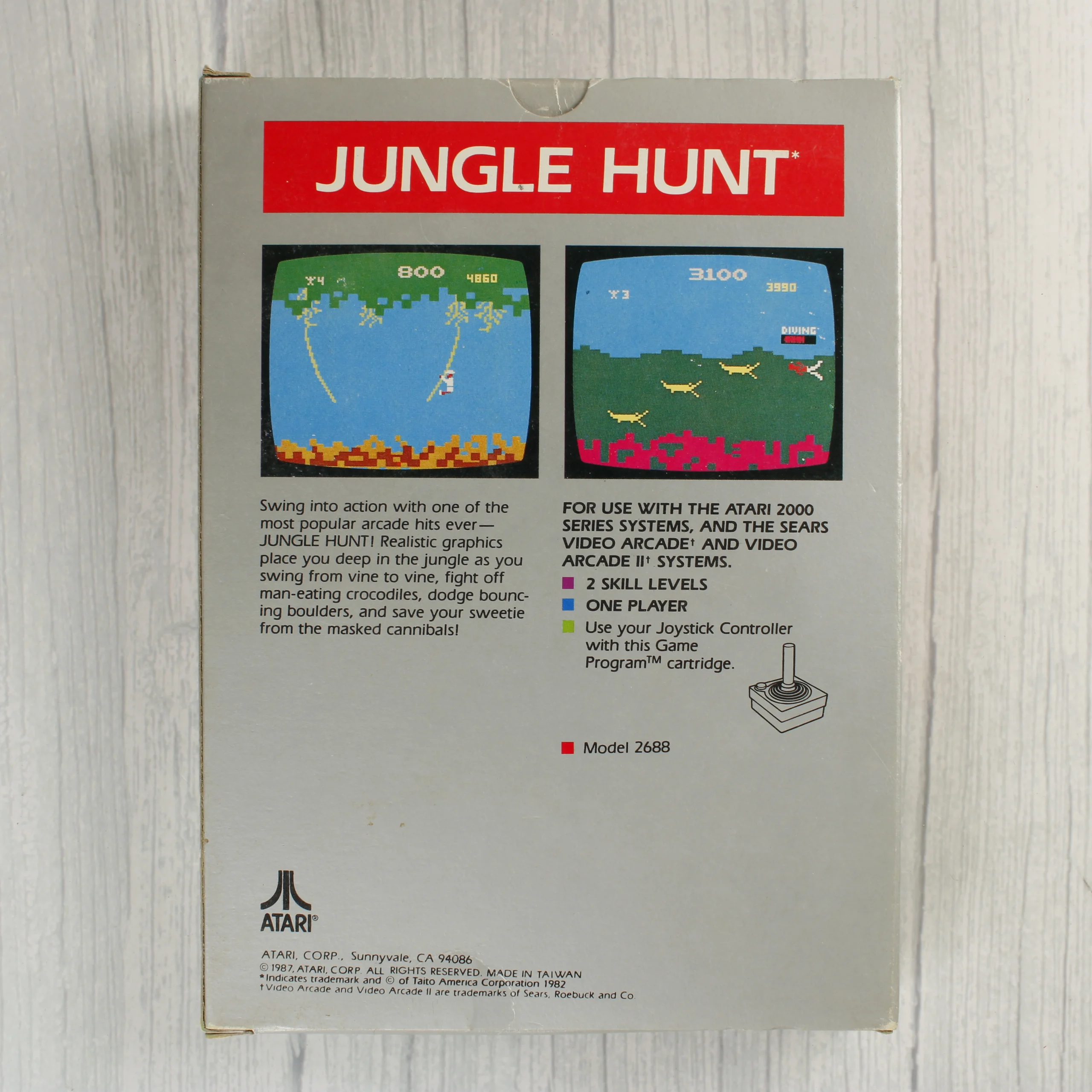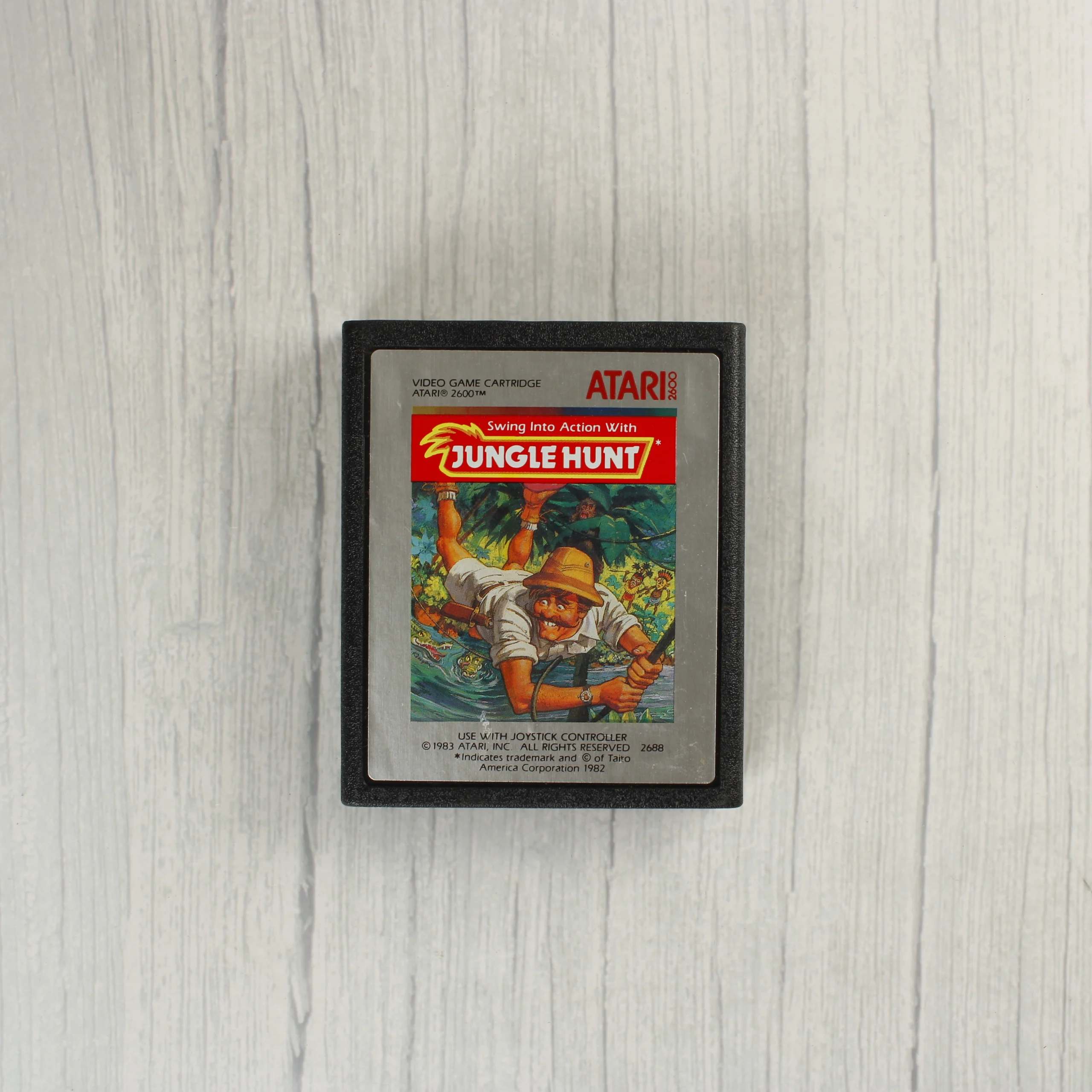 Az Atari 2600 konzolhoz készült Jungle Hunt videójáték eredeti dobozos kiadása. A csomag tartalmazza a színes illusztrációval ellátott kartondobozt és a fekete műanyag házas szoftvermodult. A doboz előlapján egy dzsungelben indán lengő kalandor látható, felette a piros Atari 2600 logóval. A hátoldalon két játékmenet-kép, valamint angol nyelvű leírás és technikai adatok szerepelnek. A cartridge címkéje megegyezik a doboz grafikájával, ezüstszínű kerettel és jól olvasható feliratokkal rendelkezik. A termék az 1980-as évek végéről származó, Tajvanon gyártott változat.