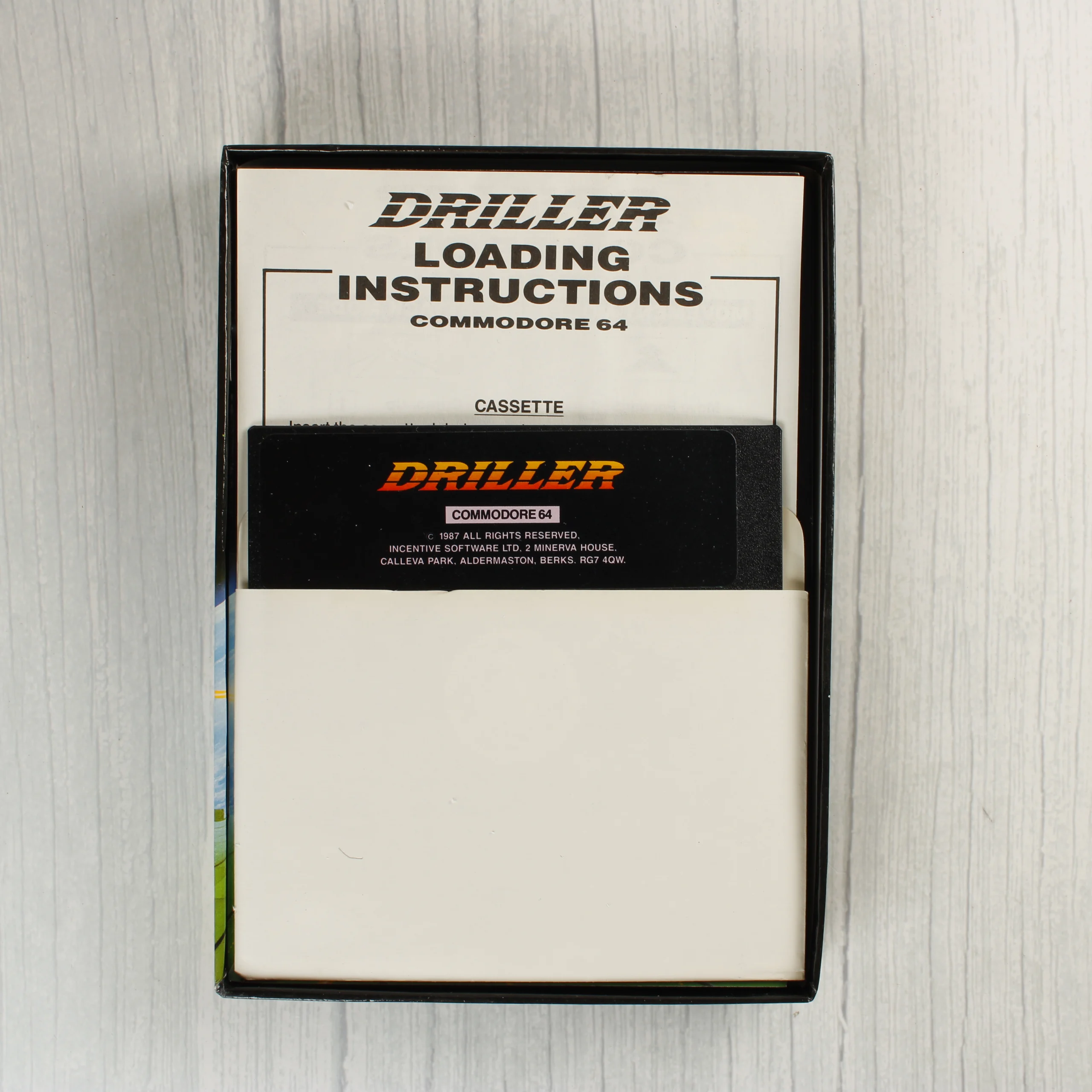 A Driller című videójáték Commodore 64 platformra készült kiadása, eredeti kartondobozos csomagolásban. A doboz elején színes illusztráció látható, amely egy futurisztikus űrhajót és egy piramis alakú építményt ábrázol az űrben. A csomag tartalmaz egy 5,25 colos floppy lemezt fehér papírtokban, egy nyomtatott használati útmutatót, valamint egy összehajtható, színes kartonból készült háromdimenziós térképmodellt. A doboz hátoldalán képernyőképek és angol nyelvű leírás olvasható a játékról. A termék az Incentive Software gondozásában jelent meg 1987-ben. A csomagolás és a tartozékok állapota megkímélt, a doboz élei mentén minimális kopás tapasztalható.