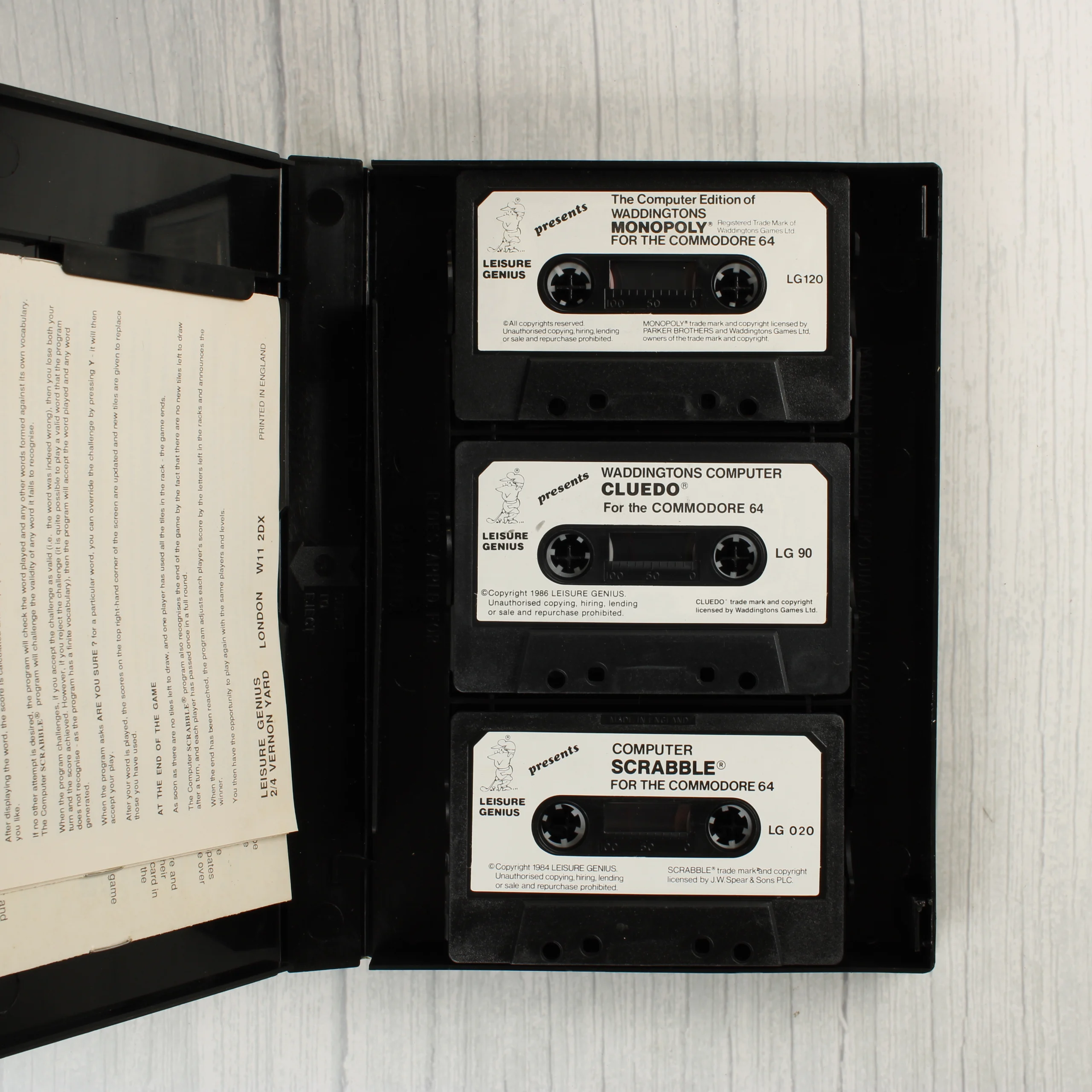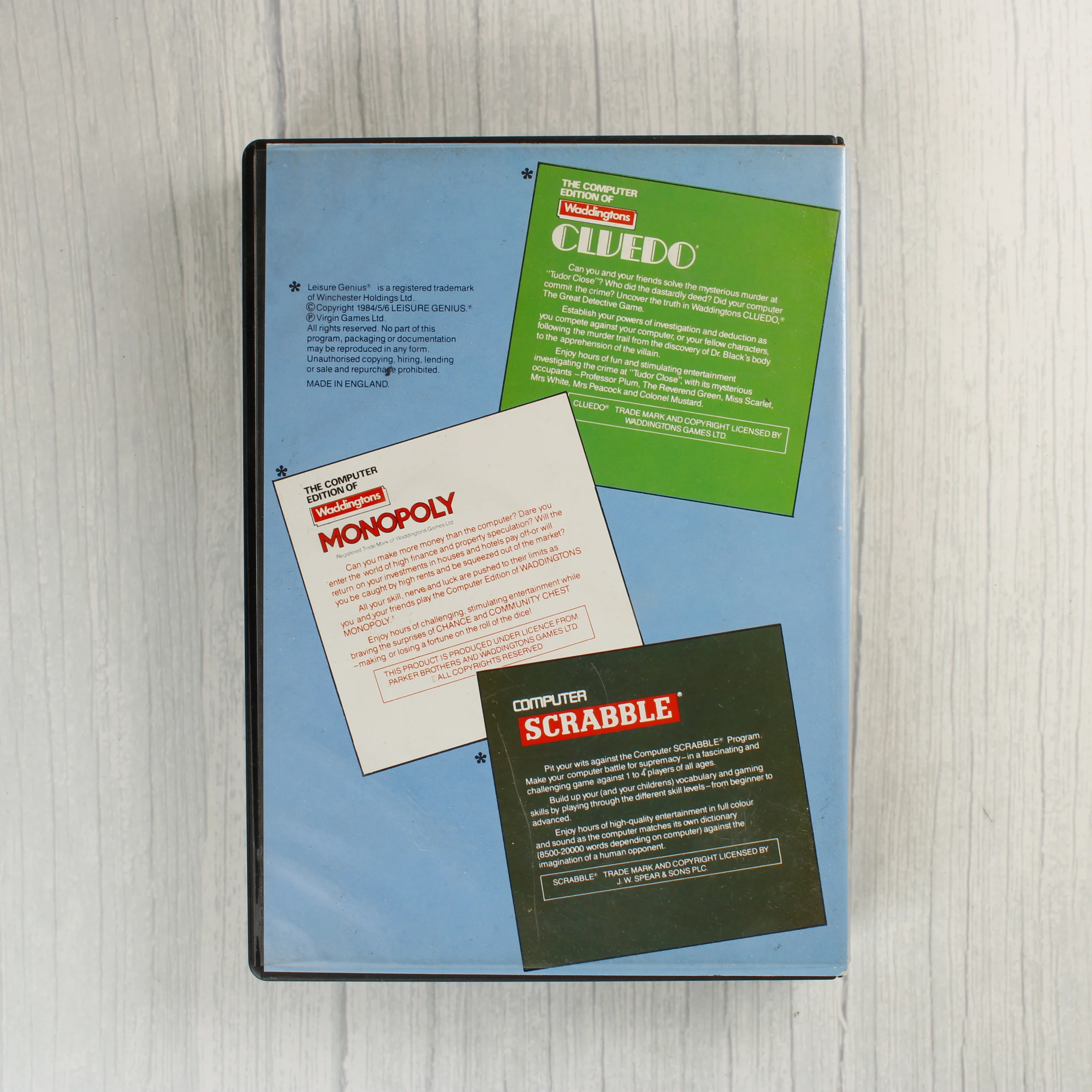 Leisure Genius társasjáték-gyűjtemény Commodore 64-re. Tartalmazza a Cluedo, Monopoly és Scrabble játékokat három kazettán, eredeti műanyag tokban.
