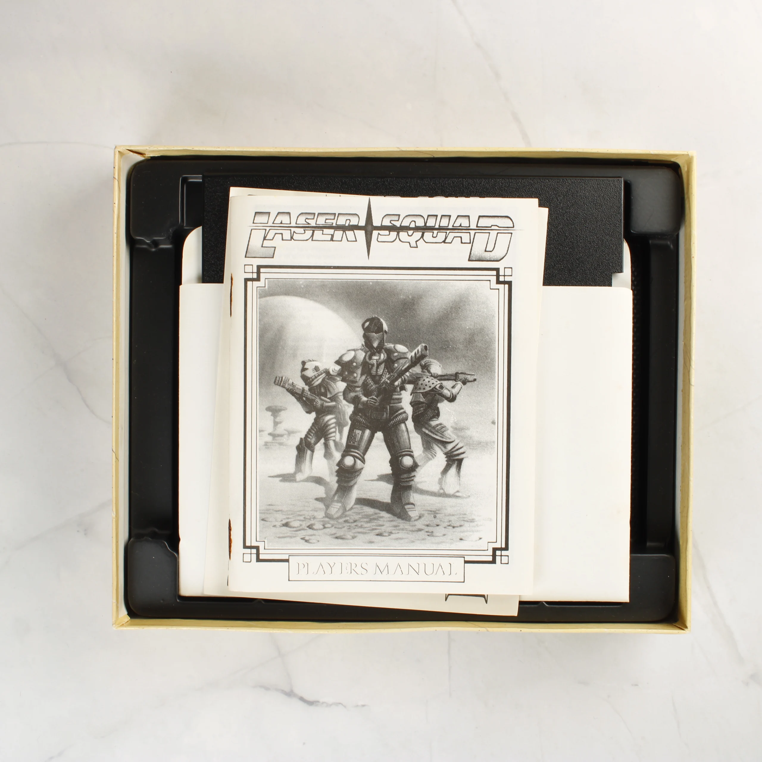 A Laser Squad című videójáték Commodore 64/128 platformra kiadott, dobozos változata. A csomag tartalmazza az eredeti színes illusztrációval ellátott kartondobozt, egy 5,25 colos floppy lemezt fehér papírtokban, valamint a fekete-fehér nyomású használati útmutatót. A doboz elején három páncélozott alak látható futurisztikus fegyverekkel, a hátoldalon pedig játékmenet-fotók és angol nyelvű leírás olvasható. A szoftvert a Blade Software adta ki 1988-ban. A belső fekete műanyag tálca rögzíti a hordozót és a dokumentációt.