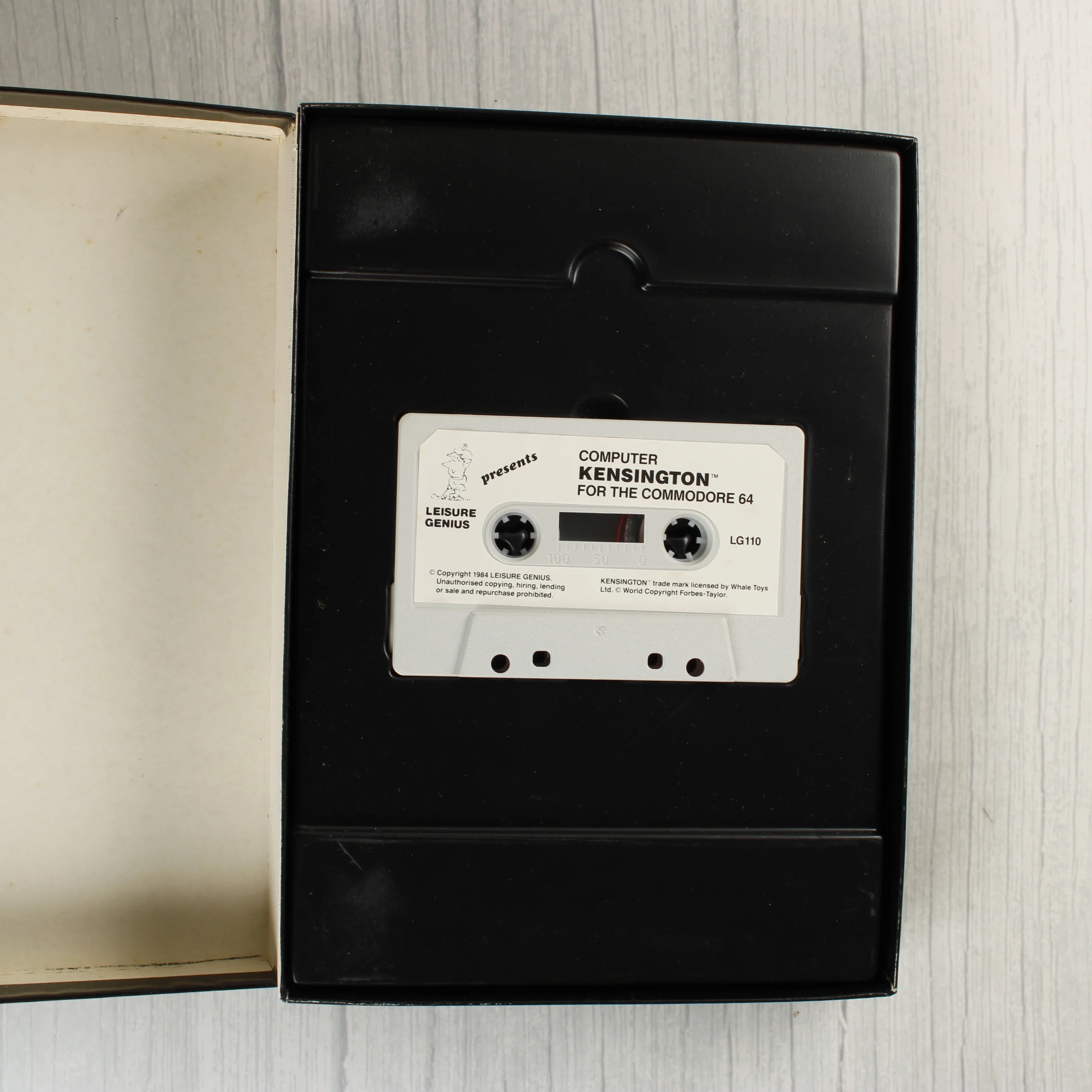 A Leisure Genius által kiadott Computer Kensington egy stratégiai videójáték Commodore 64 platformra. A termék egy fekete kartondobozban érkezik, amelynek elején színes hatszögekből álló grafika látható. A csomag tartalmazza az eredeti mágnesszalagos kazettát, amely egy fekete műanyag tálcában helyezkedik el a dobozon belül. A kazetta fehér címkével rendelkezik, amelyen a játék címe és a kiadó logója szerepel. A doboz hátoldalán angol nyelvű leírás olvasható a játékmenetről, valamint a gyártási adatok, miszerint a termék Angliában készült 1984-ben. A csomagoláson látható egy fehér árcímke vagy azonosító matrica is. A doboz élei mentén enyhe kopás tapasztalható, de a szerkezete ép.