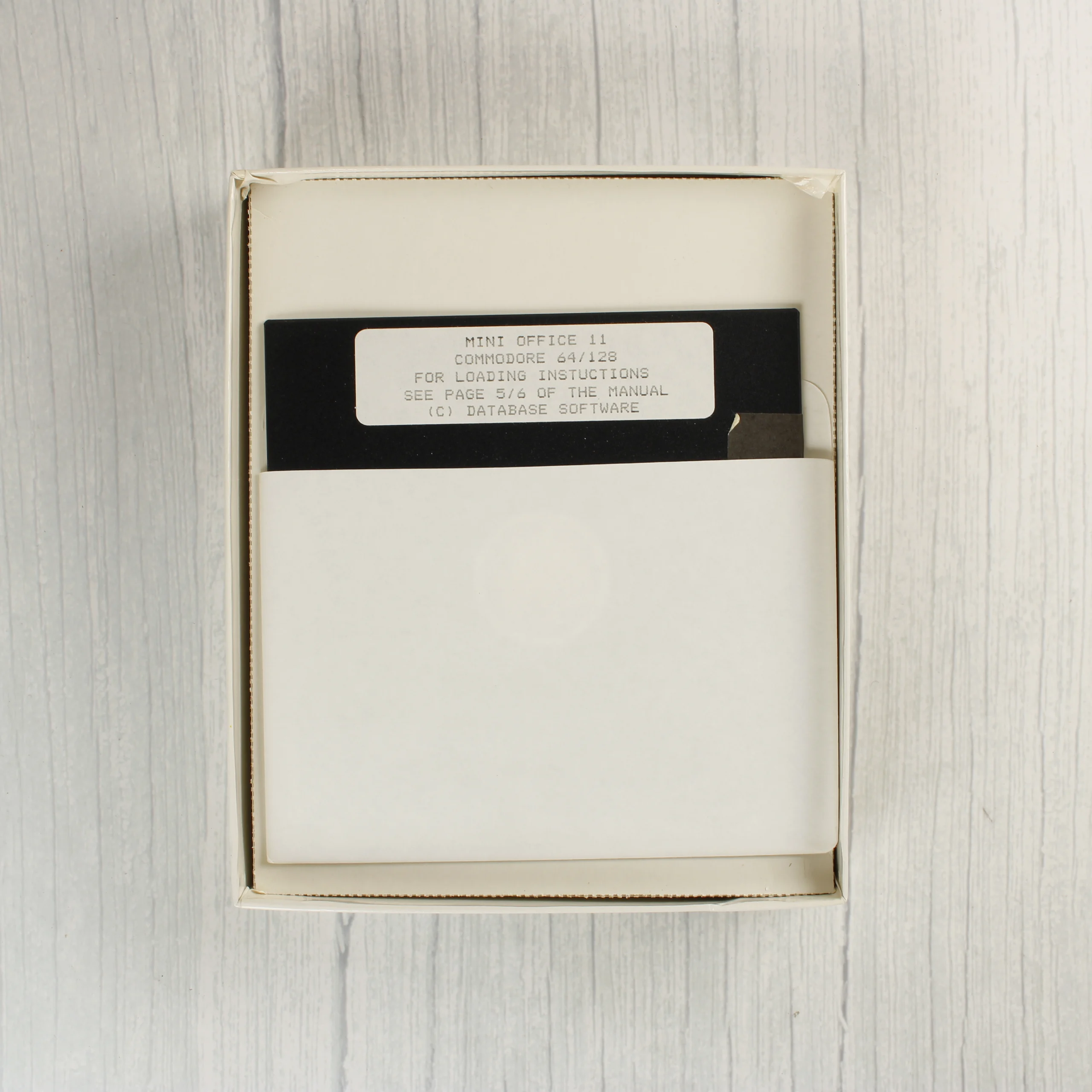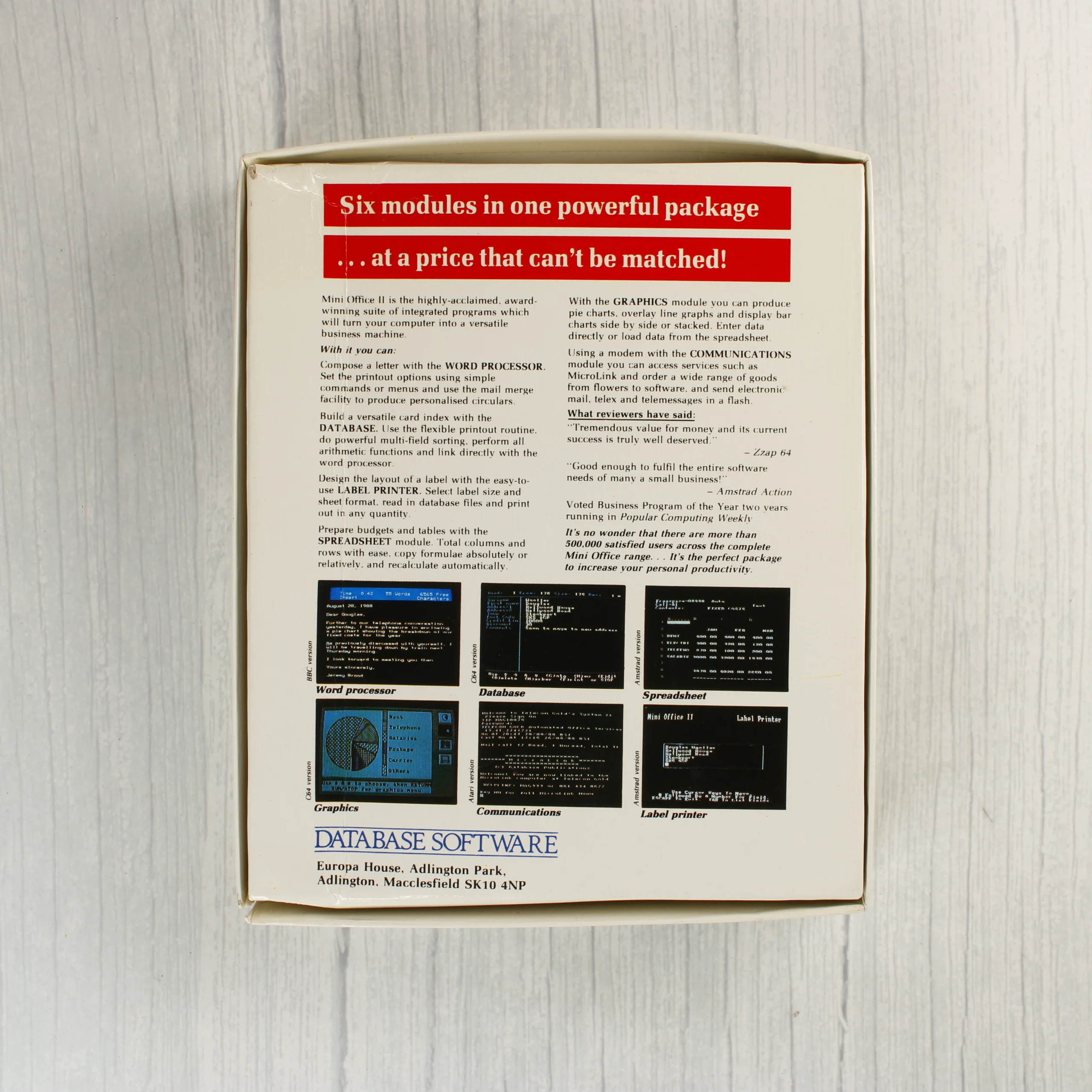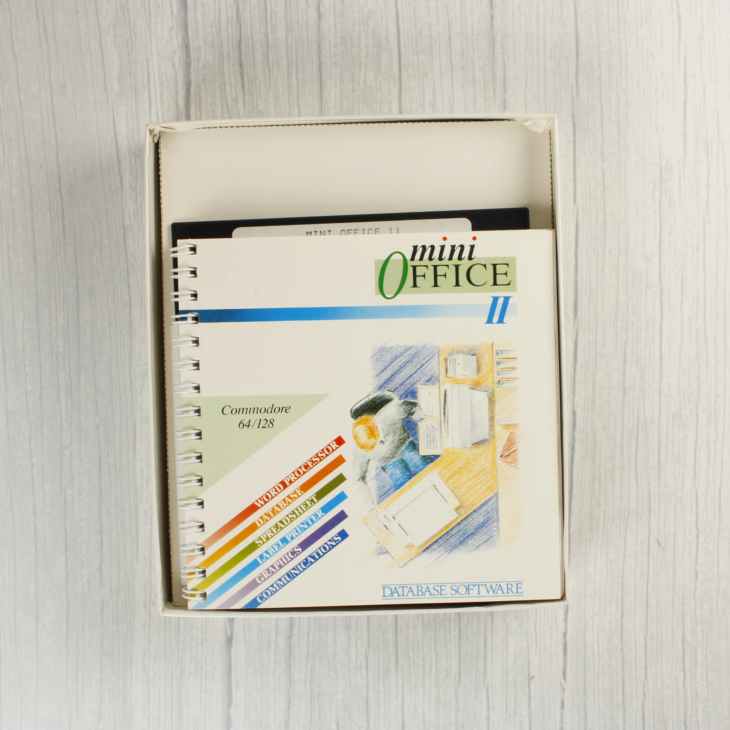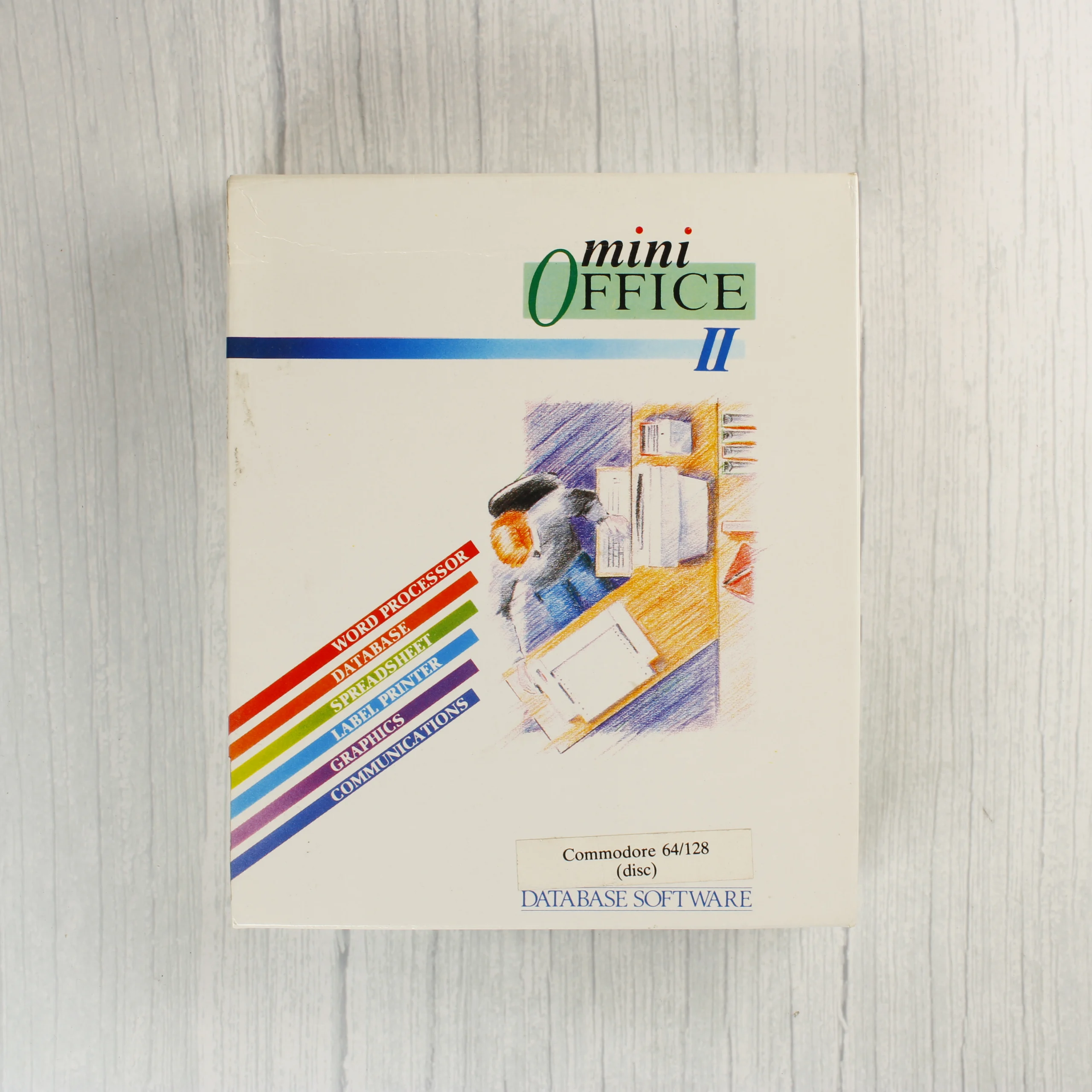 A Mini Office II szoftvercsomag Commodore 64 és 128 számítógépekhez. A fehér kartondobozos kiadás tartalmaz egy 5,25 colos floppy lemezt papírtokban, valamint egy spirálkötésű használati útmutatót. A doboz elején színes illusztráció látható egy számítógép előtt ülő alakról, mellette a program fő funkciói (szövegszerkesztő, adatbázis, táblázatkezelő, címkenyomtató, grafika és kommunikáció) színes sávokkal jelölve. A hátoldalon részletes angol nyelvű leírás és képernyőmentések találhatók a modulokról. A kiadvány a Database Software gondozásában jelent meg. A csomagoláson látható feliratok szerint a szoftver hat integrált irodai alkalmazást tartalmaz egyetlen csomagban.