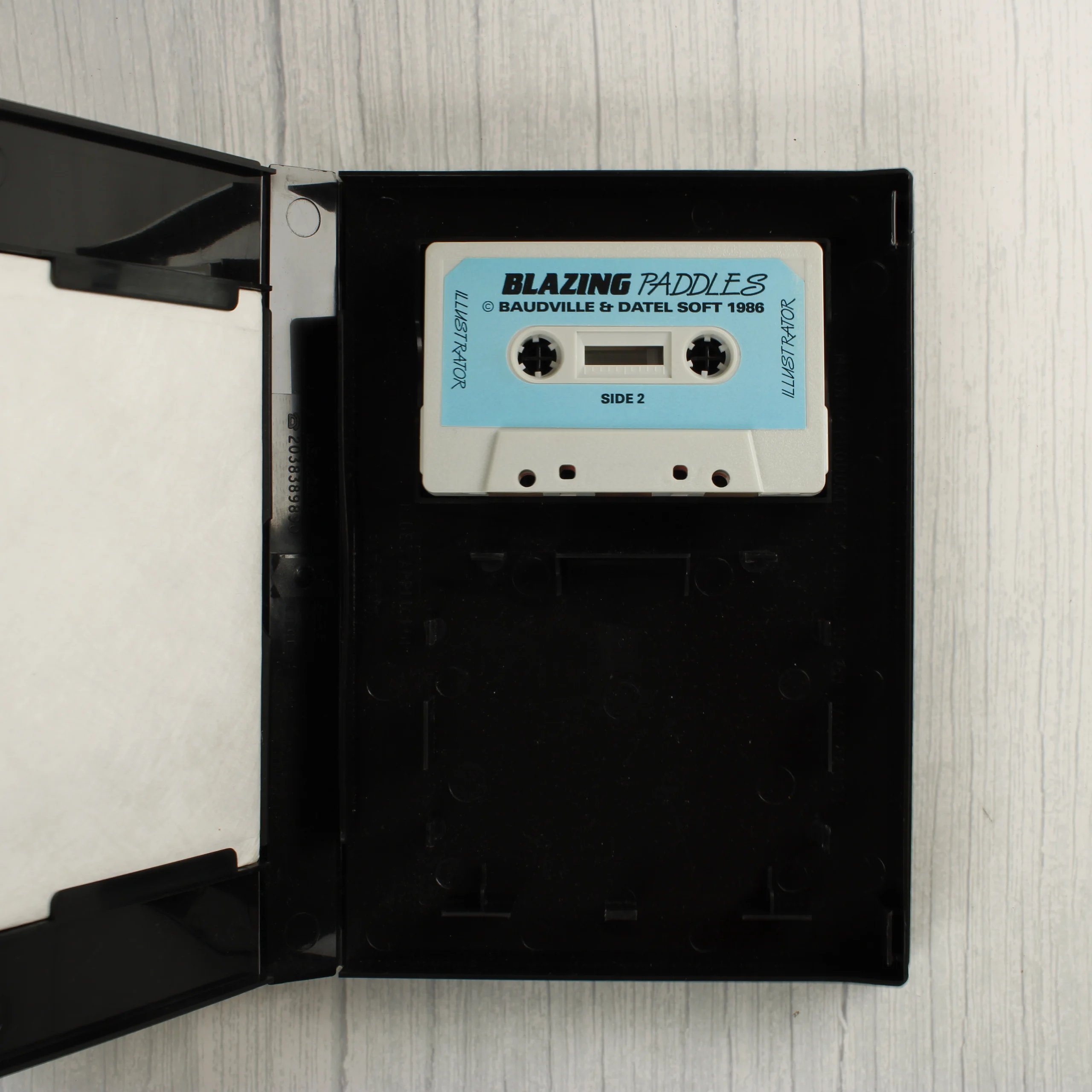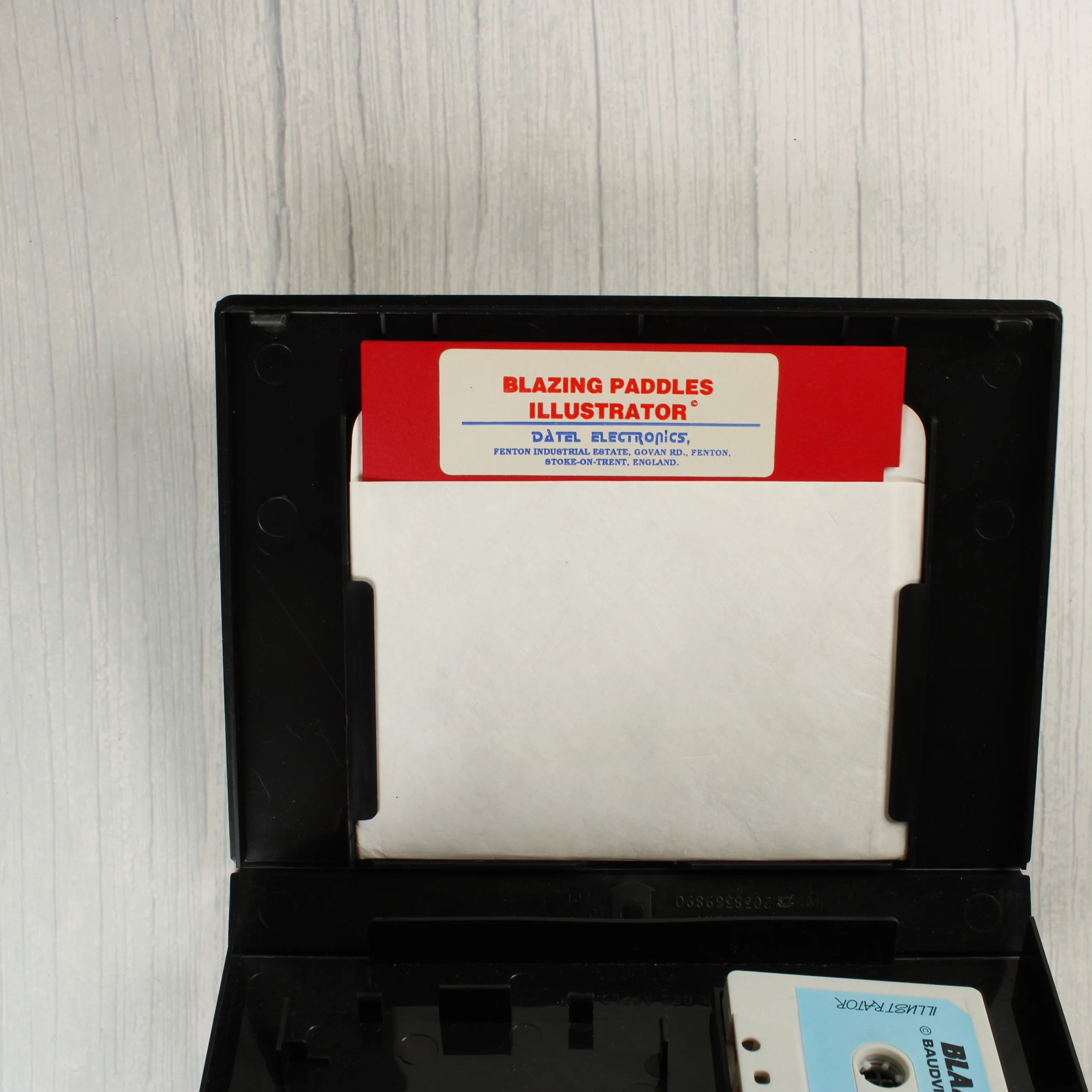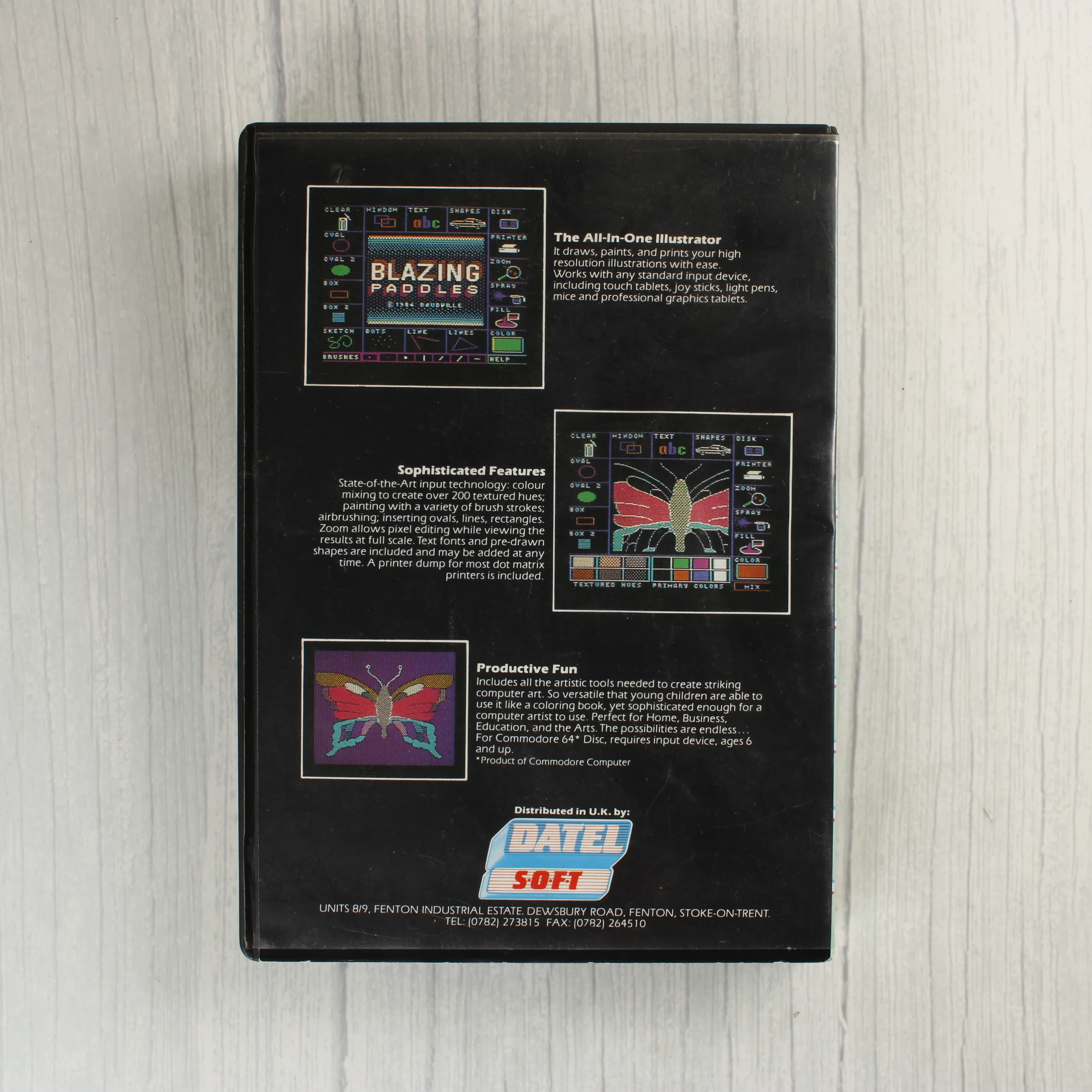A Blazing Paddles Illustrator egy grafikai szoftver Commodore 64 számítógéphez, amelyet a Datel Soft adott ki. A csomag egy fekete műanyag tokban található, amely tartalmaz egy magnókazettát és egy 5,25 colos floppy lemezt is. A borítón egy illusztráció látható, amely egy kezet ábrázol rajzeszközzel, mellette egy botkormánnyal és egy palettával. A hátoldalon képernyőmentések és angol nyelvű leírás olvasható a program funkcióiról, például a színkeverésről és a különböző beviteli eszközök támogatásáról. A kazetta fehér házas, kék címkével, a floppy lemez pedig piros védőborítóban, fehér papírtokban helyezkedik el. A tok és a hordozók állapota megkímélt, a feliratok tisztán olvashatóak.
