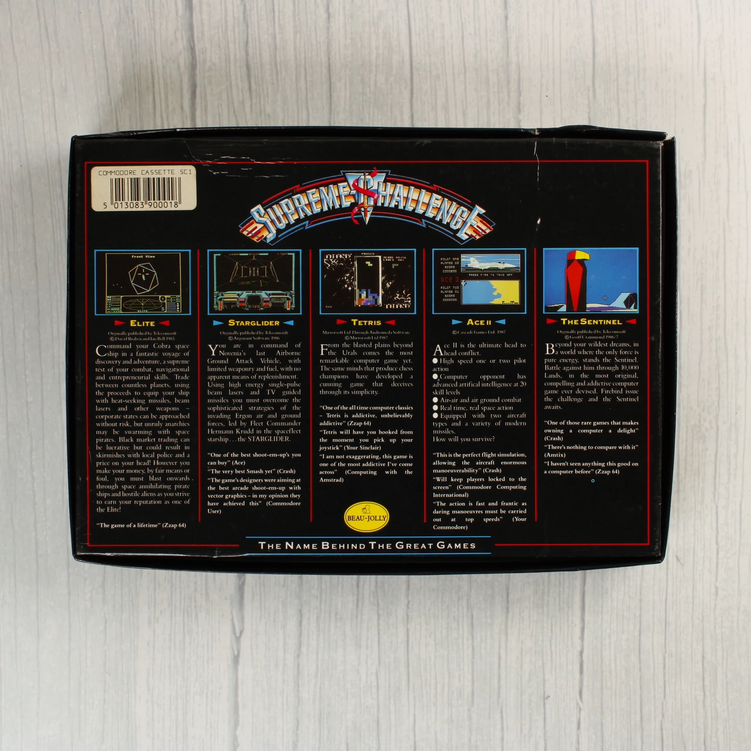A Supreme Challenge: The Ultimate Pack egy videójáték-válogatás Commodore 64 platformra. A csomag öt klasszikus játékot tartalmaz: Elite, Starglider, Tetris, Ace II és The Sentinel. A termék egy nagyméretű, színes kartondobozban érkezik, amelyen a játékok illusztrációi láthatók. A doboz belsejében egy fekete műanyag tálcában két darab fekete színű magnókazetta található, amelyeken a szoftverek tárolódnak. A kazetták fehér címkével rendelkeznek, amelyeken a Beau-Jolly logó és a játékok listája olvasható. A doboz hátoldalán részletes leírások és képernyőmentések találhatók az egyes játékokról, valamint egy vonalkód és a kiadó adatai.