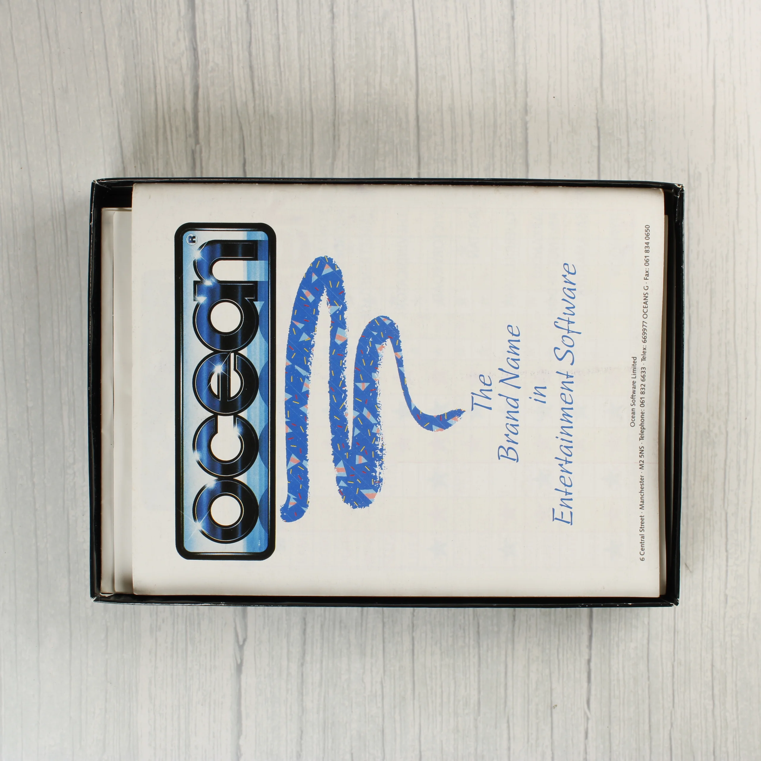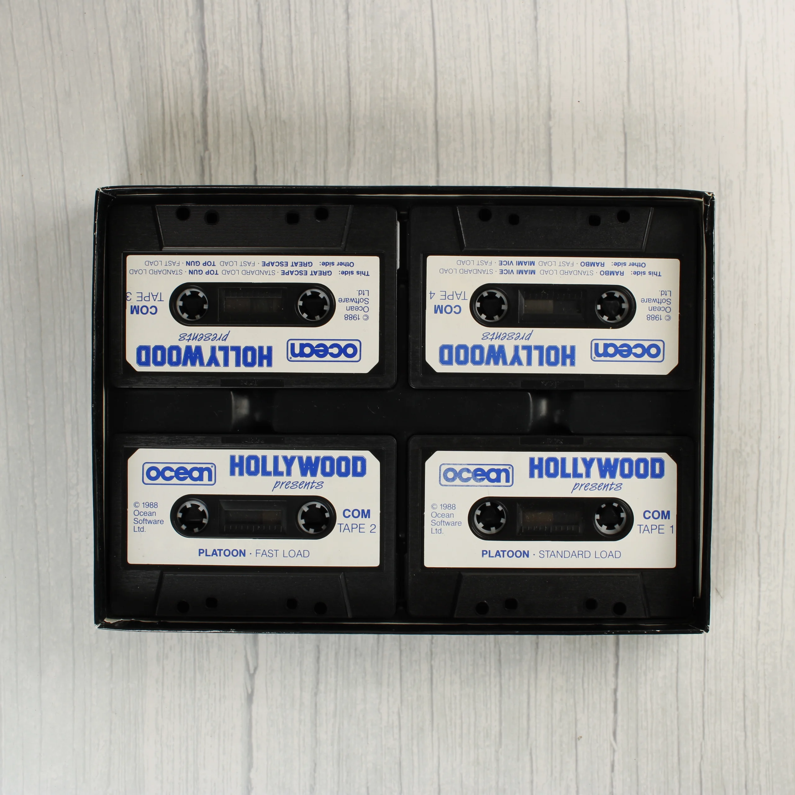 Az Ocean Software által kiadott Hollywood gyűjtemény Commodore 64 platformra. A csomag öt klasszikus videójátékot tartalmaz: Miami Vice, Platoon, The Great Escape, Rambo és Top Gun. A készlet négy darab fekete színű, fehér címkés kazettát foglal magában, amelyek egy fekete műanyag tálcában helyezkednek el a kartondobozon belül. A doboz elején színes, illusztrált grafika látható, amely egy autósmozit ábrázol klasszikus amerikai autókkal és pálmafákkal. A csomaghoz tartozik egy eredeti használati útmutató is, amelyen az Ocean logója látható. A kazetták címkéin kék feliratok jelzik a játékok címeit és a betöltési módokat. A doboz élei mentén enyhe kopás és fehéredés tapasztalható, de a grafika ép és jól kivehető.