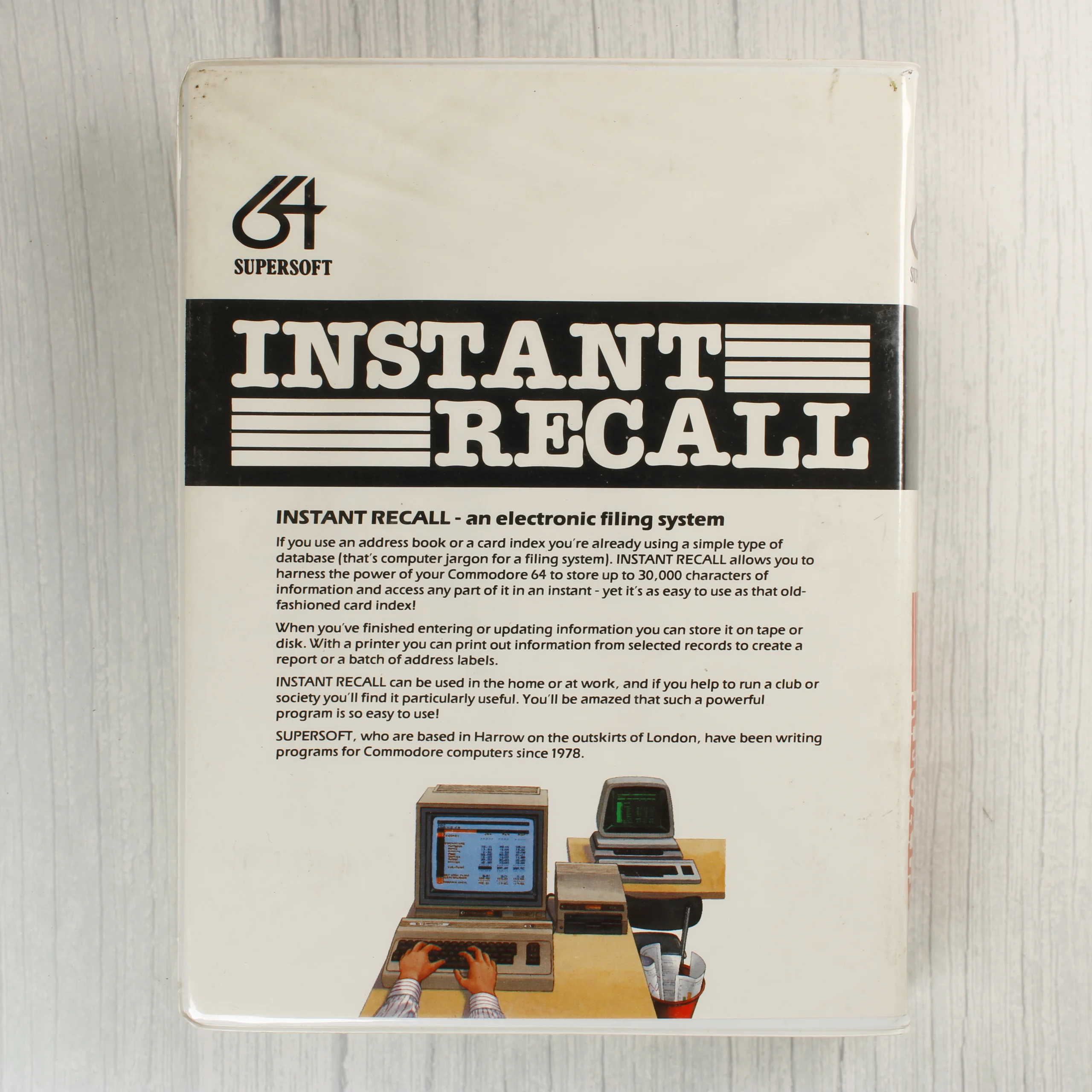 A Supersoft által kiadott Instant Recall egy elektronikus adatnyilvántartó szoftver Commodore 64 számítógéphez. A termék egy fehér színű, műanyag tokban található, amelynek előlapján a szoftver címe és egy iratszekrényt ábrázoló illusztráció látható. A tok belsejében egy fekete színű magnetofonkazetta helyezkedik el, amelyen fehér címke jelzi a program nevét és az 1985-ös kiadási évet. A hátoldalon angol nyelvű leírás olvasható a rendszer funkcióiról, valamint egy korabeli számítógépes konfigurációt bemutató grafika látható. A csomagolás és a hordozófelület a korának megfelelő, megkímélt állapotban van.