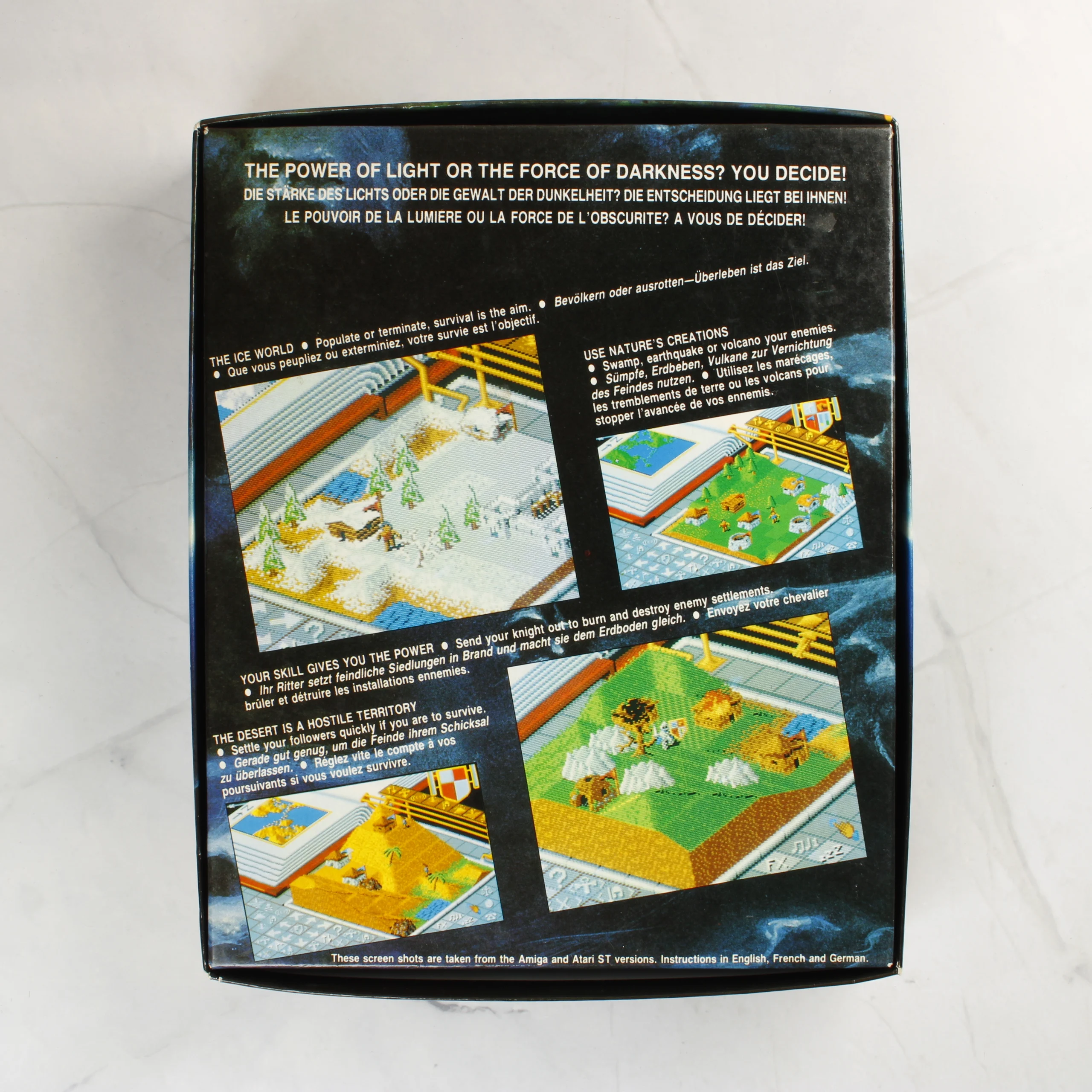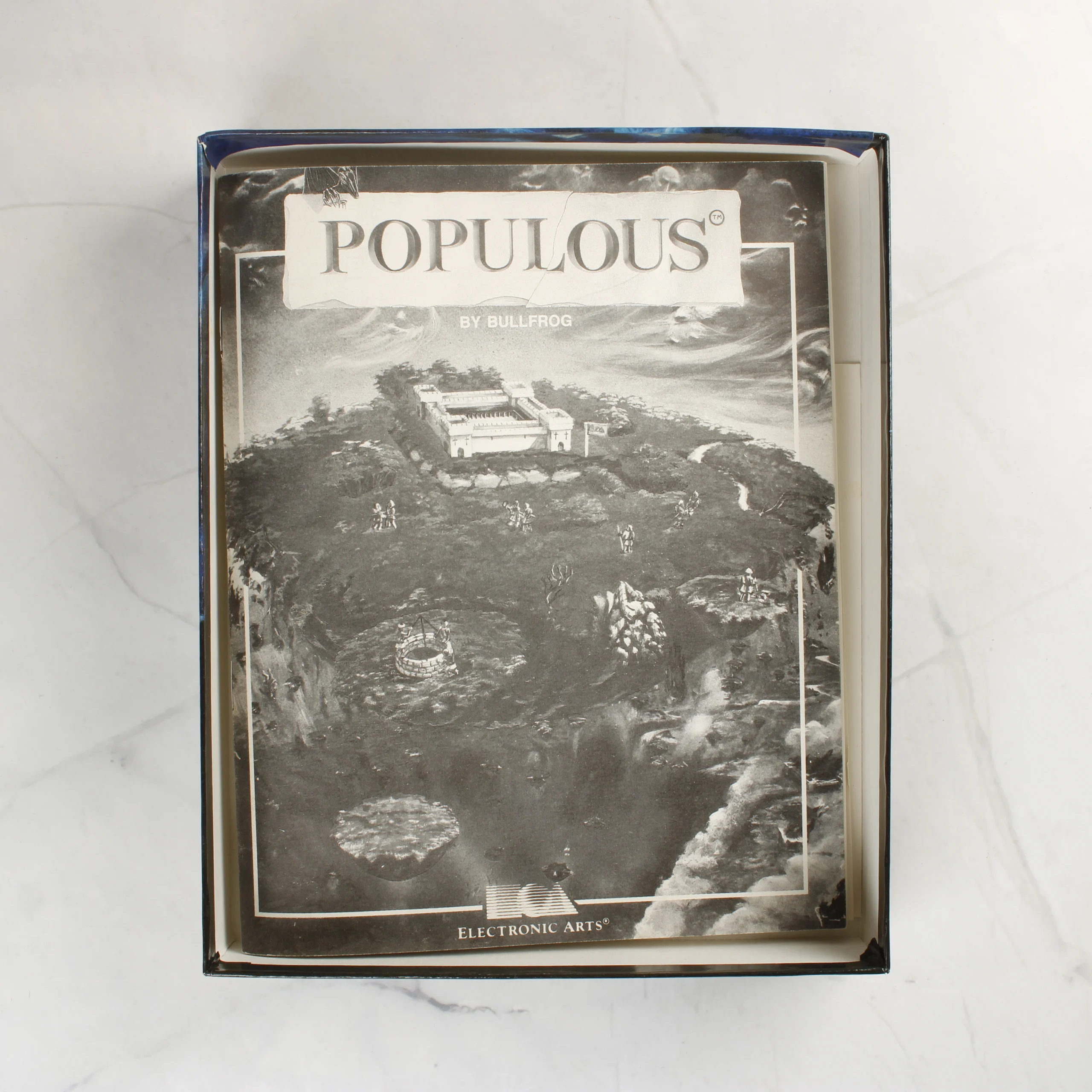 A Populous című videójáték Atari ST verziója, eredeti dobozos kiadásban. A csomag tartalmazza a színes illusztrációval ellátott kartondobozt, a fekete-fehér borítójú használati útmutatót és egy kék színű, 3,5 colos floppy lemezt. A doboz elején a Bullfrog és az Electronic Arts logója látható, a hátoldalon pedig többnyelvű leírás és játékmenet-képek szerepelnek. A floppy lemezen fehér címke található 'Award Winners' felirattal. A kiadvány az 1980-as évek végéről és az 1990-es évek elejéről származó klasszikus stratégiai játékot tartalmazza. A fizikai komponensek koruknak megfelelő állapotban vannak, a papíralapú részeken enyhe használati nyomok látszódhatnak.