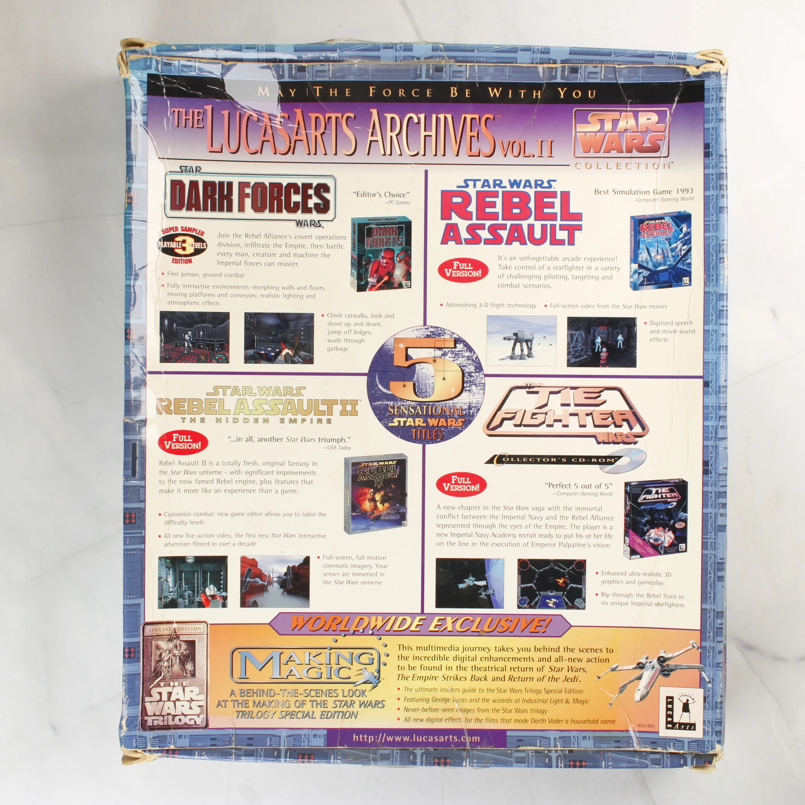 A The LucasArts Archives Vol. II: Star Wars Collection egy nagyméretű, gyűjtői dobozos kiadás PC-re. A csomag öt különböző Star Wars címet tartalmaz, köztük a Rebel Assault, Rebel Assault II, TIE Fighter játékokat, a Dark Forces egy speciális demó változatát, valamint a Making Magic interaktív dokumentumfilmet. A külső kartondoboz elején látványos grafika látható egy rohamosztagossal és különböző űrhajókkal, a hátoldalon pedig részletes leírások és képernyőmentések találhatók a tartalomról. A doboz eleje felnyitható, amely mögött egy átlátszó műanyag ablakon keresztül látható a hat darab CD-ROM lemez, amelyek egyedi grafikával vannak ellátva. A csomagolás anyaga fényes karton, a belső tálca pedig a Halálcsillag folyosóit idéző mintázattal rendelkezik. A kiadvány az 1990-es évek végéről származik, és a LucasArts klasszikus korszakát reprezentálja.