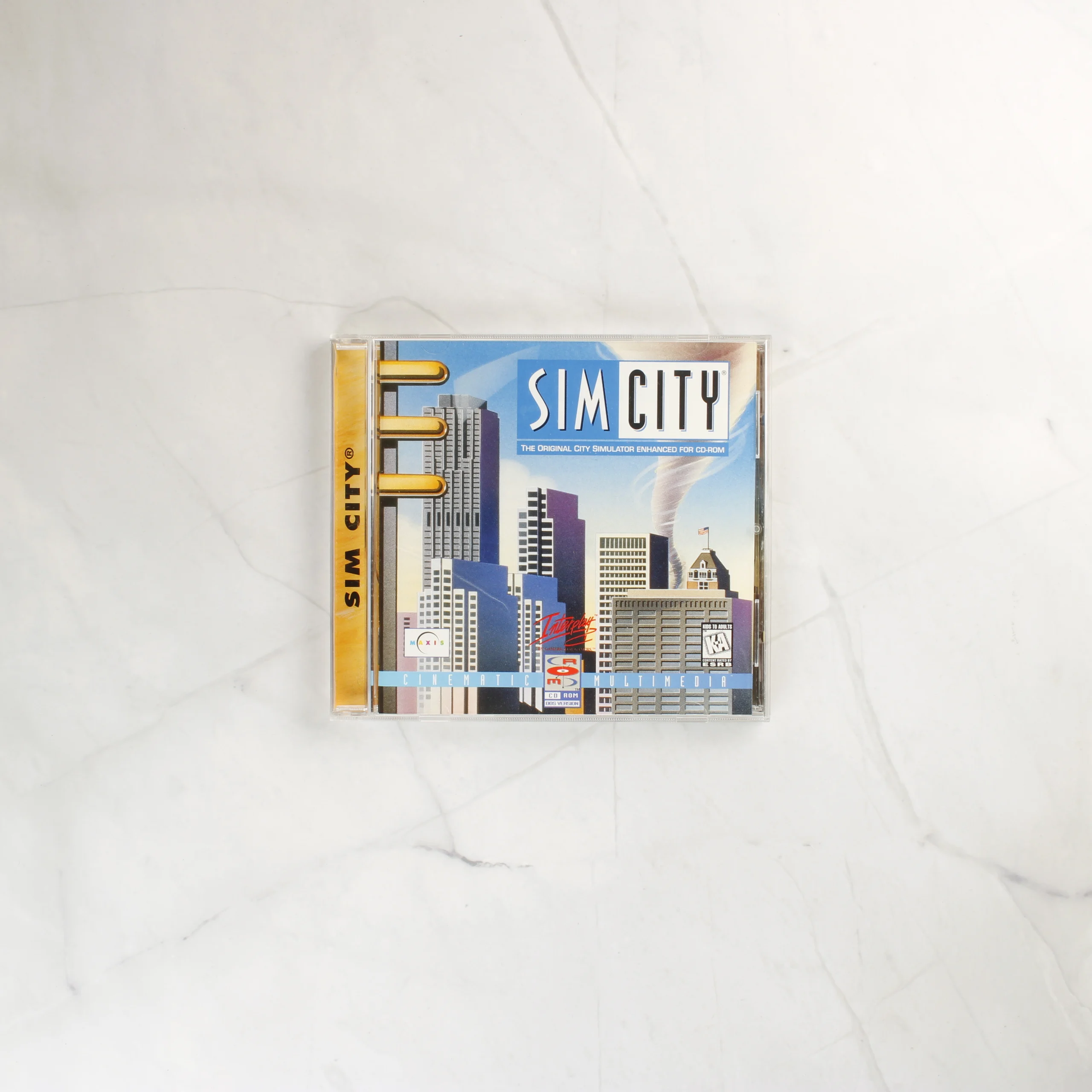 A SimCity videójáték PC-s kiadása, amely egy nagyméretű kartondobozban, normál CD-tokban és a hozzá tartozó CD-ROM lemezen található. A doboz elején a játék címe és egy városi látkép látható, amelyen egy tornádó és felhőkarcolók szerepelnek. A csomagoláson az Interplay és a Maxis logói is feltűnnek. A hátoldalon képernyőmentések és a játék leírása olvasható angol nyelven. A CD-tok átlátszó műanyagból készült, benne egy kék színű, feliratozott lemez látható. A papírdoboz élei mentén enyhe kopás és benyomódás tapasztalható, de a grafika ép és jól olvasható. A belső műanyag tok és a lemez megkímélt állapotúnak tűnik.