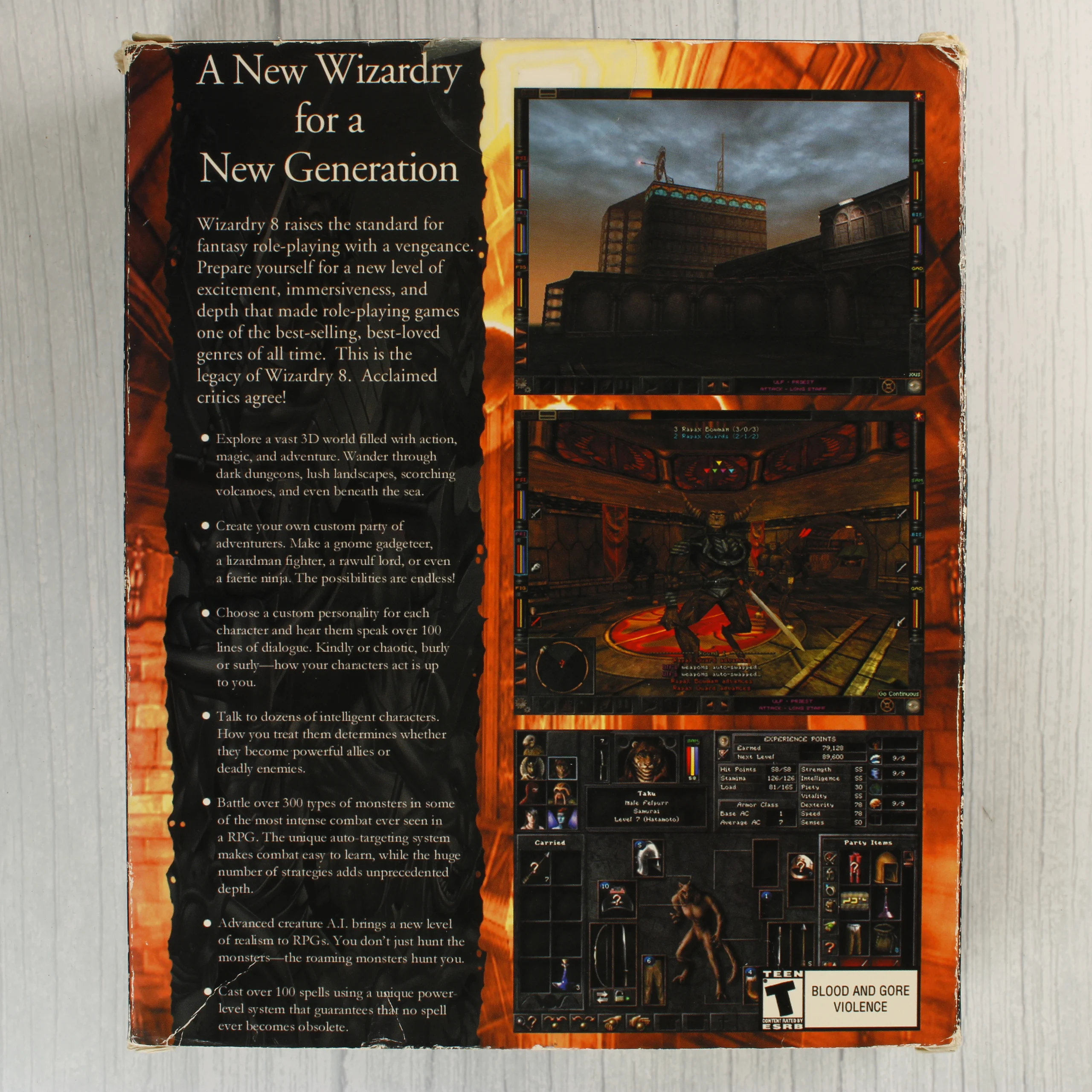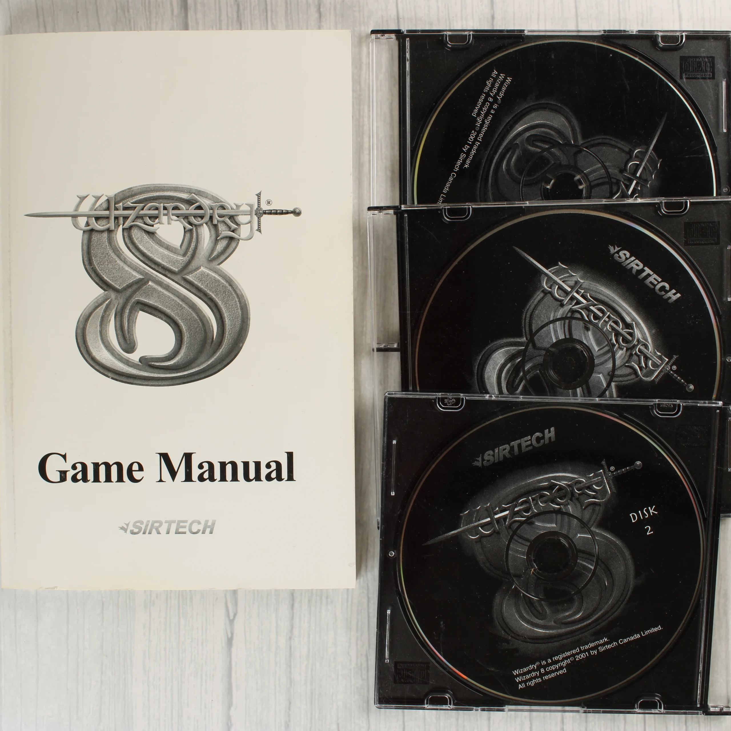 A Wizardry 8 egy klasszikus szerepjáték PC-re, amelynek dobozos kiadása látható a képeken. A csomag tartalmazza az eredeti kartondobozt, egy nyomtatott felhasználói kézikönyvet és három darab CD-lemezt, amelyek különálló, vékony műanyag tokokban helyezkednek el. A doboz elején a Sirtech logója és a játék nagyméretű, fémes hatású logója látható egy karddal átszúrva. A hátoldalon játékmenet-felvételek és angol nyelvű leírás olvasható a funkciókról, valamint az ESRB Teen besorolás is feltüntetésre került. A lemezek fekete alapszínűek, ezüstszürke felirattal és grafikával rendelkeznek. A kézikönyv fehér borítóján szintén a játék logója szerepel. A termék fizikai hordozókon alapuló szoftvergyűjtemény.