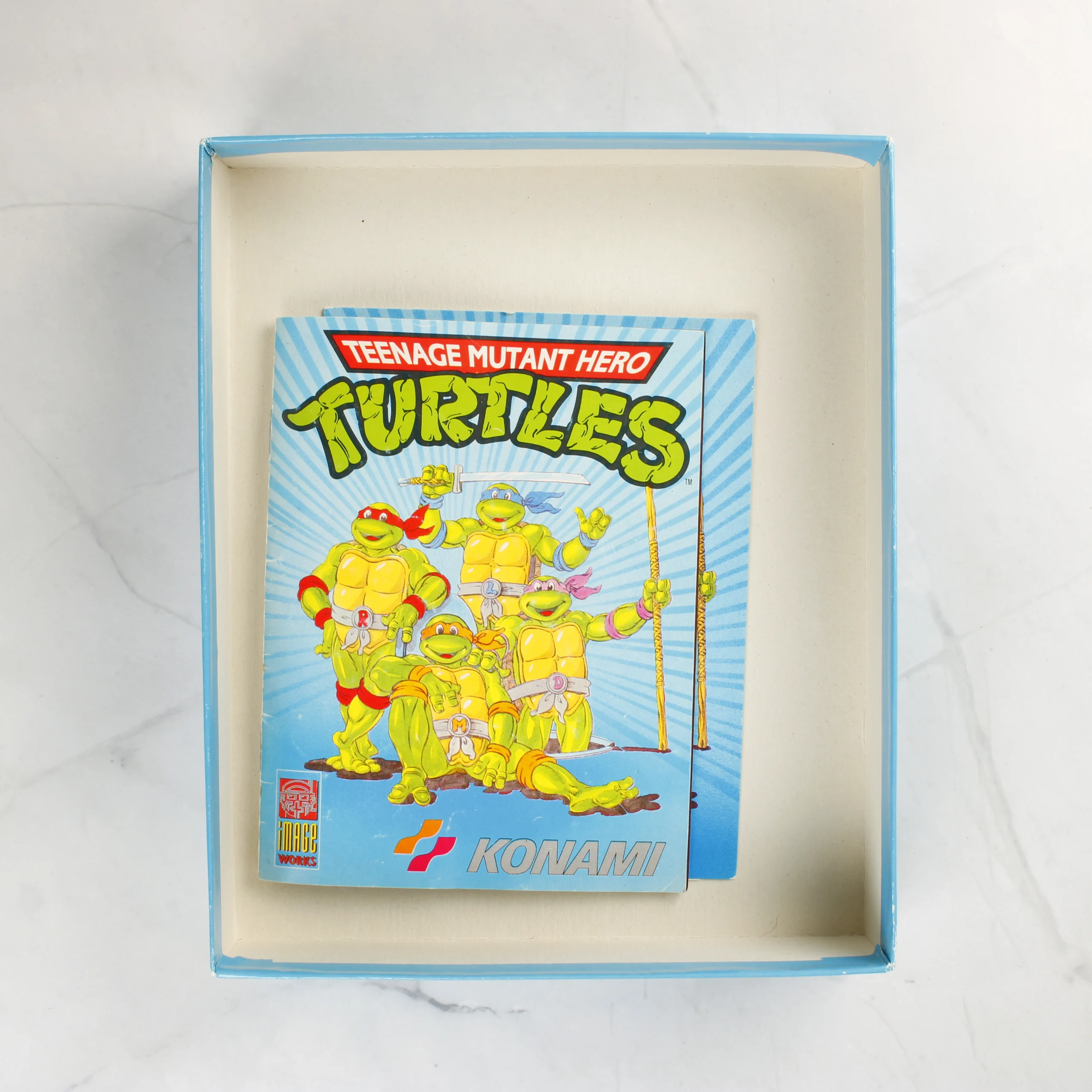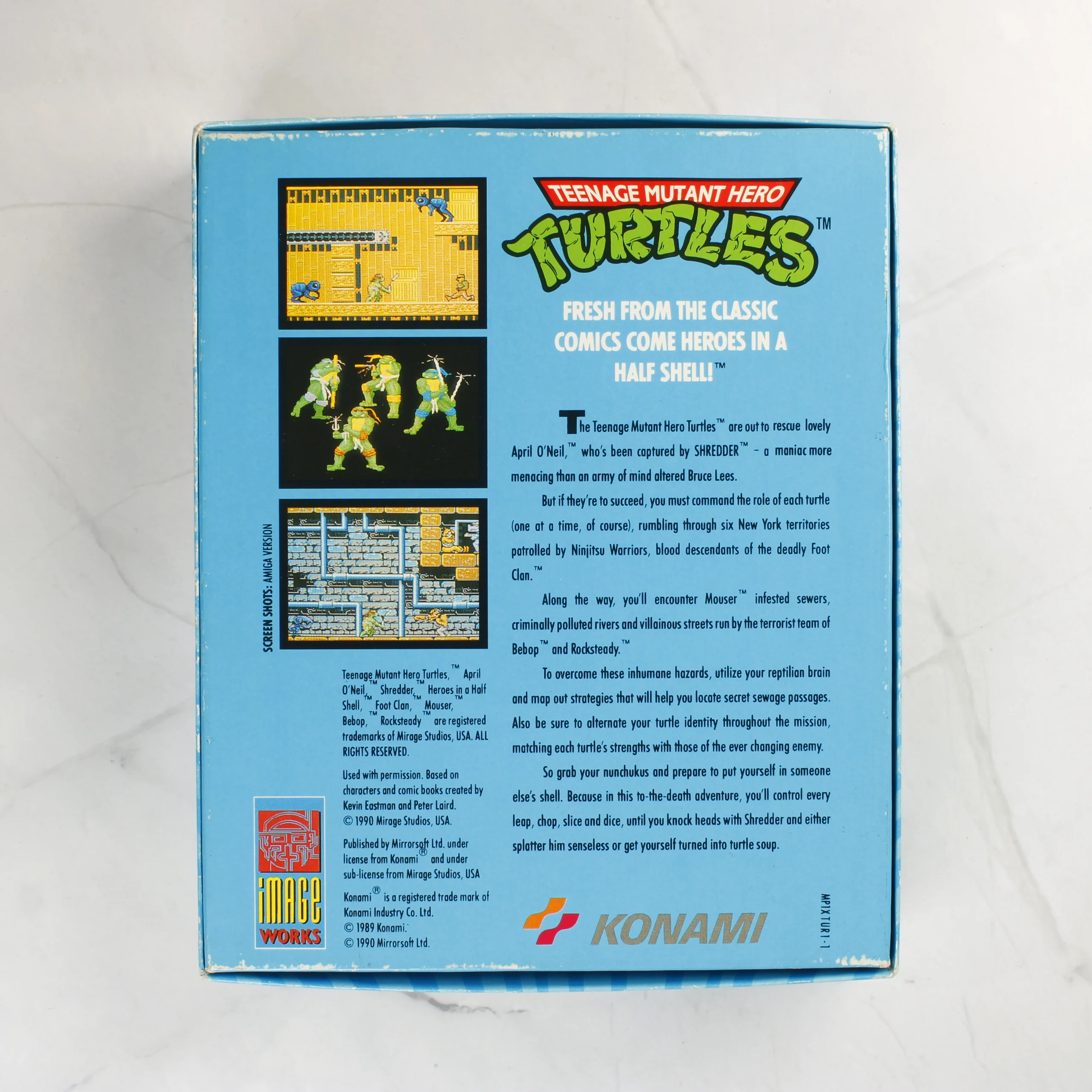 A Teenage Mutant Hero Turtles videójáték Amiga platformra kiadott változata. A csomag tartalmazza az eredeti színes kartondobozt, egy kék színű 3,5 colos floppy lemezt és a hozzá tartozó használati útmutatót. A doboz elején a négy nindzsa teknőc látható akció közben, valamint a Konami, az Image Works és az Amiga logói. A hátoldalon angol nyelvű leírás és három képernyőkép található a játékmenetből. A dobozon egy fehér kör alakú matrica jelzi az extra tartalmakat, mint például Panini matricák és tetoválások. A floppy lemez fehér címkéjén a játék címe és a betöltési utasításokra vonatkozó figyelmeztetés olvasható.
