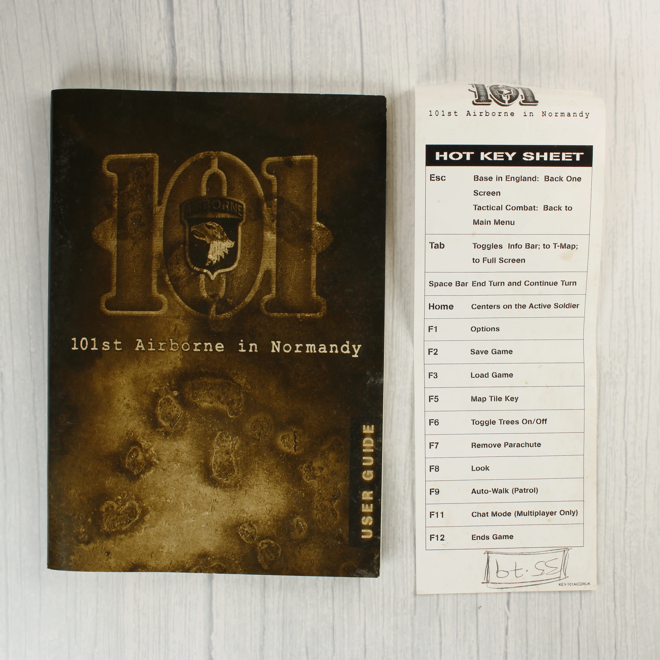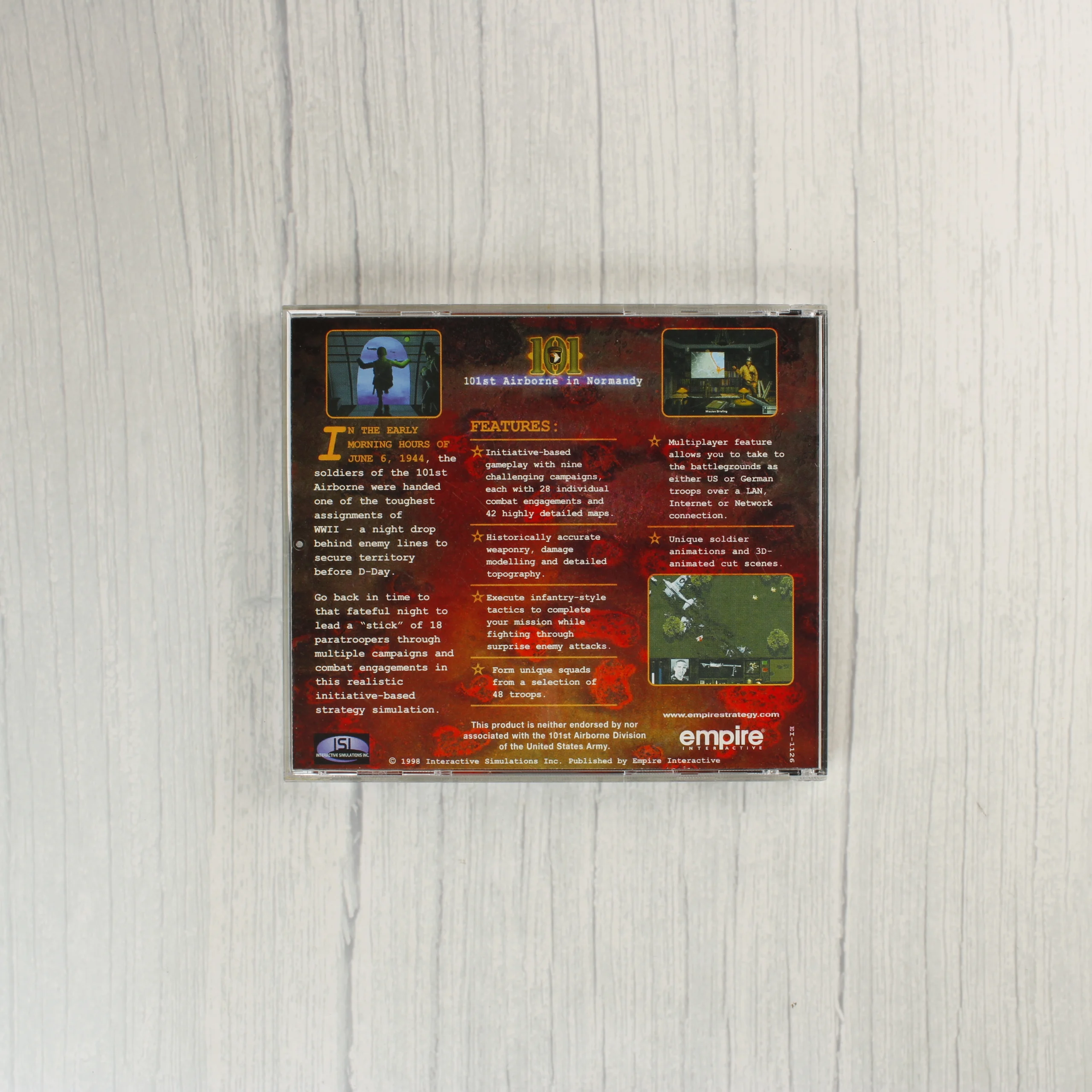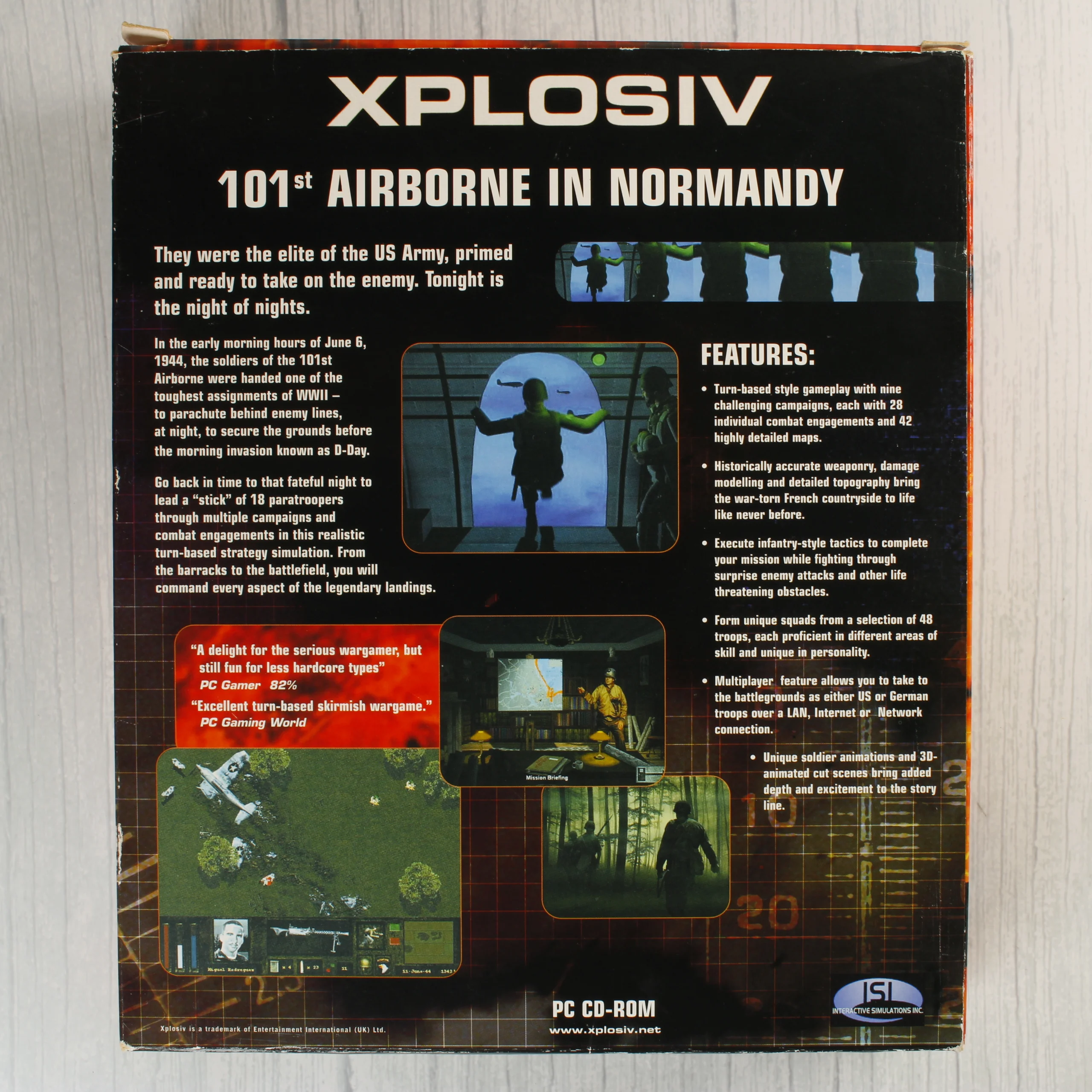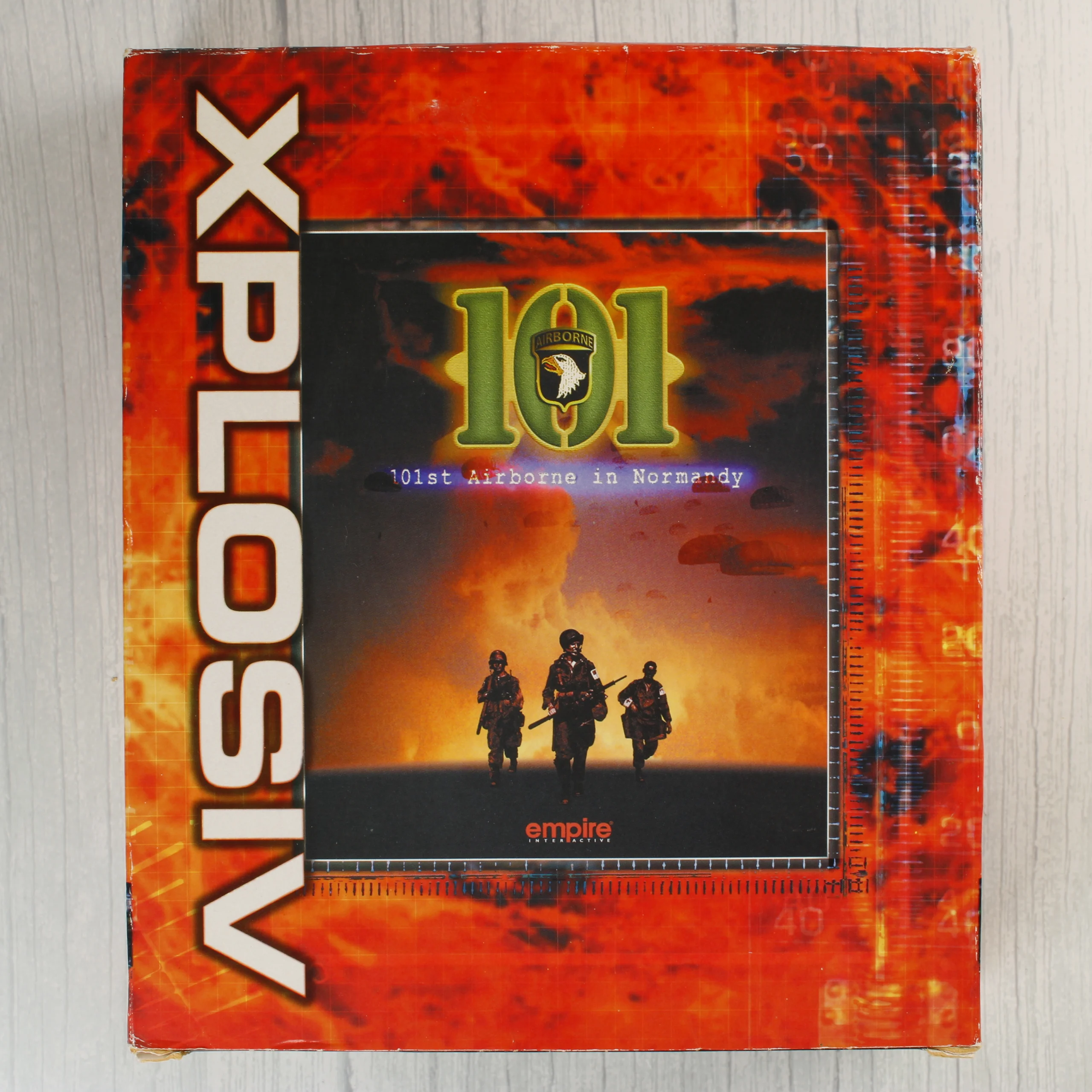 A 101st Airborne in Normandy egy PC-re megjelent körökre osztott stratégiai videójáték, amely az Xplosiv kiadásában látható. A csomag tartalmazza az eredeti kartondobozt, egy normál CD-tokot a játéklemezzel, egy felhasználói kézikönyvet és egy gyorsbillentyű-kiosztást tartalmazó lapot. A doboz grafikája katonákat ábrázol harci környezetben, narancssárga és vörös tónusokkal. A CD-tok hátoldalán és a kartondobozon képernyőképek és a játék jellemzői láthatóak angol nyelven. A lemez felülete zöld és sárga mintázatú, rajta a 101-es légiszállítású hadosztály jelvényével. A papíralapú mellékletek használt állapotúak, a gyorsbillentyűs lapon kézzel írt jelölés található. A külső doboz élei mentén enyhe kopás és fehéredés tapasztalható.