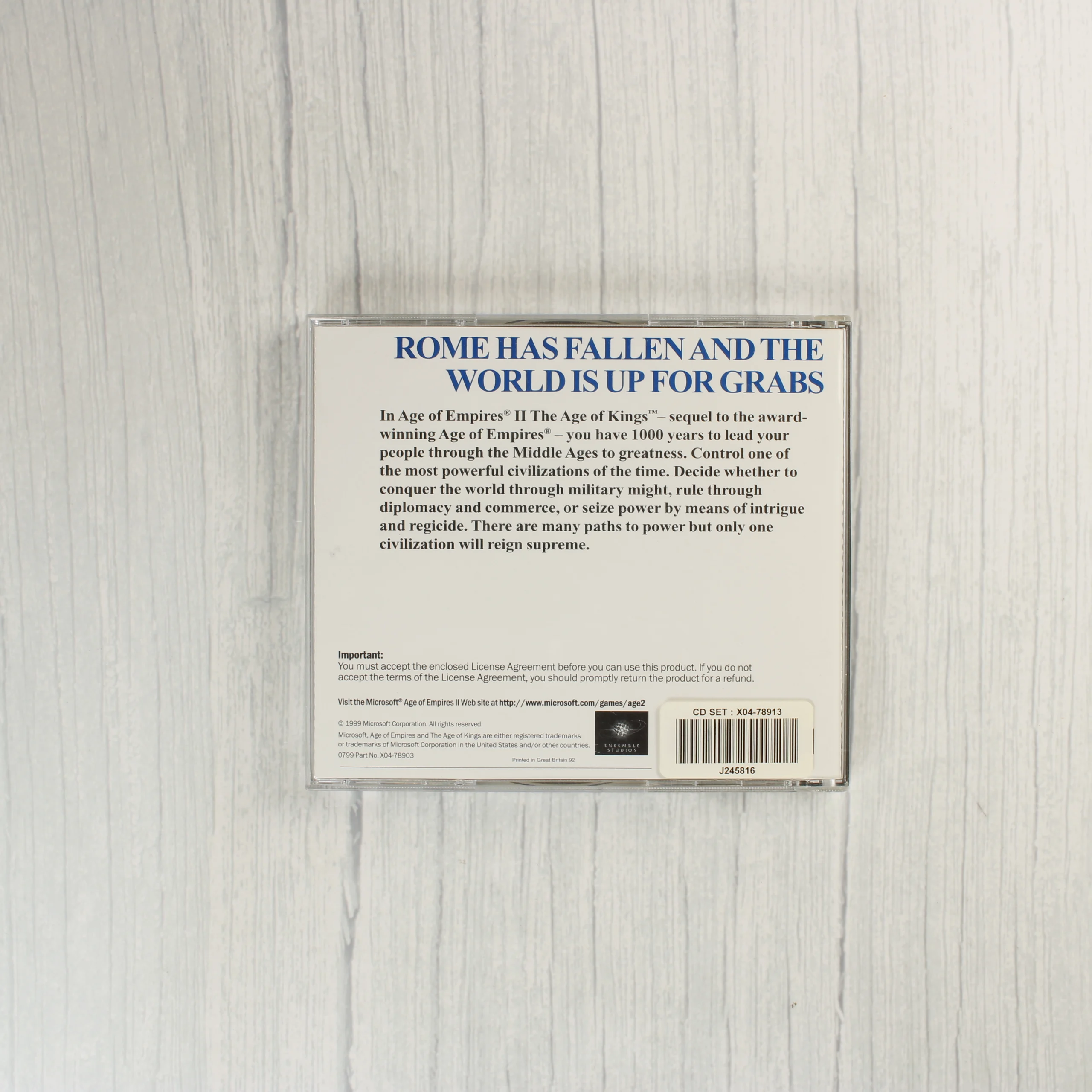 Az Age of Empires II: The Age of Kings egy klasszikus stratégiai videójáték PC platformra. A csomag tartalmazza az eredeti kartondobozt, egy színes kézikönyvet, valamint a játékot tartalmazó CD-t egy normál CD-tokban. A doboz elején három harcos látható: egy viking, egy középkori király és egy szamuráj, felettük a Microsoft és az Ensemble Studios logója. A hátoldalon játékmenet-képernyőképek és angol nyelvű leírás olvasható. A CD-tok hátlapján szintén angol nyelvű ismertető szöveg és vonalkód található. A lemezen kék színű grafika látható, amely keresztes lovagokat ábrázol. A papíralapú összetevők és a doboz élei mentén látható némi kopás és használatból eredő elszíneződés.