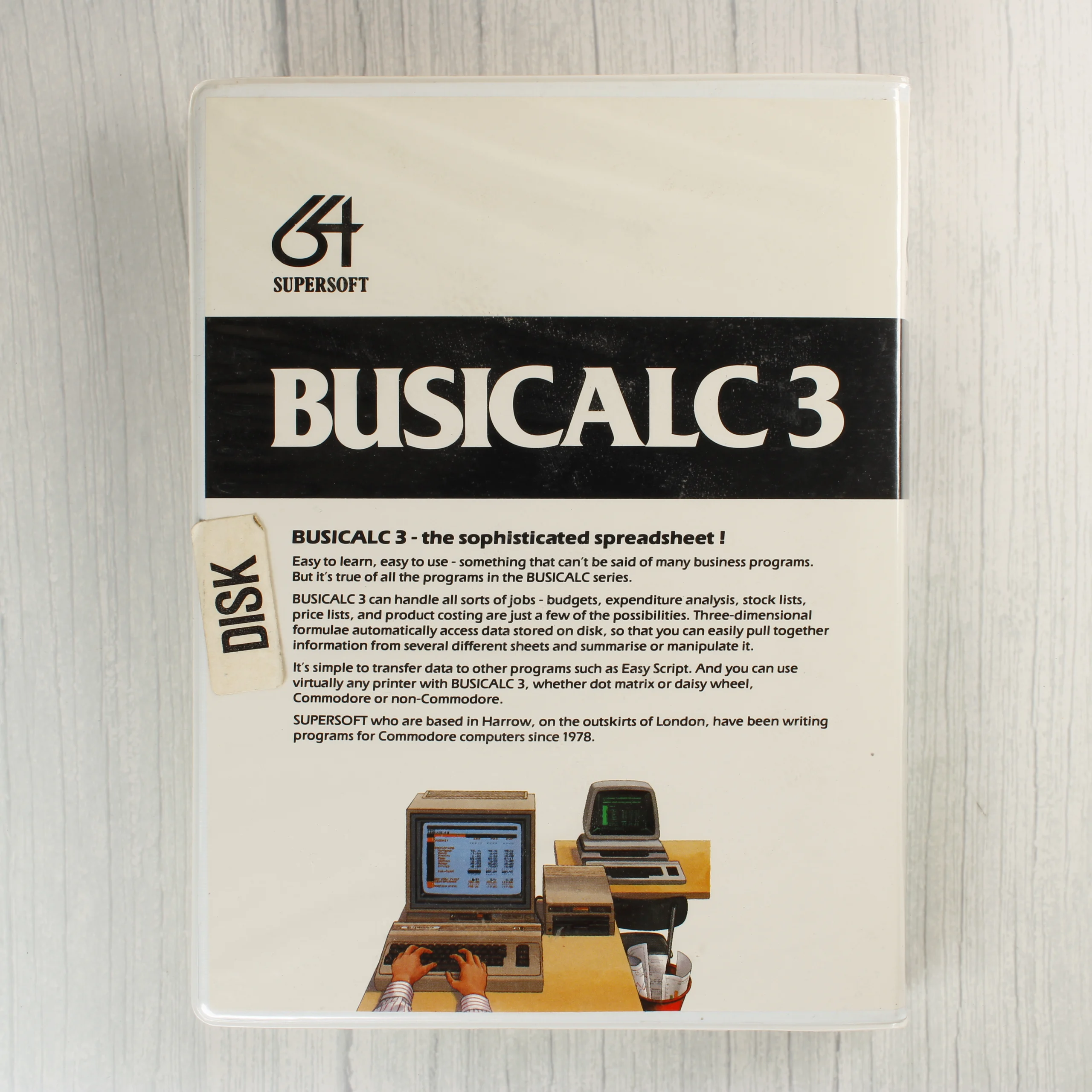 A Supersoft által kiadott Busicalc 3 egy táblázatkezelő szoftver Commodore 64 számítógéphez. A termék egy fehér színű, műanyag borítású tokban található, amelynek elején a szoftver neve és egy illusztráció látható, amely egy korabeli számítógépes munkaállomást ábrázol. A csomag tartalmaz egy 5,25 colos floppy lemezt, amely papírtokban pihen. A lemezen lévő címke tanúsága szerint a szoftver 1987-es kiadású, és kompatibilis az 1541, 1570 és 1571 típusú meghajtókkal. A tok hátoldalán angol nyelvű leírás olvasható a program funkcióiról. A külső borításon egy sárgult 'DISK' feliratú matrica látható. A műanyag tok és a lemez is megkímélt állapotban van, jelentősebb fizikai sérülés nem látható rajtuk.