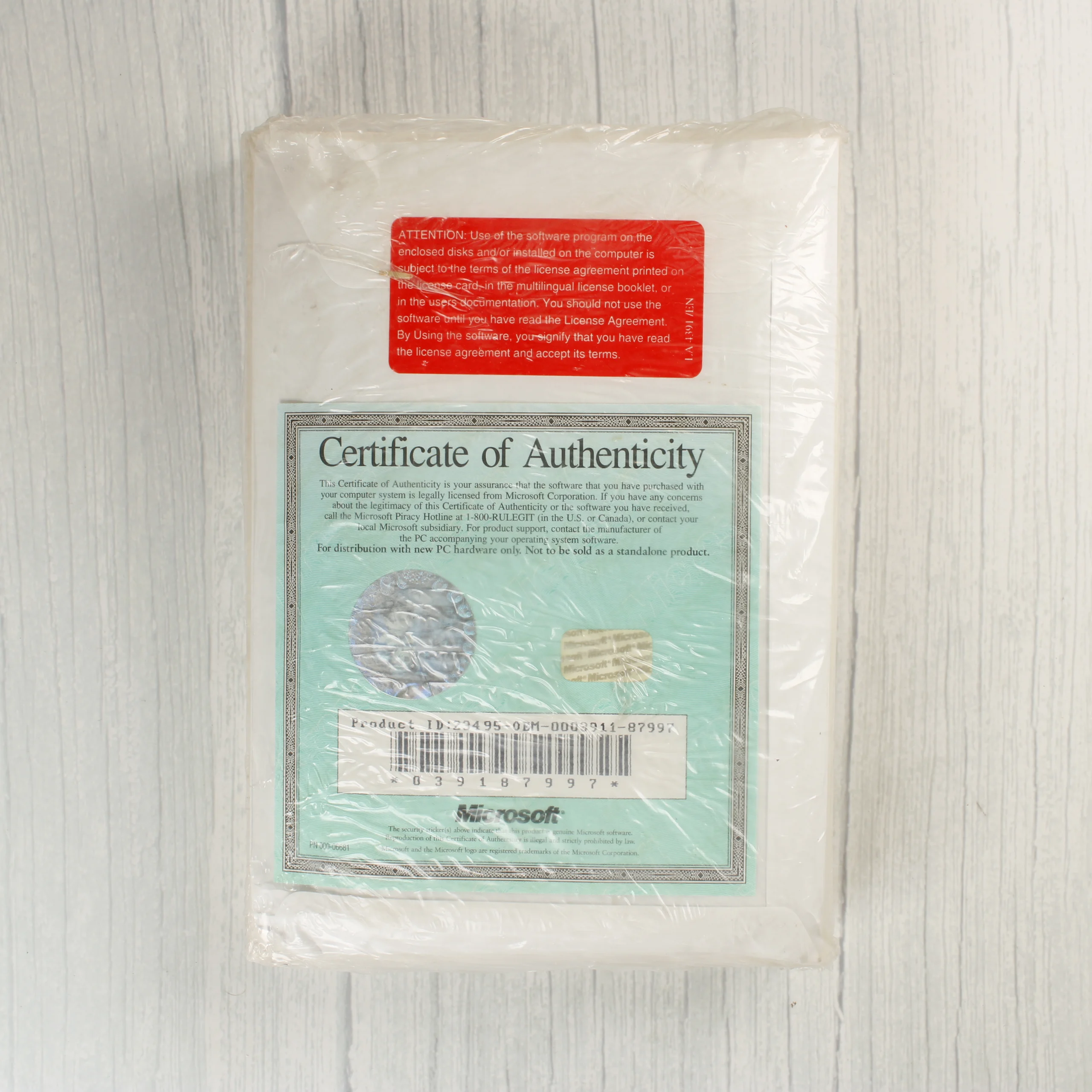 A Microsoft Windows for Workgroups szoftvercsomag eredeti, gyári fóliázott állapotban. A csomag tartalmazza a felhasználói kézikönyvet (User's Guide), amelynek borítóján a klasszikus színes Windows logó látható. A fehér alapú borítón a 'For sale only with a new PC' felirat olvasható. A hátoldalon egy zöldes árnyalatú eredetiséget igazoló tanúsítvány (Certificate of Authenticity) található, rajta vonalkóddal és hologrammal, valamint egy piros figyelmeztető matrica a licencfeltételekről. A fólia ép, de helyenként gyűrött, ami a hosszú távú tárolás jele. A csomagolás sértetlen, megóvva a belső tartalmat a portól és a nedvességtől.