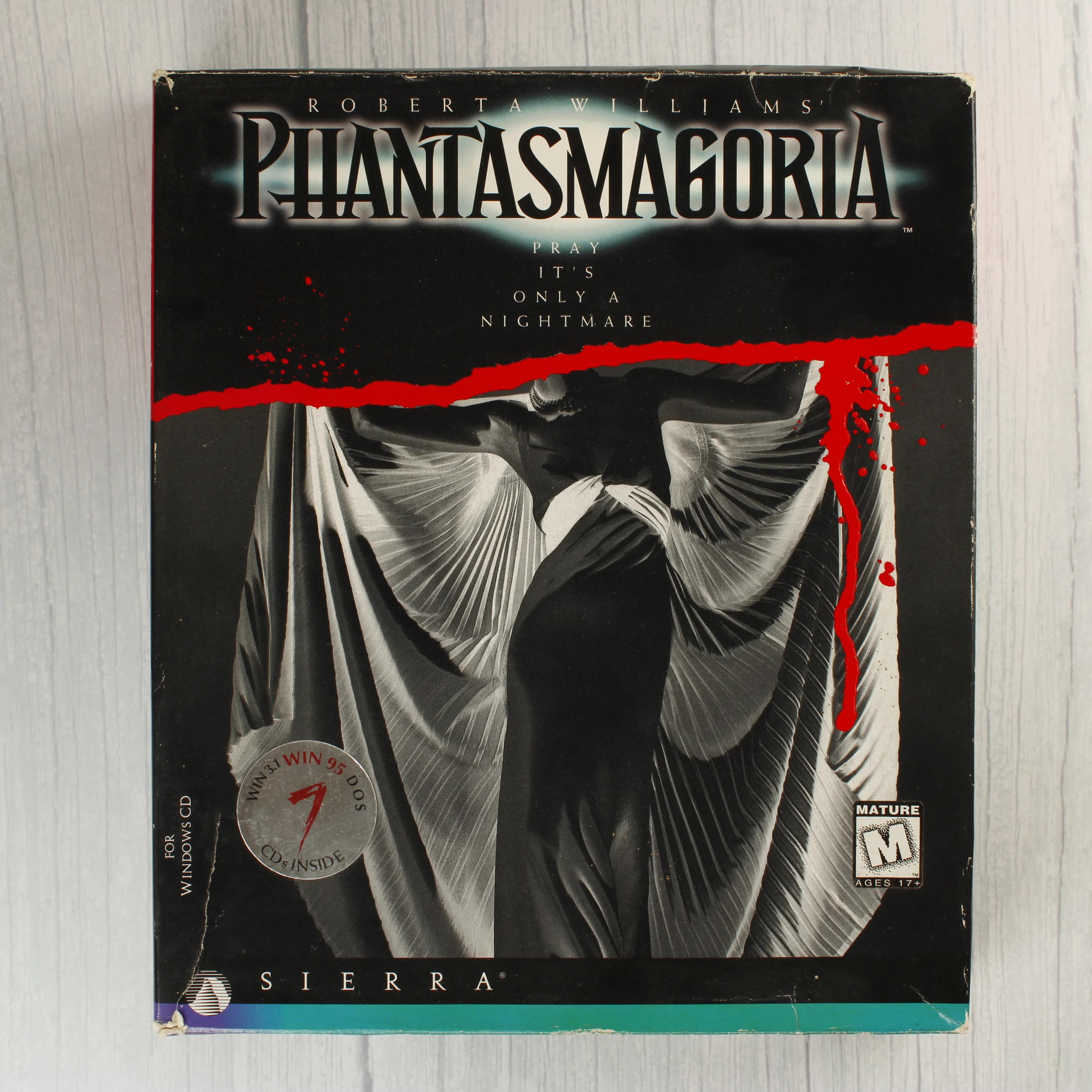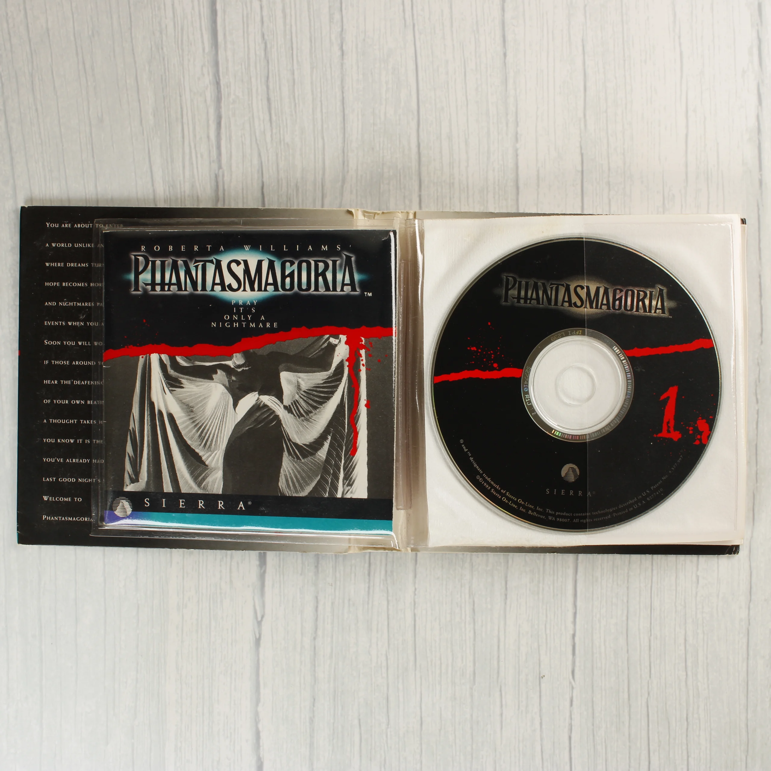 A Roberta Williams által jegyzett Phantasmagoria című videójáték nagy dobozos kiadása. A csomag tartalmazza az eredeti kartondobozt, amelyen sötét tónusú, horrorisztikus grafika látható vörös vérfolt-motívummal. A készlet része egy többoldalas, műanyag tasakokkal ellátott lemeztartó mappa, amelyben összesen hét darab CD található. A lemezek fekete alapszínűek, fehér felirattal és vörös sorszámozással. A doboz elején egy ezüstszínű matrica jelzi a hétlemezes tartalmat, valamint látható rajta a Sierra logója és a Mature korhatár-besorolás. A hátoldalon a játékból vett jelenetfotók és kedvcsináló szövegek kaptak helyet. A papírdoboz élei mentén fehér kopásnyomok és kisebb benyomódások láthatóak, különösen a sarkoknál.