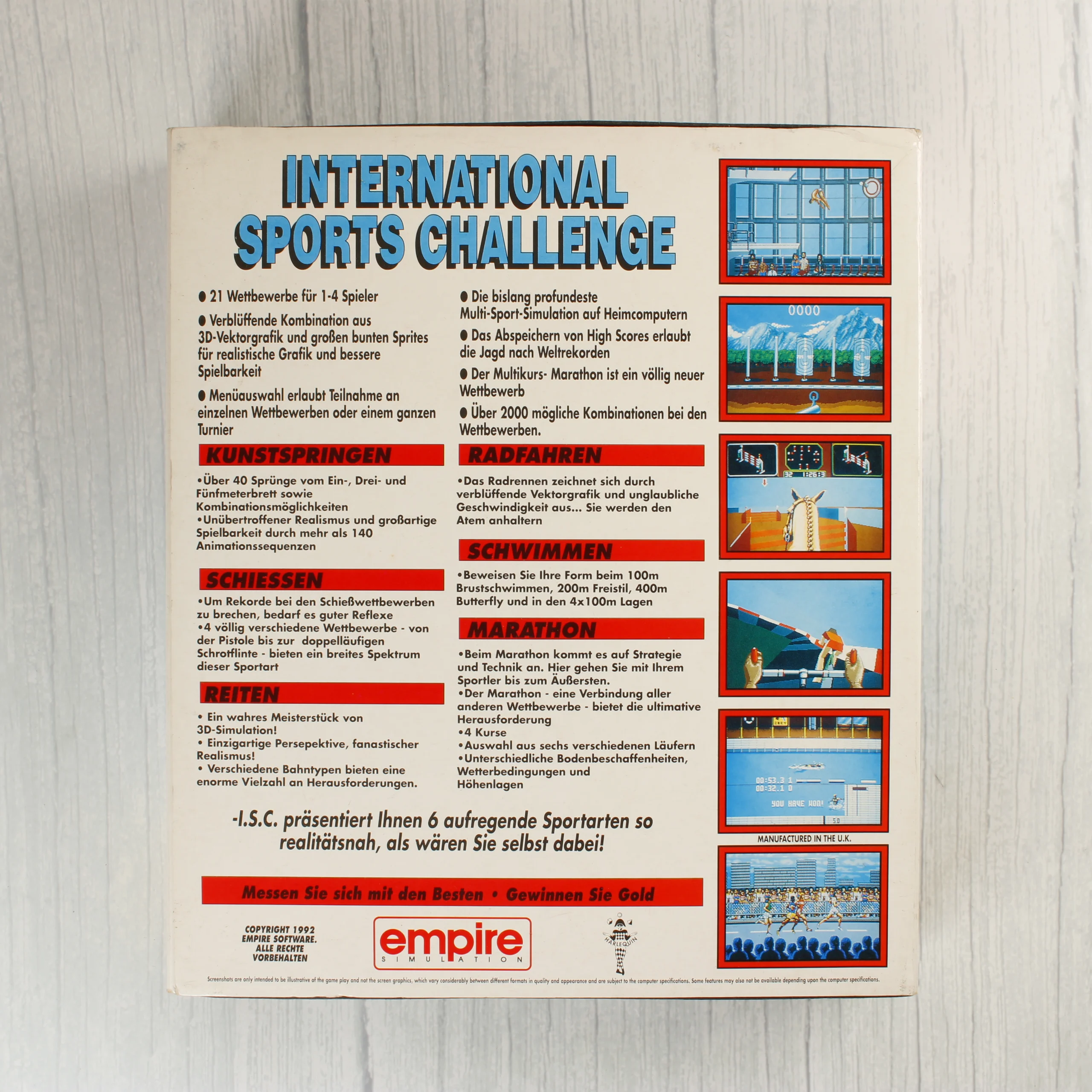 Az International Sports Challenge egy Atari ST platformra megjelent sport szimulációs videójáték az Empire Software gondozásában. A csomag tartalmazza az eredeti illusztrált kartondobozt, három darab 3,5 colos floppy lemezt, egy spirálkötésű használati útmutatót és egy összehajtott posztert. A doboz elején egy futó látható, körülötte pedig lovaglás, úszás, lövészet és kerékpározás jelenetei jelennek meg. A hátoldalon német nyelvű leírás és játékmenet-képek találhatók. A lemezek bézs színűek, kék felirattal és grafikával. A termék korának megfelelő, megkímélt állapotban van, a papíralapú kiegészítőkön és a dobozon enyhe használati nyomok látszanak.