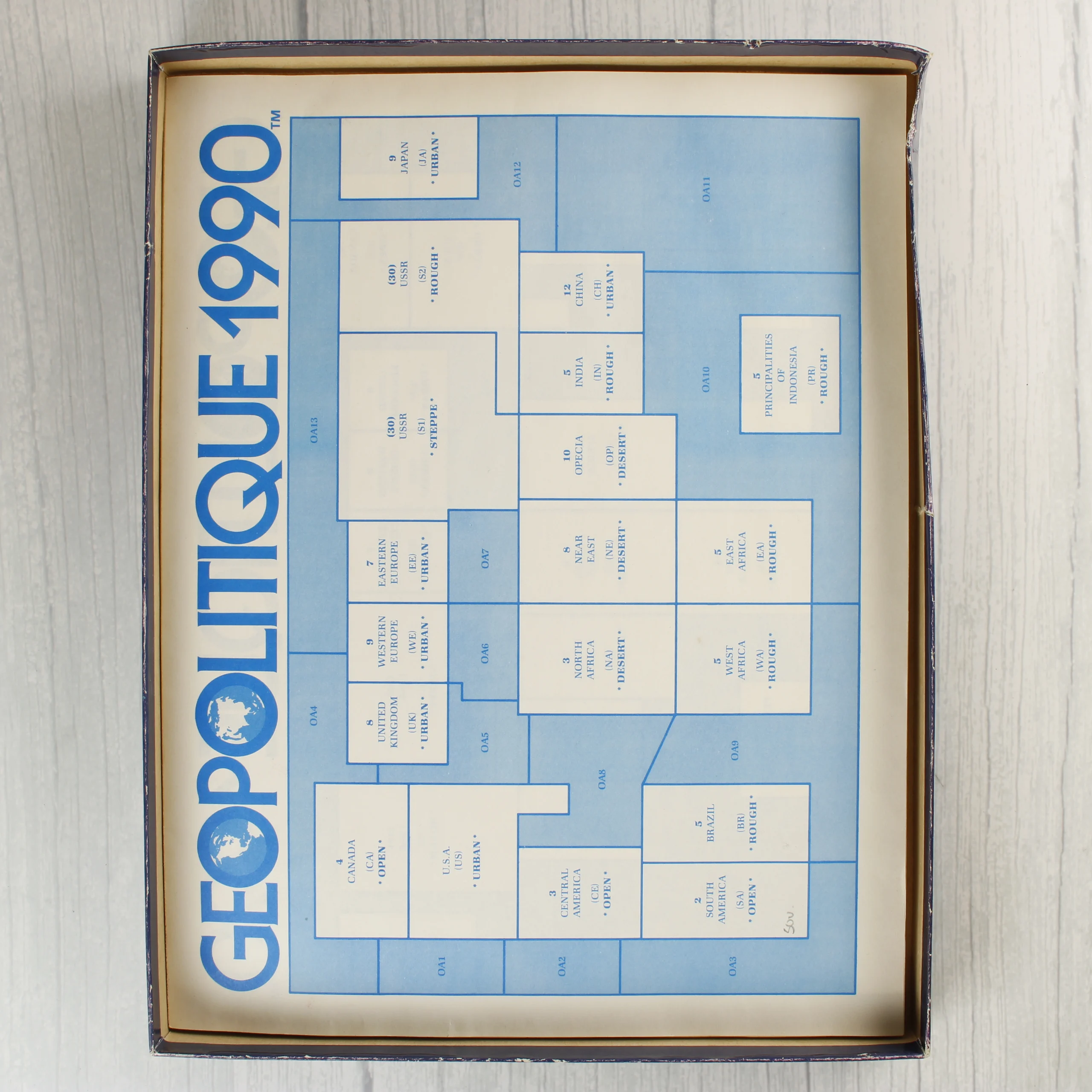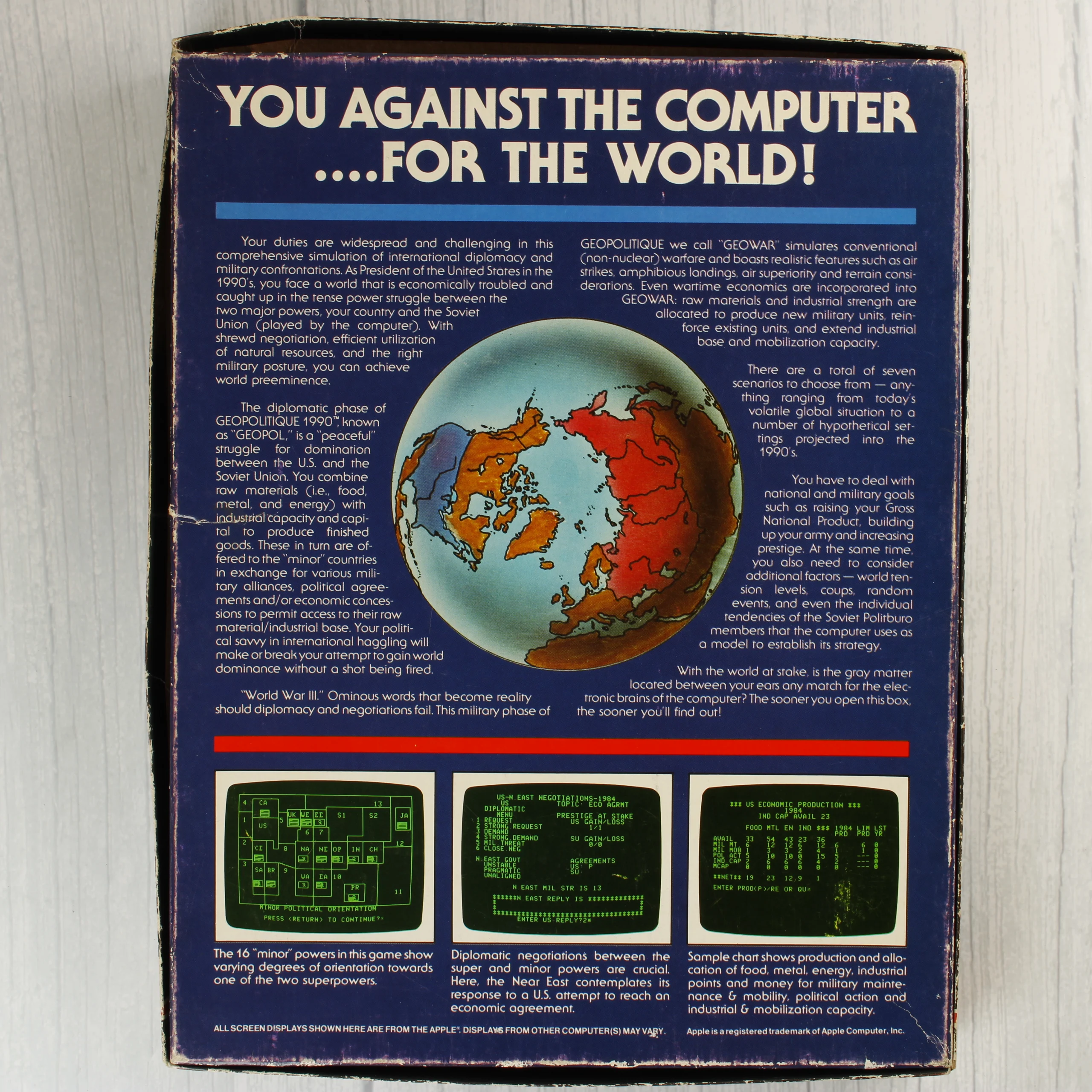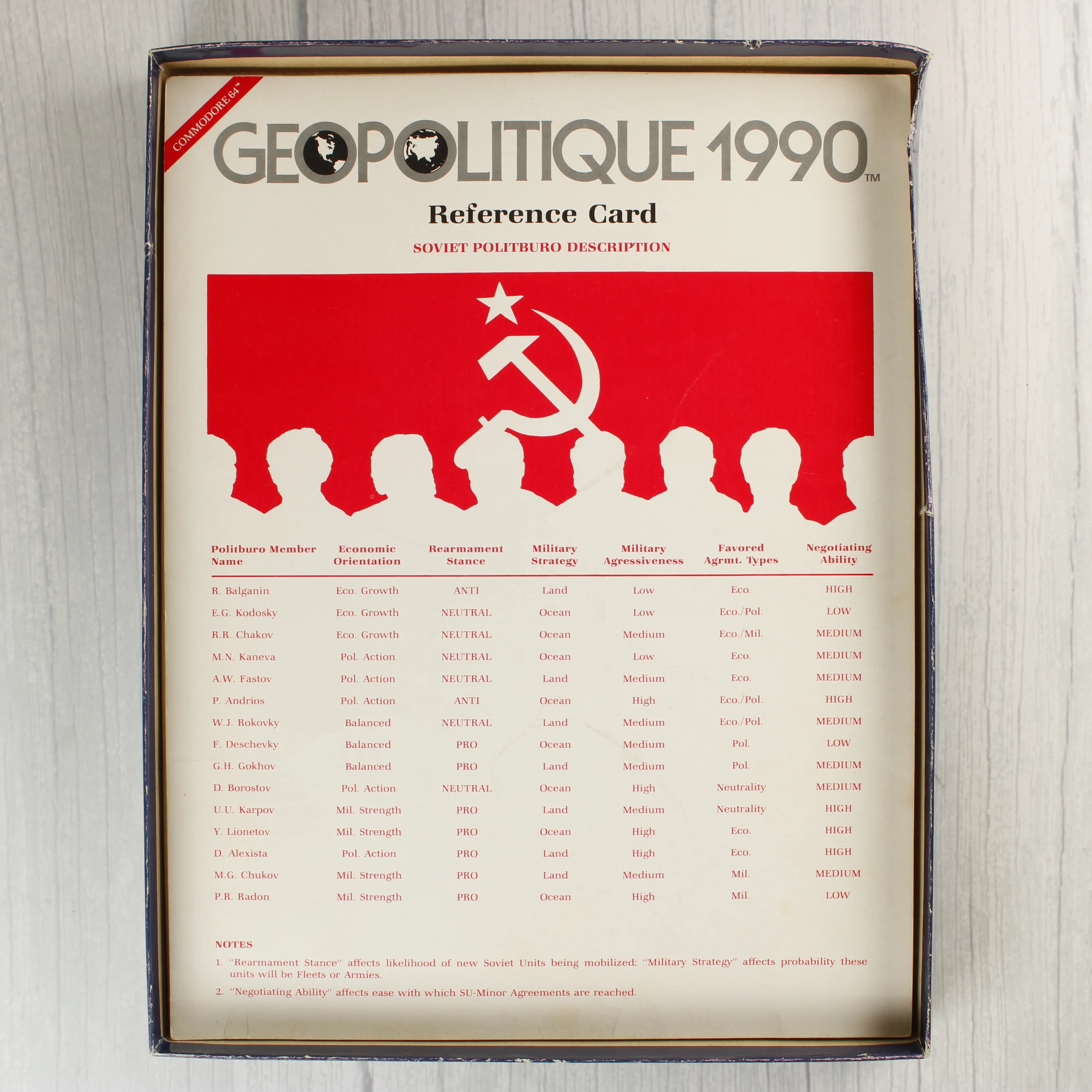 A Geopolitique 1990 egy politikai és gazdasági szimulációs videójáték Commodore 64 platformra, amelyet a Strategic Simulations Inc. (SSI) adott ki. A csomag tartalmazza az eredeti illusztrált kartondobozt, egy 5,25 colos floppy lemezt papírtokban, egy referenciakártyát a szovjet politbüro adataival, valamint egy térképes segédletet. A doboz elején egy földgömb felett gondolkodó férfi és egy számítógépes kar látható. A hátoldalon a játékmenet leírása és képernyőmentések találhatók. A papíralapú kiegészítők és a lemez jó állapotban vannak, a doboz élein és sarkain látható kopás és némi benyomódás tapasztalható.