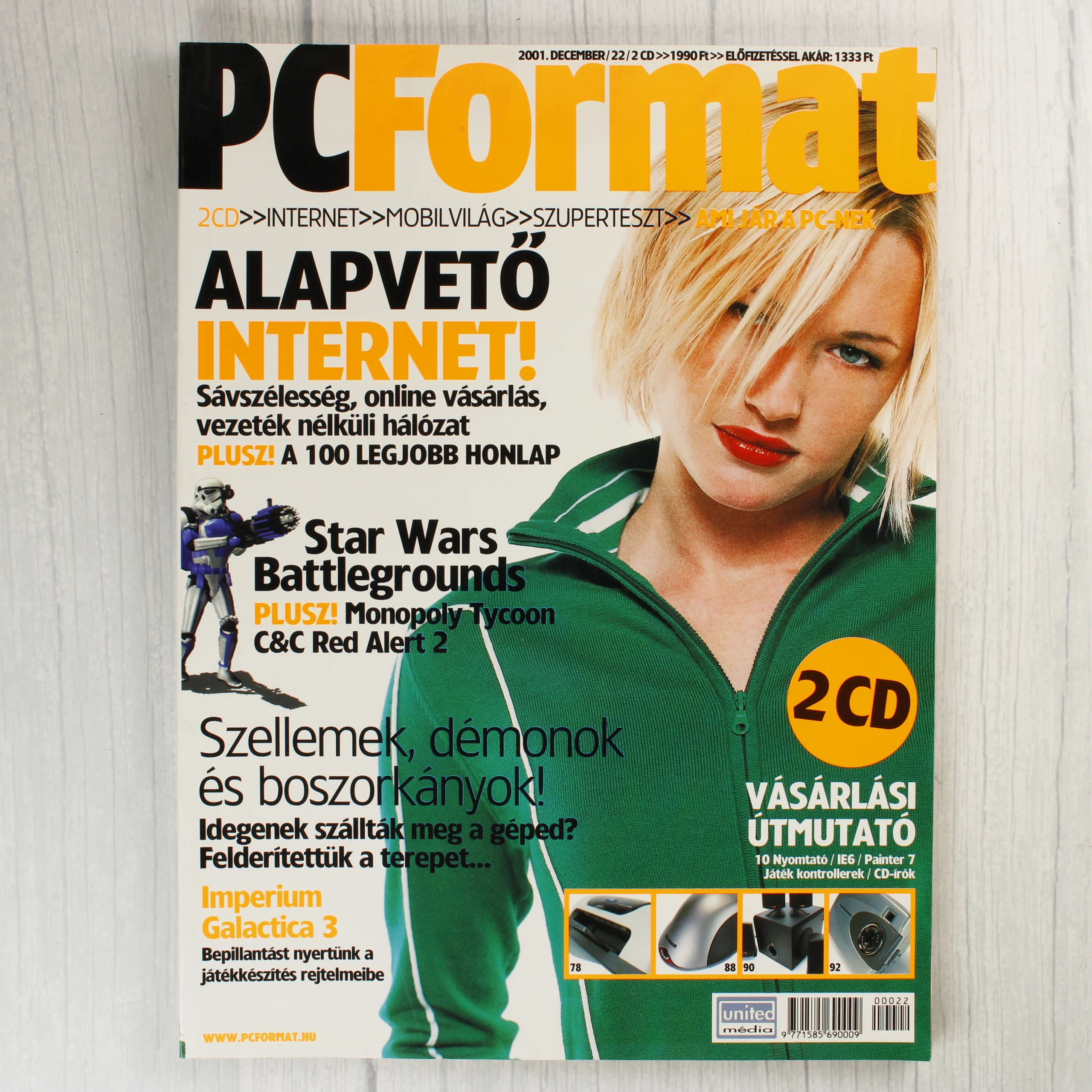 A PC Format magazin 2001. decemberi száma, amelynek címlapján egy szőke nő látható zöld felsőben. A borítón kiemelt témák között szerepel az internet használata, a Star Wars Battlegrounds, az Imperium Galactica 3, valamint egy vásárlási útmutató nyomtatókhoz és CD-írókhoz. A magazin belső oldalai színes illusztrációkkal és technológiai hírekkel, például a Philips DVD-írójáról és az Xbox konzolról szóló beszámolókkal vannak teli. A kiadvány papír alapú, tűzött kötéssel készült, a borítón sárga és fekete tipográfia dominál. A hátoldalon vonalkód és az United Média logója látható.