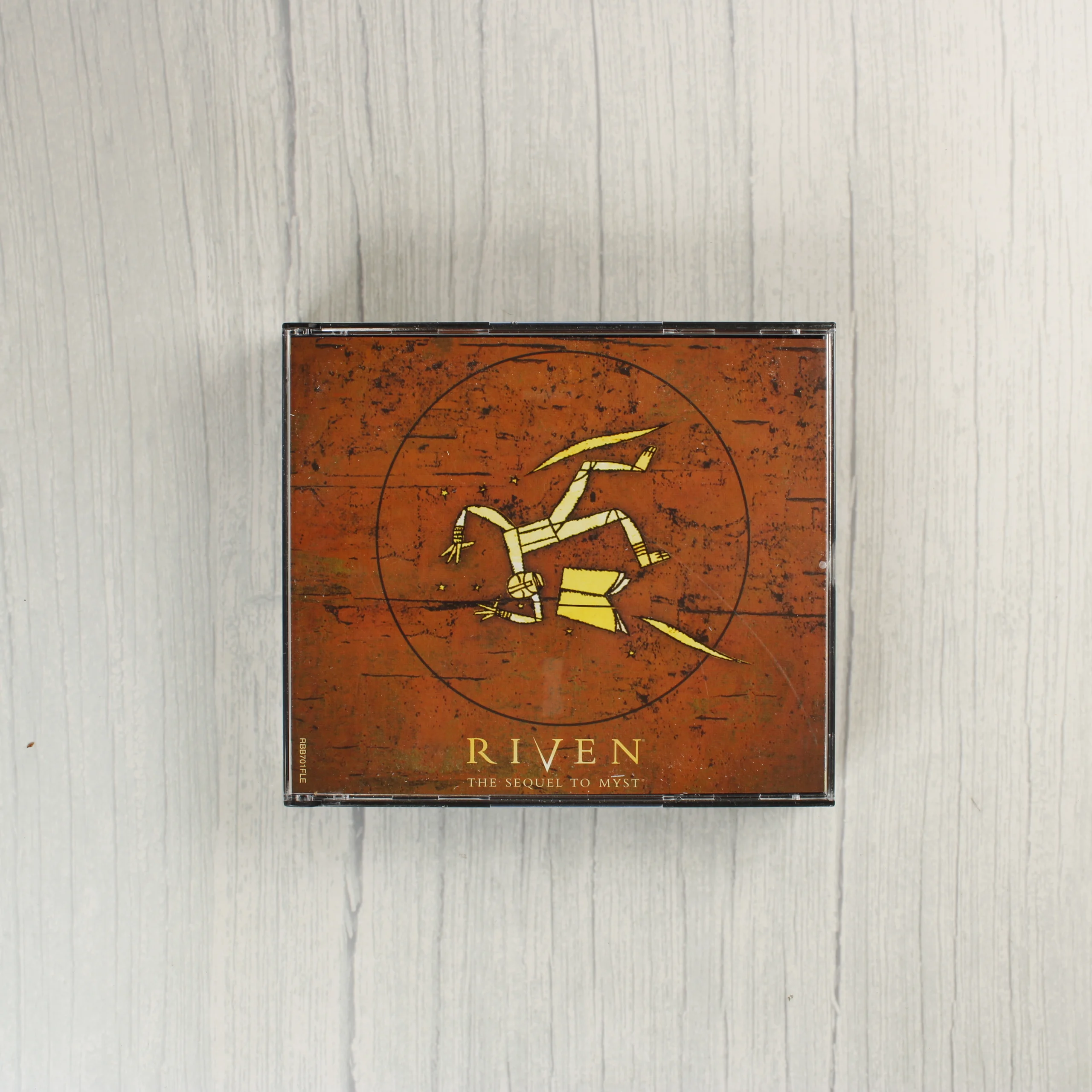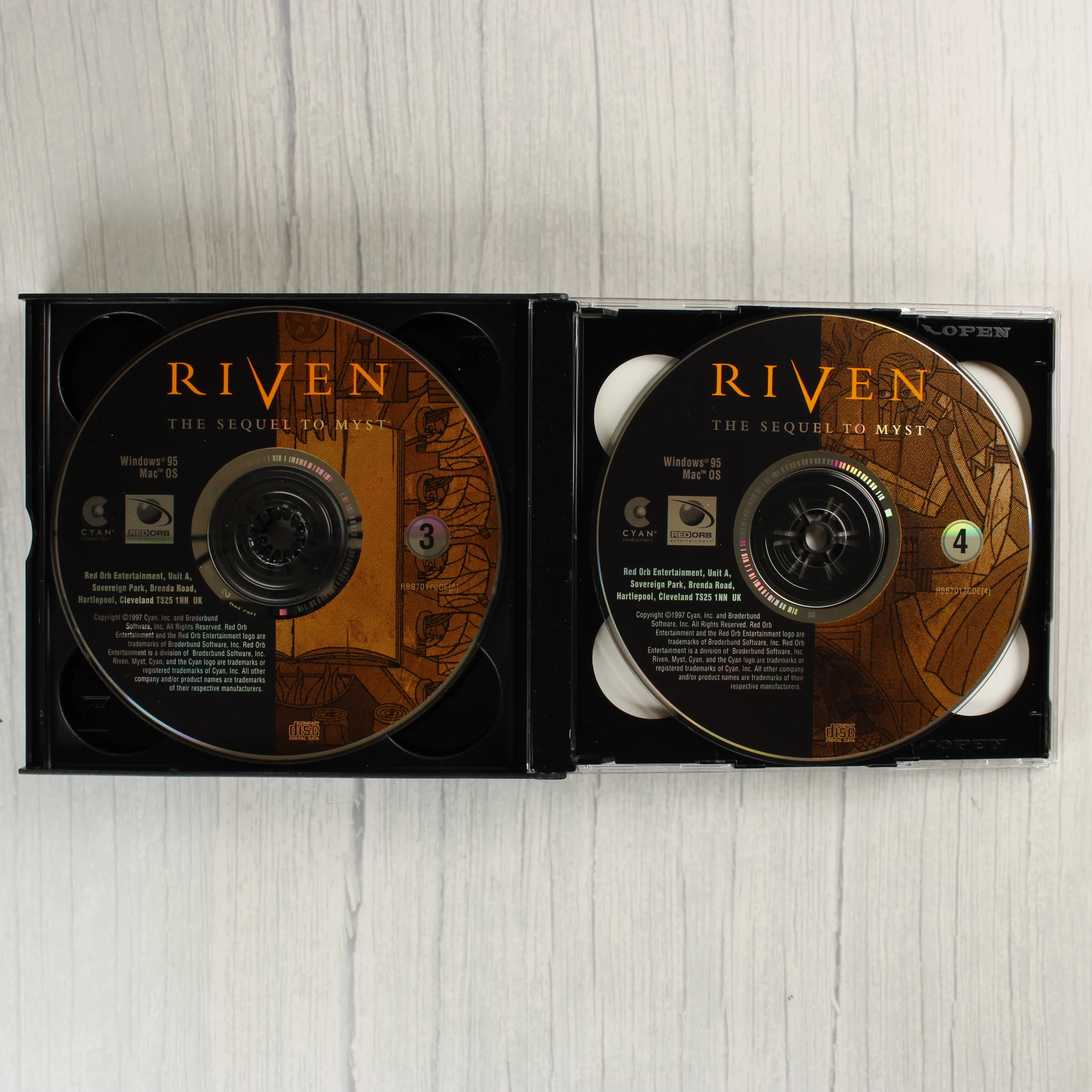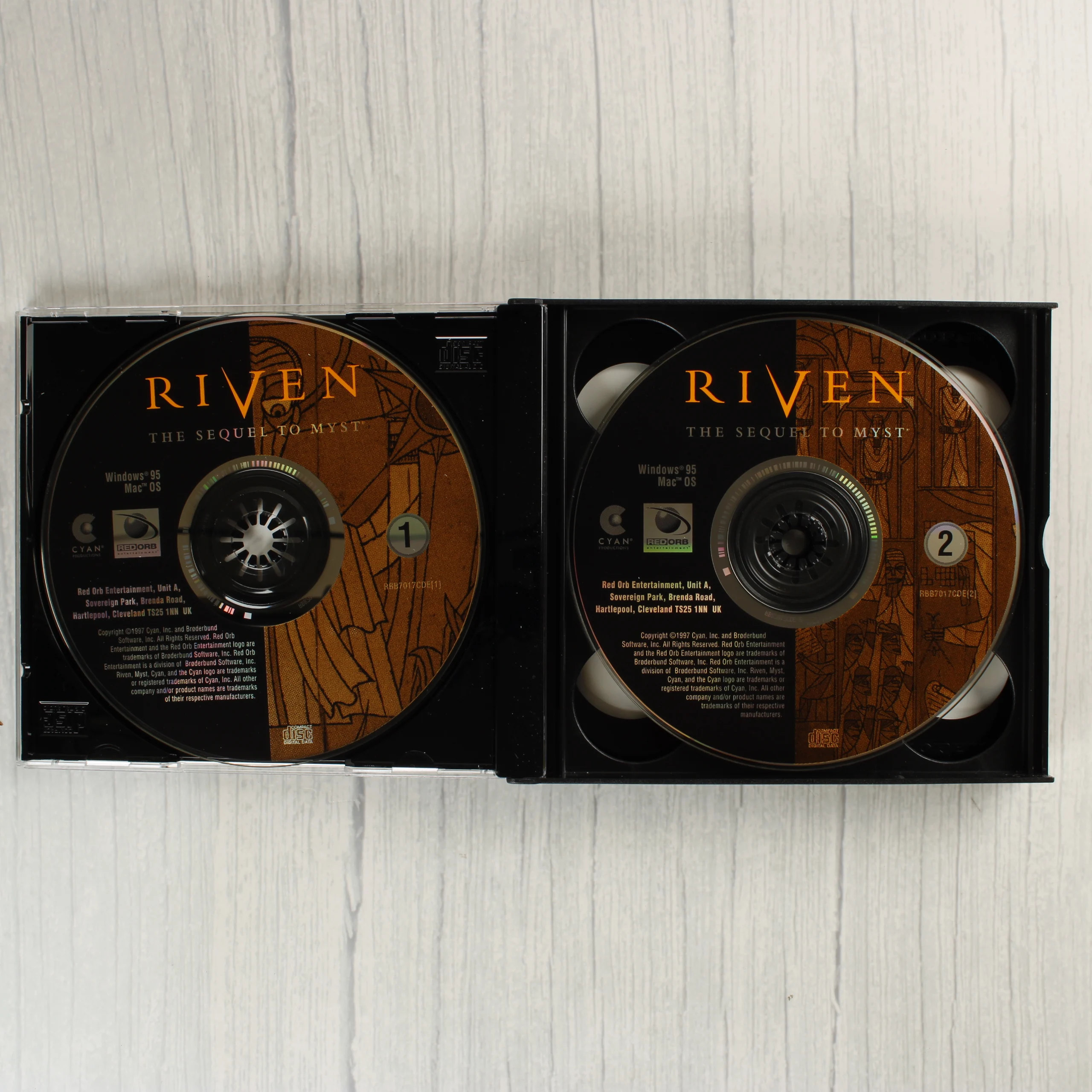 A Riven: The Sequel to Myst című videójáték PC és Mac platformra kiadott változata. A csomag egy nagyméretű, színes kartondobozt tartalmaz, amelyben egy vastag CD-tok található. A tokban összesen öt darab, sorszámozott CD-lemez helyezkedik el, amelyek a játék teljes tartalmát hordozzák. A készlet részét képezi továbbá egy felhasználói kézikönyv, valamint több kiegészítő füzet és reklámanyag, köztük a RedOrb Entertainment és a Broderbund kiadványai. A doboz grafikája a játékra jellemző szürreális tájat és egy különleges építményt ábrázol. A lemezek felülete barna tónusú, rajtuk a játék logója és a sorszámuk látható. A papíralapú mellékletek jó állapotúak, a doboz élei mentén minimális kopás tapasztalható.