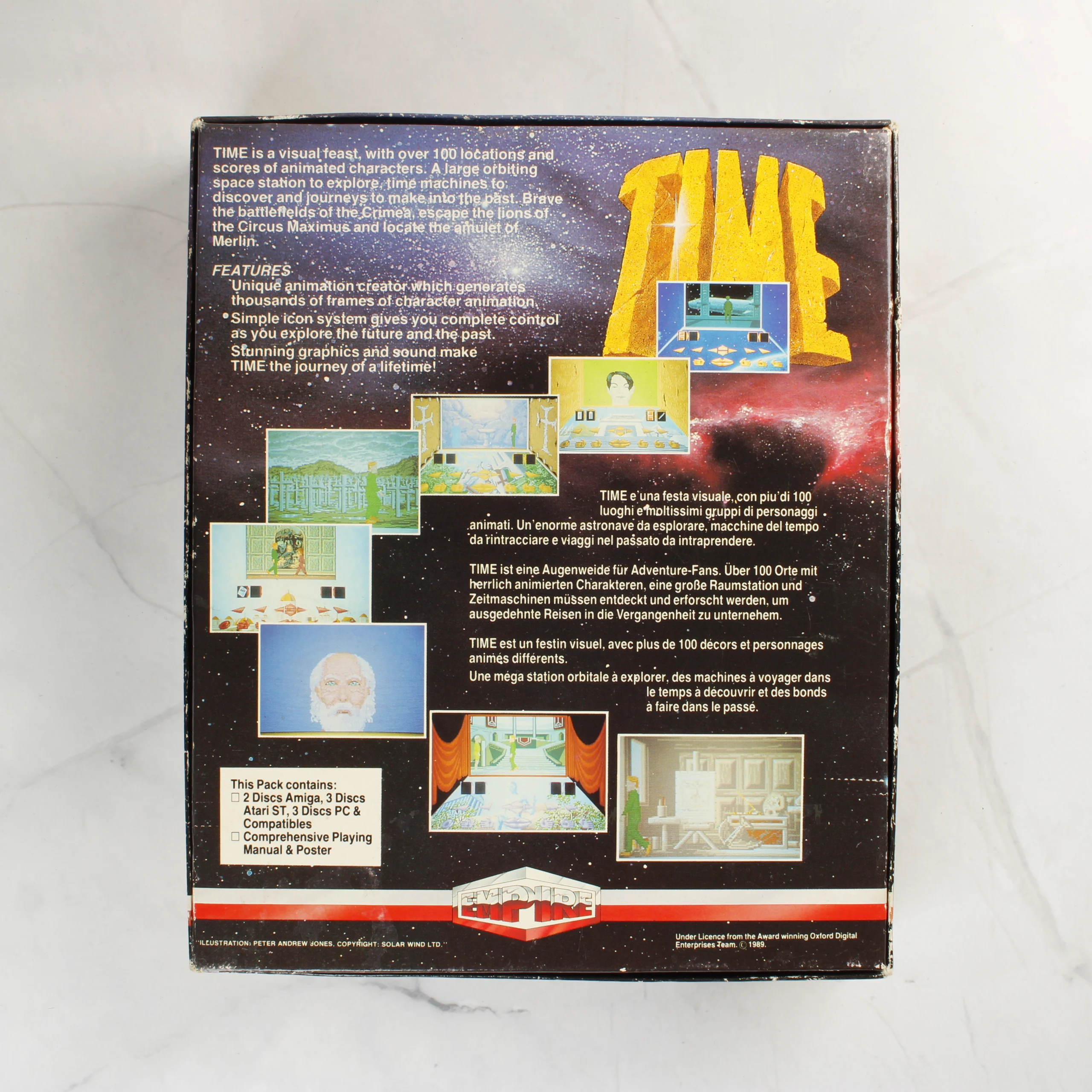 A TIME című videójáték Atari ST platformra készült kiadása. A csomag tartalmazza az eredeti illusztrált kartondobozt, három darab kék színű, 3,5 colos floppy lemezt, valamint egy nyomtatott felhasználói kézikönyvet. A doboz elején színes grafika látható, amely különböző korok karaktereit ábrázolja, a hátoldalon pedig többnyelvű leírás és képernyőmentések találhatók a játékról. A lemezeken fehér felirat jelzi a játék címét és a sorszámokat. A kézikönyv egyszerű, fekete-fehér borítóval rendelkezik. A termék az Empire kiadásában jelent meg 1989-ben.