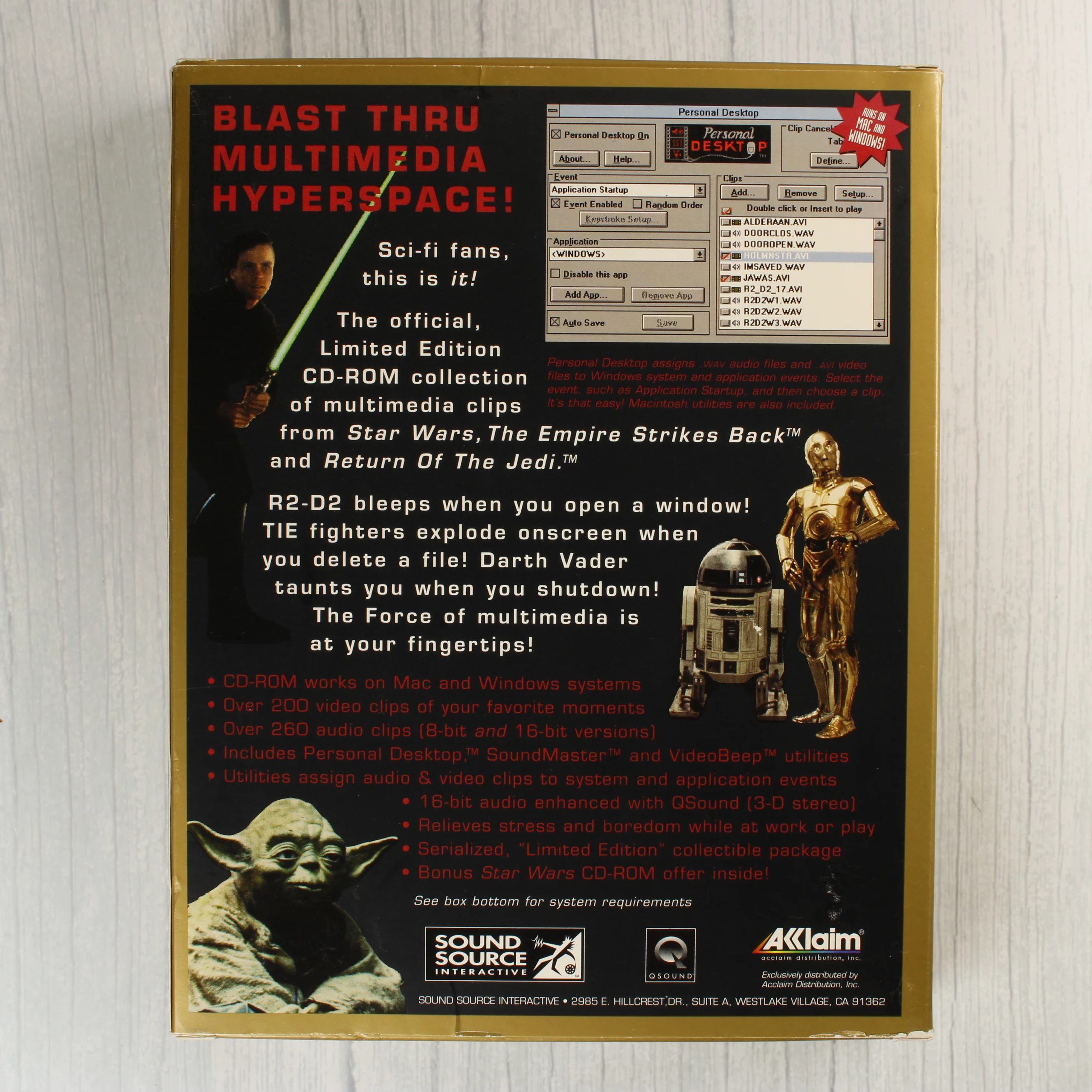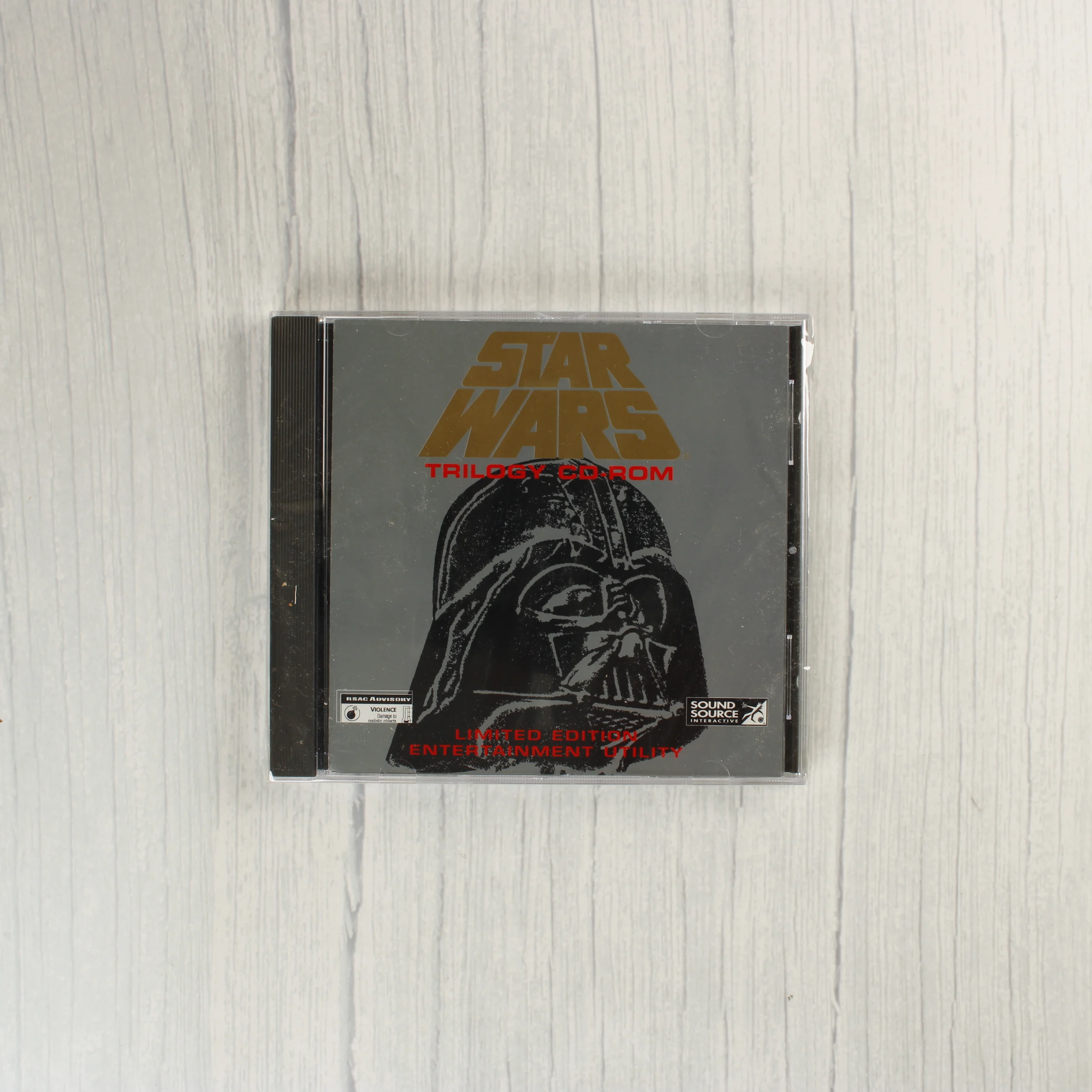 A Star Wars Trilogy CD-ROM Limited Edition Entertainment Utility szoftvergyűjteménye. A csomag egy nagyméretű, fekete alapszínű kartondobozt tartalmaz, amelyen Darth Vader sisakjának stilizált grafikája látható arany és piros feliratokkal. A doboz elején egy kerek, arany színű matrica jelzi a sorszámozott limitált kiadást (023141). A hátoldalon a szoftver funkcióit bemutató képernyőképek és Star Wars karakterek (Luke Skywalker, R2-D2, C-3PO, Yoda) láthatóak. A készlet része egy normál CD-tok is, amelyben a multimédiás tartalom található. A kiadvány Windows és Mac rendszerekkel kompatibilis, és több mint 200 videoklipet, valamint 260 audioklipet tartalmaz a klasszikus trilógiából. A Sound Source Interactive és az Acclaim gondozásában jelent meg.