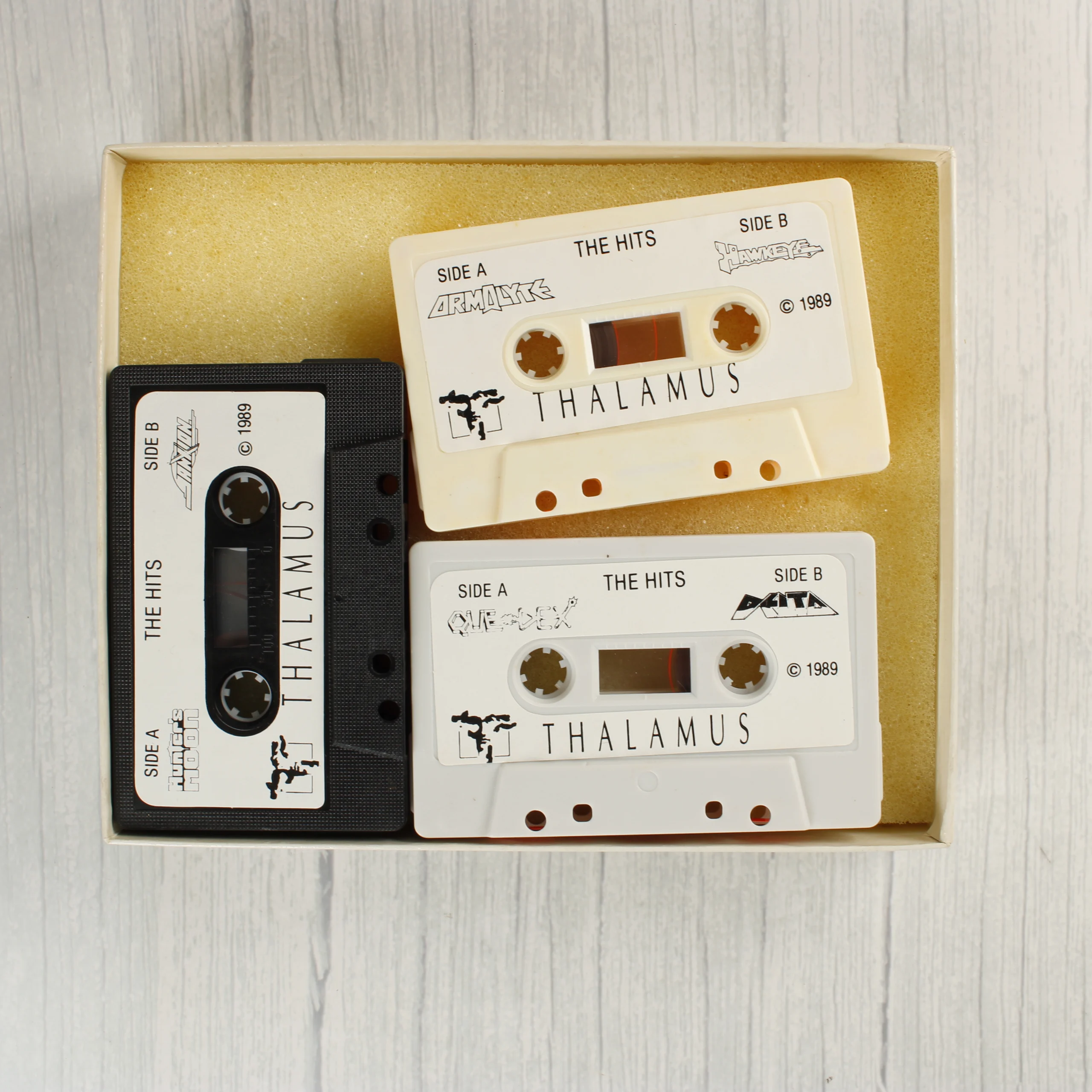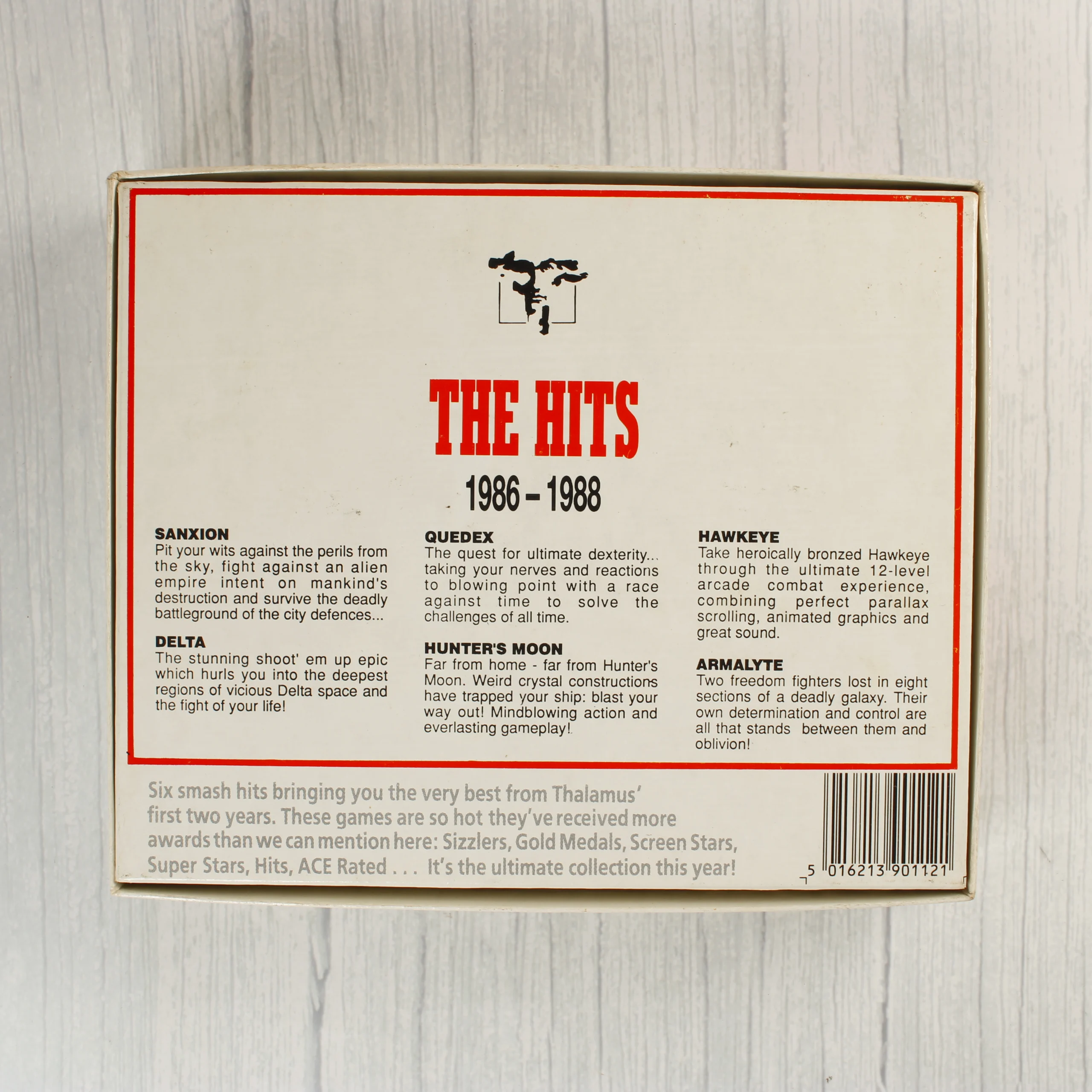 A Thalamus The Hits 1986-1988 egy videójáték válogatás Commodore 64 és 128 rendszerekhez. A fehér kartondobozos kiadás hat népszerű játékot tartalmaz: Sanxion, Delta, Quedex, Hunter's Moon, Hawkeye és Armalyte. A csomag három darab magnókazettát tartalmaz, amelyek egy sárga szivacsbetétben helyezkednek el a dobozon belül. A kazetták fekete, fehér és krémszínű műanyag házzal rendelkeznek, rajtuk a Thalamus logója és a játékok címei láthatóak. A doboz elején a játékok borítóképei sorakoznak, a hátoldalon pedig rövid angol nyelvű leírások olvashatóak az egyes címekről. A kiadvány 1989-es évszámmal van ellátva a kazetták címkéin.