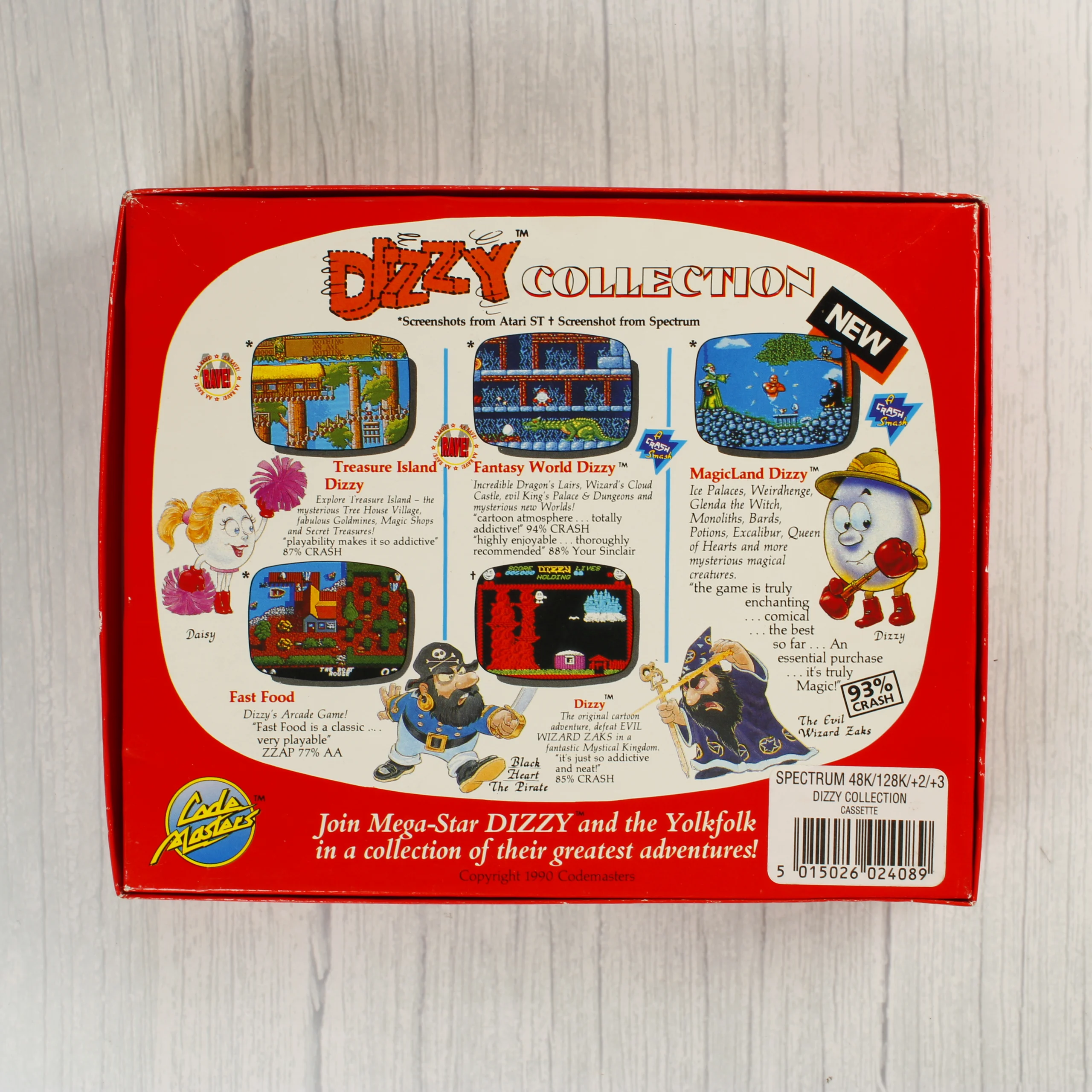 A Dizzy Collection egy öt játékot tartalmazó videójáték-válogatás ZX Spectrum platformra. A csomag tartalmazza a Treasure Island Dizzy, Fantasy World Dizzy, MagicLand Dizzy, Fast Food és az eredeti Dizzy játékokat. A piros alapszínű kartondoboz elején színes illusztráció látható a főszereplő tojásfigurával és egyéb karakterekkel. A doboz hátoldalán képernyőképek és rövid leírások találhatók a játékokról. A készlet része egy fekete-fehér nyomtatott használati útmutató, valamint két darab fekete műanyag kazetta, amelyeken a játékok címei és a Codemasters logója látható. A csomagolás és a tartozékok koruknak megfelelő állapotban vannak, a doboz élein és sarkain kisebb kopások és benyomódások észlelhetők.