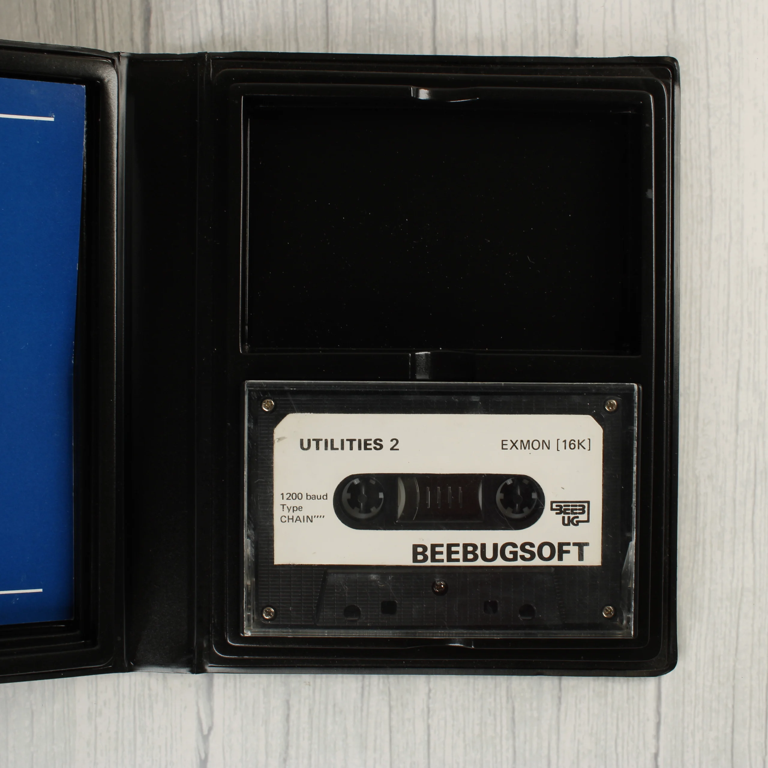 Az EXMON Extended Machine Code Monitor egy BBC Micro Model A és B számítógépekhez készült szoftver, amelyet a Beebugsoft adott ki. A csomag egy fekete műanyag tokban található, amelynek előlapján narancssárga és fekete csíkozású grafika látható a számítógép képével. A készlet tartalmaz egy eredeti magnókazettát 'Utilities 2' felirattal, valamint egy kék borítójú, nyomtatott használati útmutatót. A tok és a papírborító láthatóan használt állapotú, a széleken kopások, a hátoldalon pedig kisebb foltok és elszíneződések figyelhetők meg. A belső műanyag tálca ép, stabilan tartja a kazettát és a füzetet. A kazetta címkéje tiszta, a feliratok jól olvashatóak.