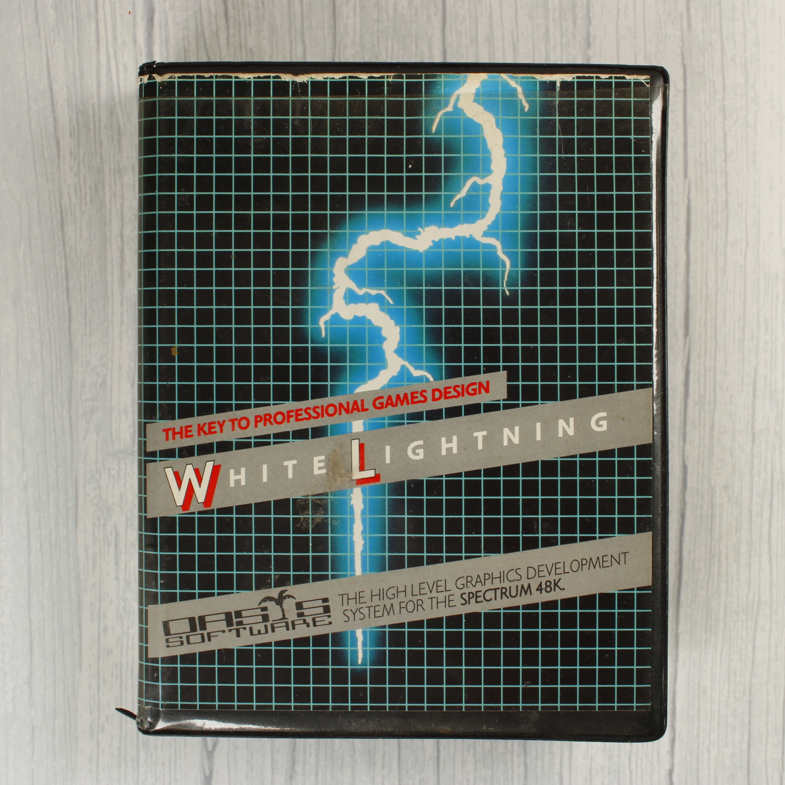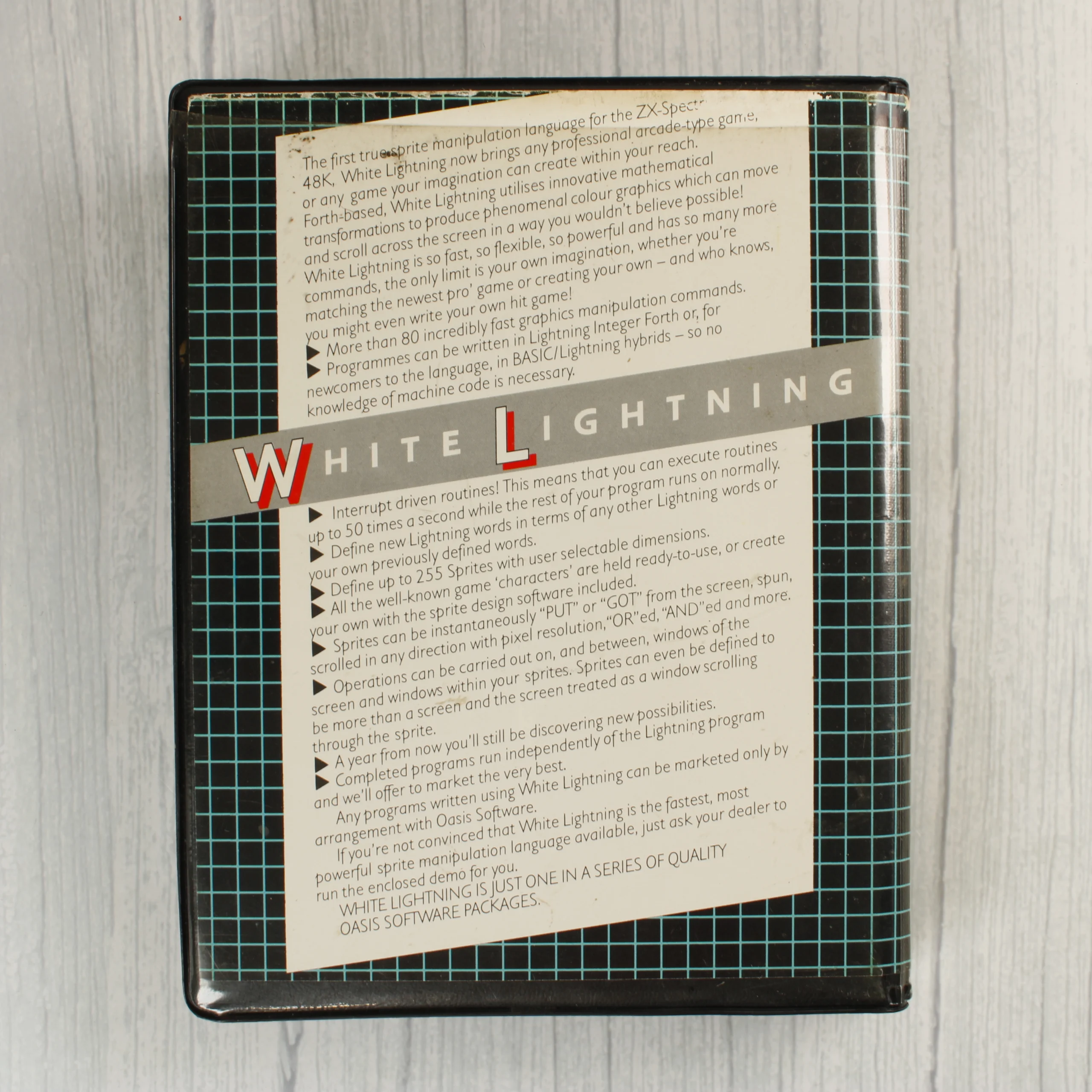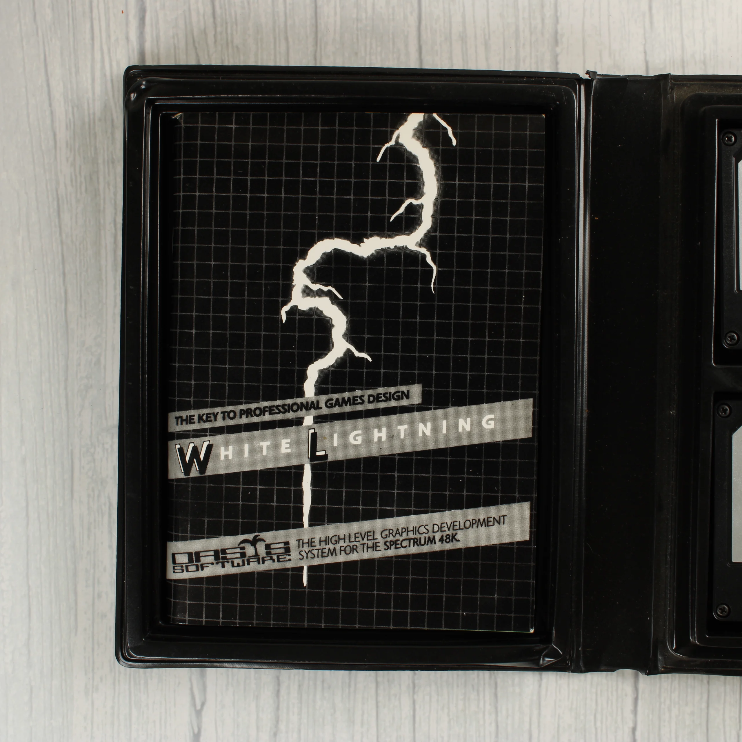 A White Lightning egy professzionális grafikai fejlesztőrendszer ZX Spectrum 48K számítógéphez, az Oasis Software gondozásában. A csomag egy fekete, műanyag tokban érkezik, amelynek borítóján villám motívum és négyzethálós háttér látható. A készlet két darab magnókazettát tartalmaz: az egyik a Sprite Development Package, a másik pedig a Demo A jelölést viseli. A kazetták fekete házasok, ezüstszínű címkével és pálmafás logóval. A csomag részét képezi továbbá egy nyomtatott használati útmutató is, amely a tok bal belső felében kapott helyet. A külső borítón és a tok élein használatból eredő kopások és kisebb gyűrődések láthatóak, de a belső tartalom és a kazetták megkímélt állapotban vannak.