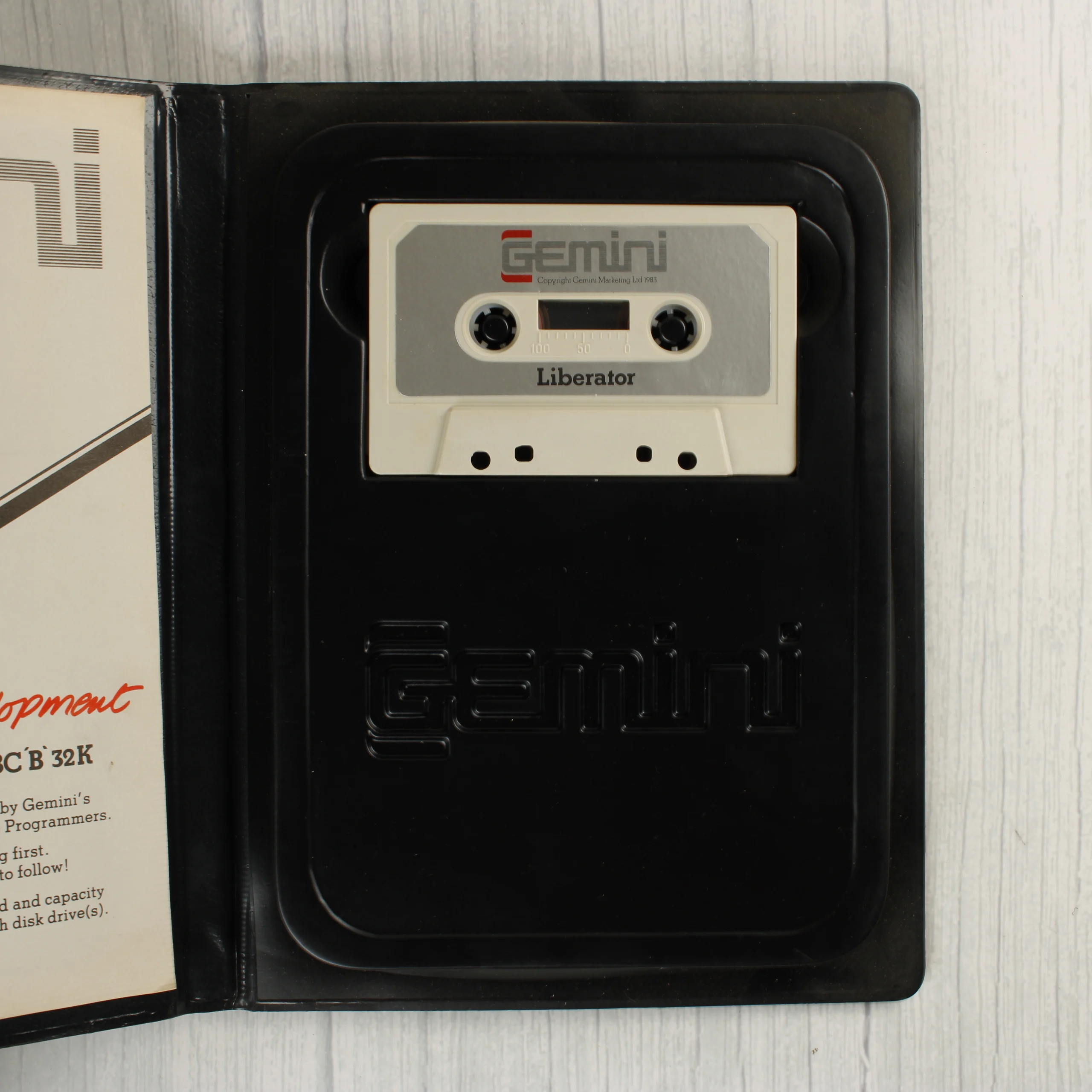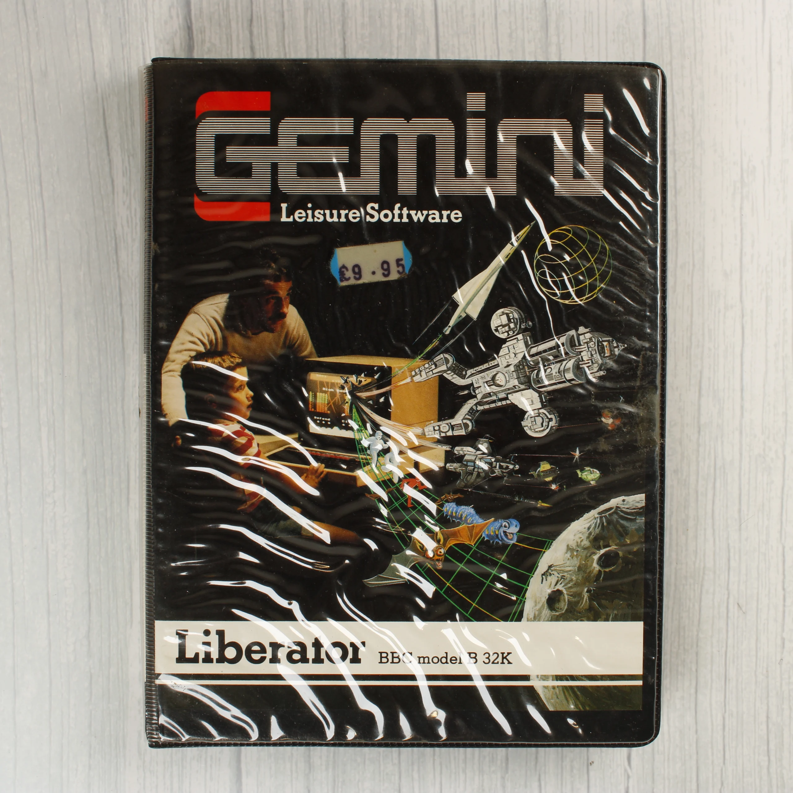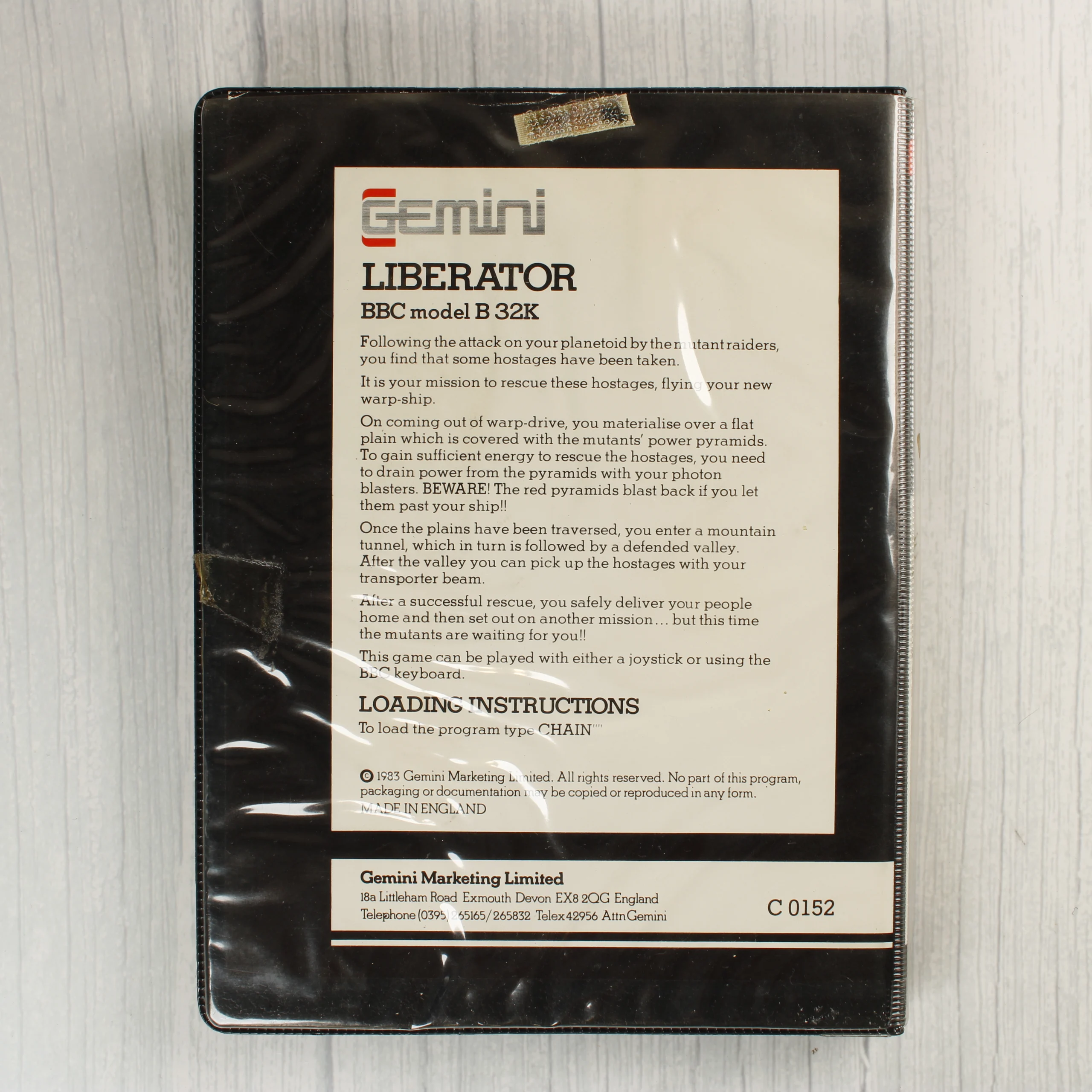 A Gemini Leisure Software által kiadott Liberator című videójáték BBC Model B 32K számítógépre. A termék egy fekete, puha műanyag tokban található, amelynek elején színes illusztráció látható egy űrhajóval és egy számítógép előtt ülő gyermekkel. A csomag tartalmazza az eredeti magnókazettát, amely fehér színű, szürke címkével ellátva. A tok belsejében egy információs füzet vagy borító is helyet kapott, amely a kiadó egyéb szoftvereit hirdeti 1983-as dátummal. A külső műanyag borításon egy régi, 9.95 fontos árcímke maradványa látható. A hátoldalon részletes leírás olvasható a játékról és a betöltési útmutatóról.