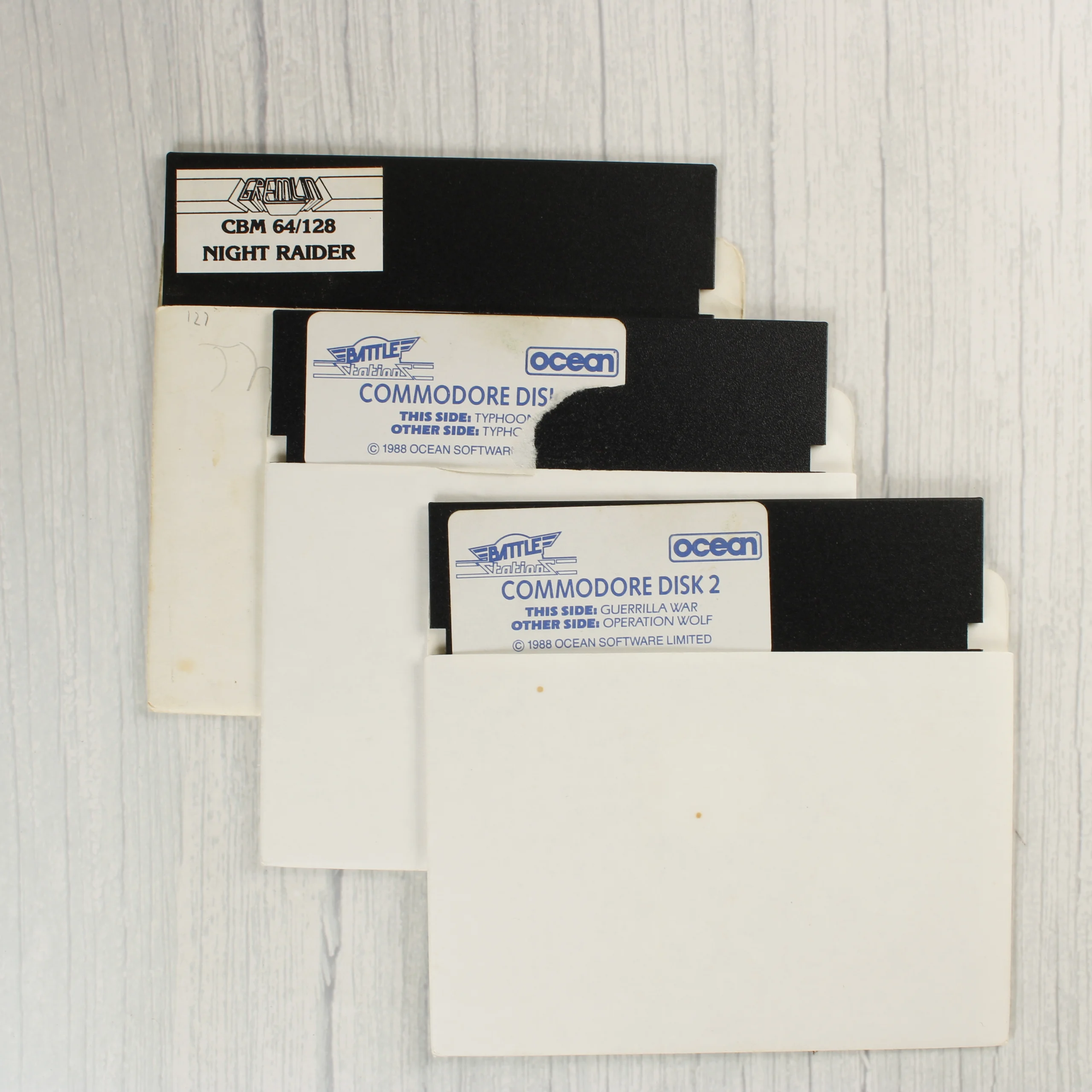 A Battle Stations című videójáték-válogatás Commodore 64/128 platformra. A csomag egy színes illusztrációval ellátott kartondobozt és három darab 5,25 colos floppy lemezt tartalmaz fehér papírtokban. A doboz elején az Operation Wolf, a Typhoon és a Guerrilla War játékok grafikái láthatóak az Ocean Software logójával. A lemezek fekete színűek, fehér címkével, amelyeken a játékok címei és a kiadó adatai szerepelnek. Az egyik lemez a Gremlin Graphics által kiadott Night Raider játékot tartalmazza. A doboz élei mentén kopások és kisebb benyomódások láthatóak, a papírtokok enyhén sárgultak.