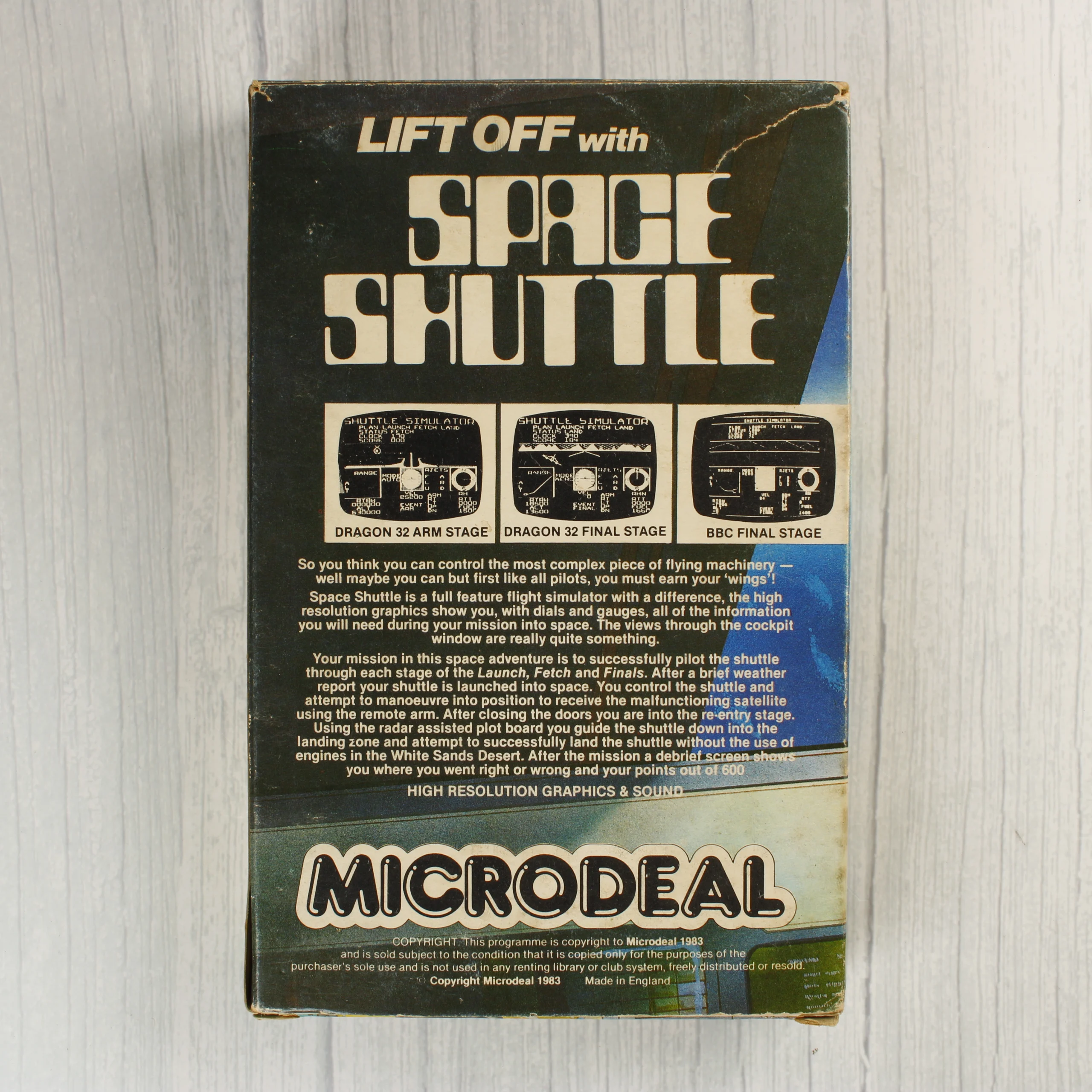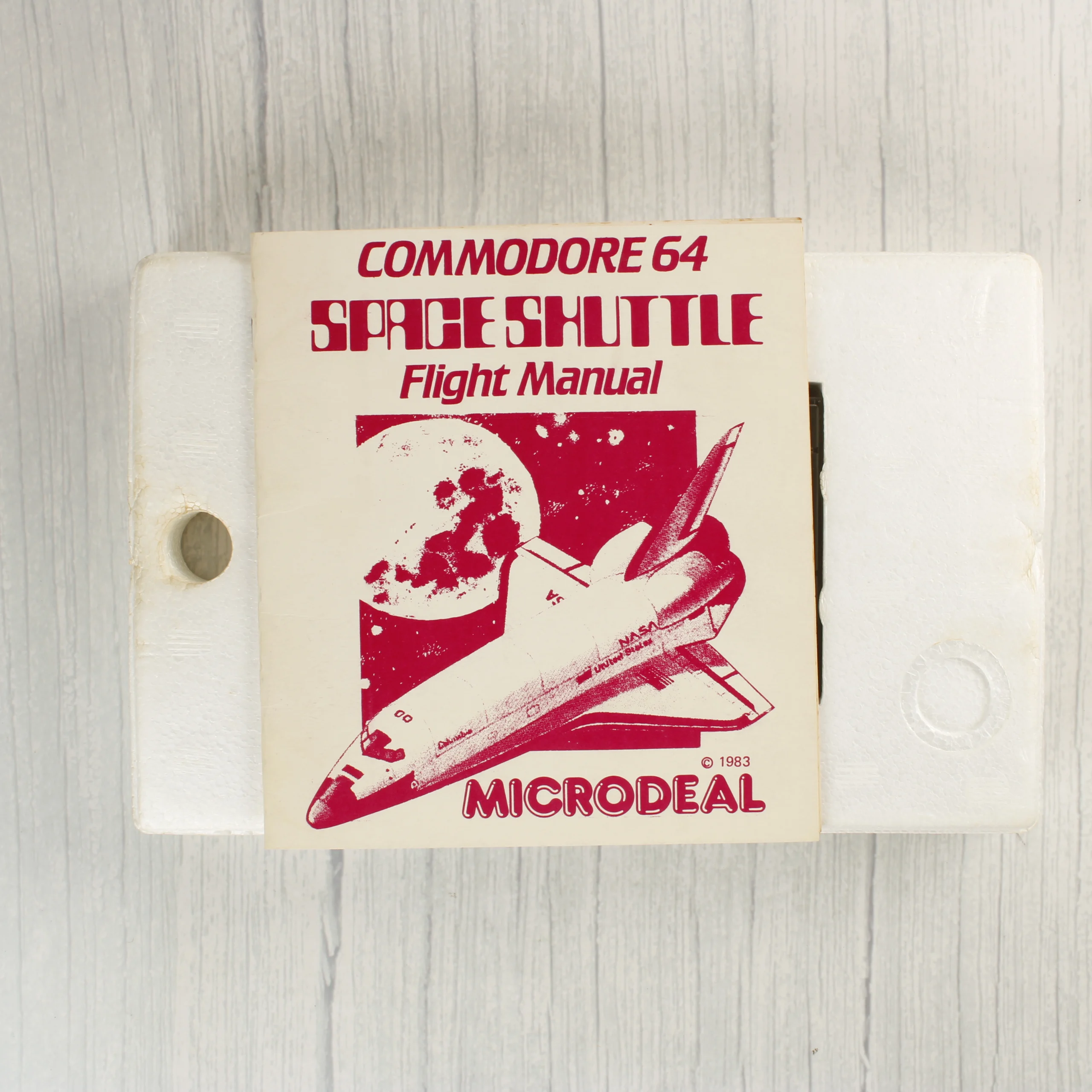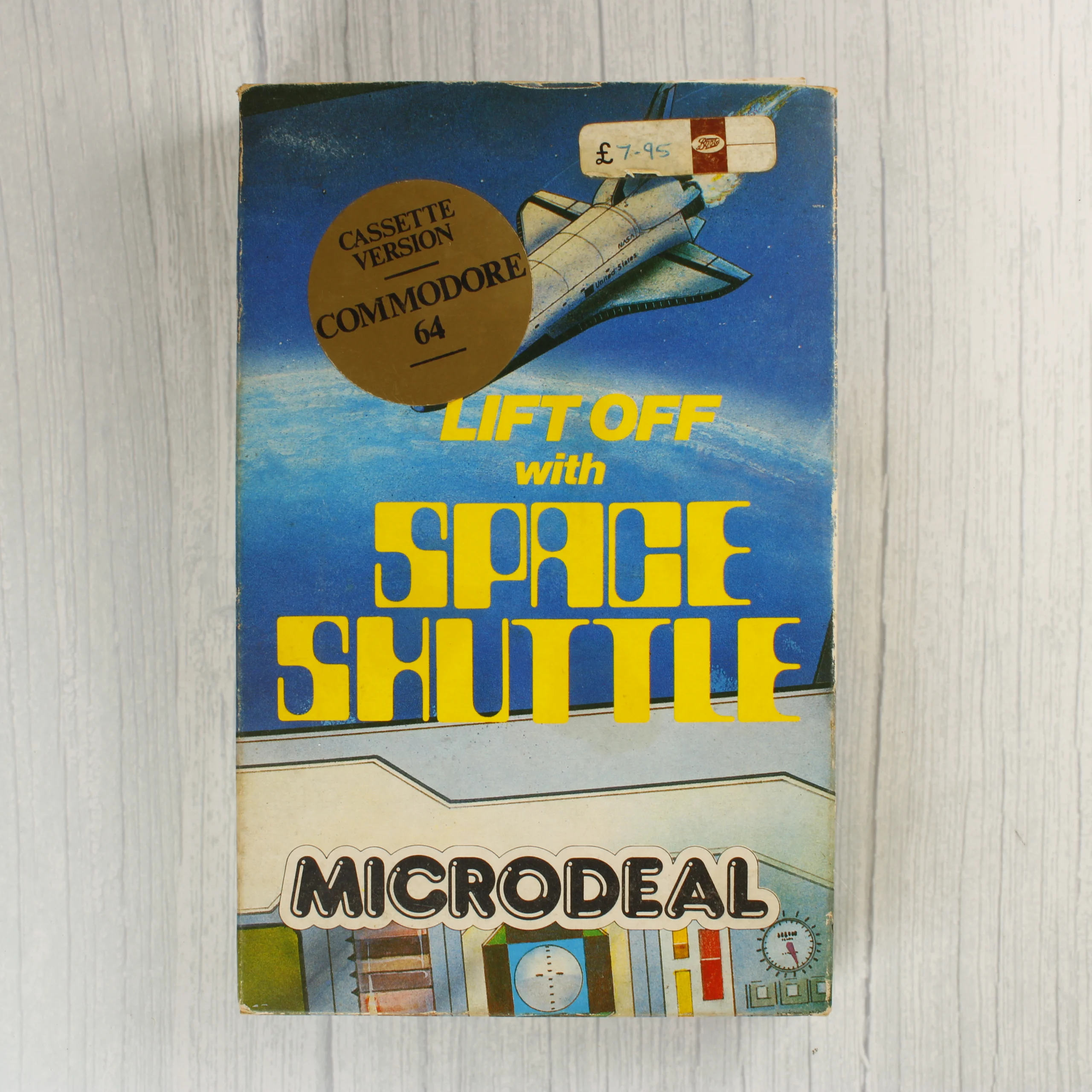 A Microdeal által 1983-ban kiadott Space Shuttle repülésszimulátor videójáték Commodore 64 platformra. A csomag tartalmazza az eredeti színes kartondobozt, amelyen egy űrsikló látható indítás közben, valamint egy arany színű kör alakú matricát, amely a kazettás verziót és a kompatibilitást jelzi. A doboz hátoldalán képernyőmentések és angol nyelvű leírás található a játékmenetről. A készlet része továbbá egy fehér hungarocell belső tartó, egy átlátszó műanyag tokban elhelyezett magnókazetta piros felirattal, valamint egy többoldalas, illusztrált használati útmutató (Flight Manual). A papíralapú összetevőkön enyhe sárgulás és a széleken kopás látható, a doboz sarkai kissé megviseltek. A doboz elején egy régi árcédula maradványa is megfigyelhető.