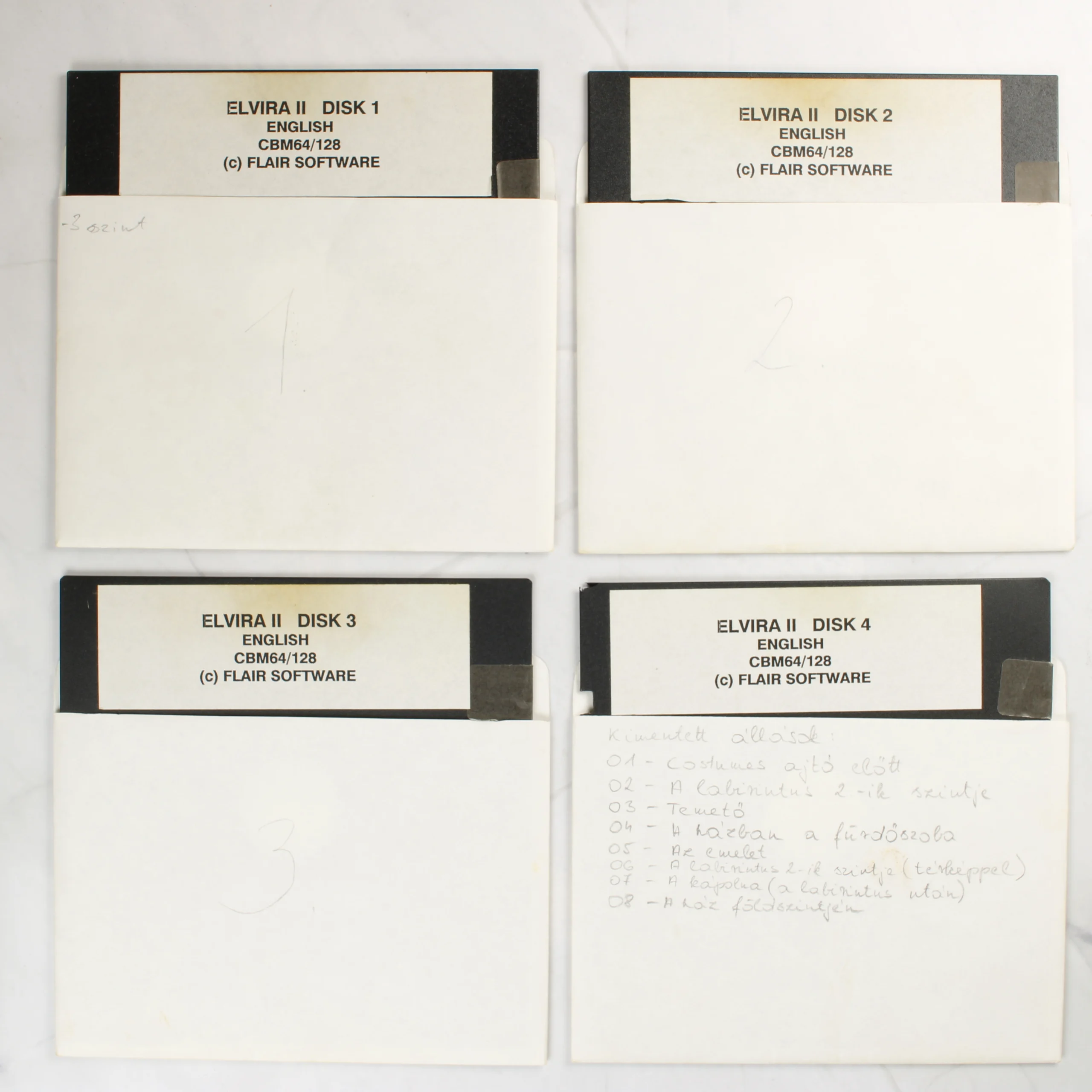 Elvira II: The Jaws of Cerberus videójáték Commodore 64/128-ra. 4 darab 3,5 colos floppy lemez, eredeti dobozban és útmutatóval.
