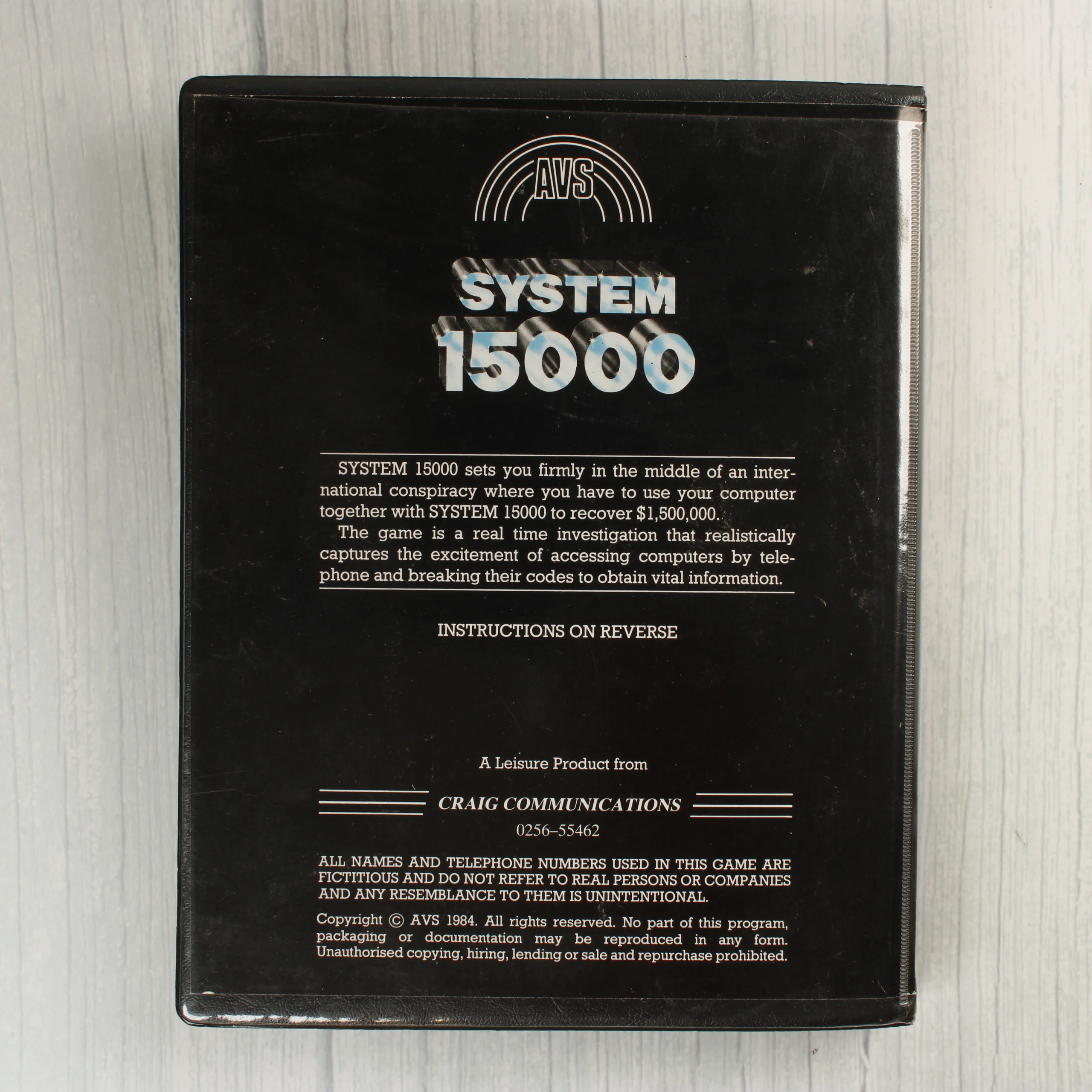 A System 15000 című videójáték BBC Model B számítógépre készült kiadása. A csomag egy fekete színű, műanyagból készült, könyvszerűen nyíló tokot tartalmaz, amelyben egy darab mágnesszalagos kazetta található. A tok előlapján nagy, térhatású fehér és kék betűkkel látható a cím, alatta pedig a valós idejű kommunikációs játékra utaló felirat olvasható. A jobb alsó sarokban egy kék sáv jelzi, hogy ez a második kiadás (2nd Edition), amely kompatibilis a BBC Model B OS 1.0+ rendszerekkel. A hátoldalon a játék rövid leírása, a kiadó Craig Communications adatai és az 1984-es szerzői jogi információk szerepelnek. A belső részben a kazetta egy mélyített műanyag tálcában helyezkedik el, mellette pedig a használati útmutató látható.