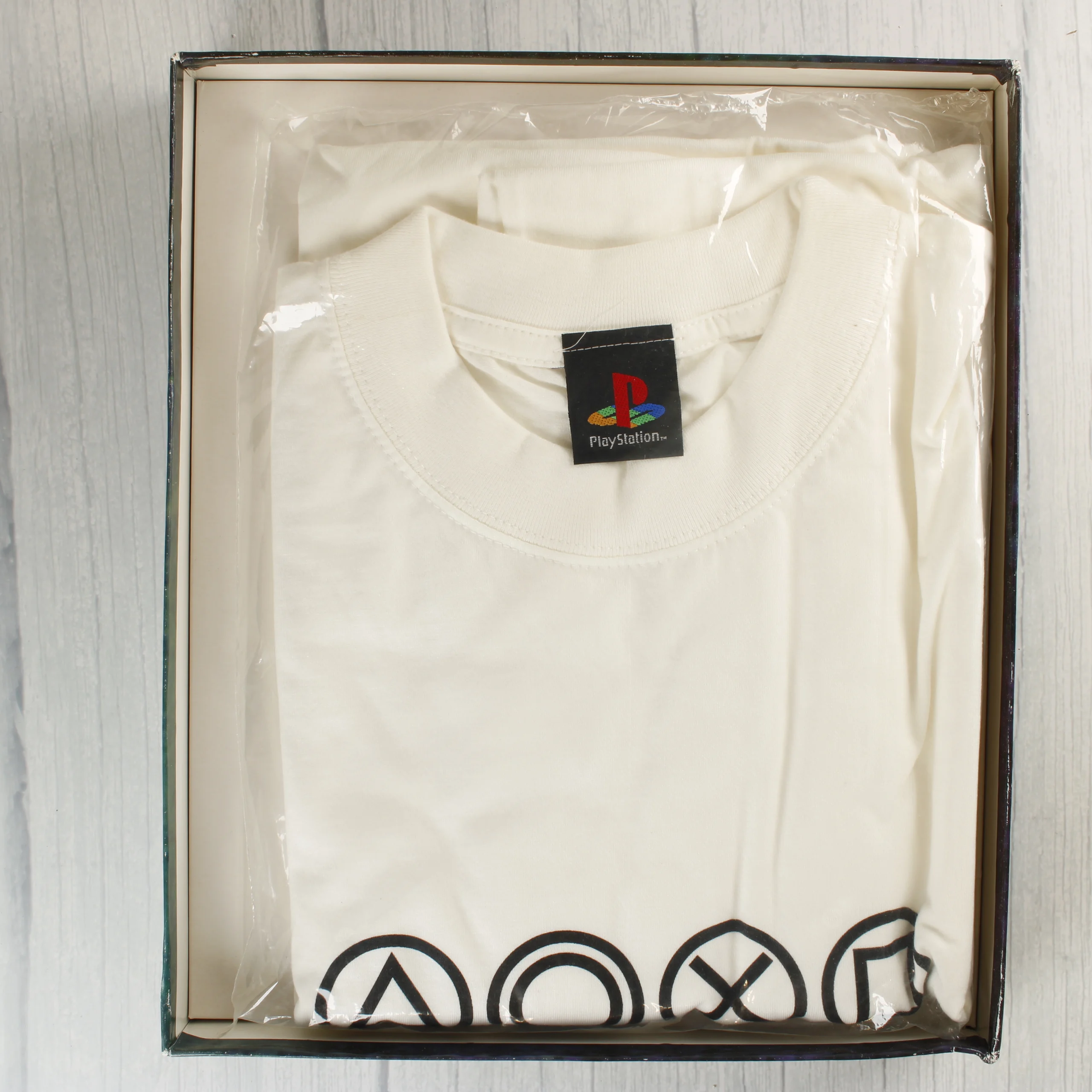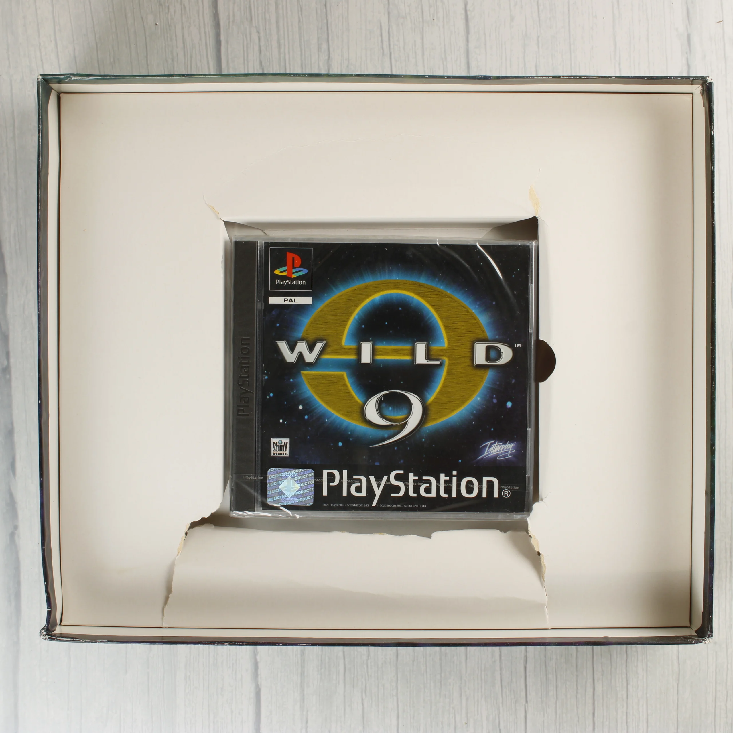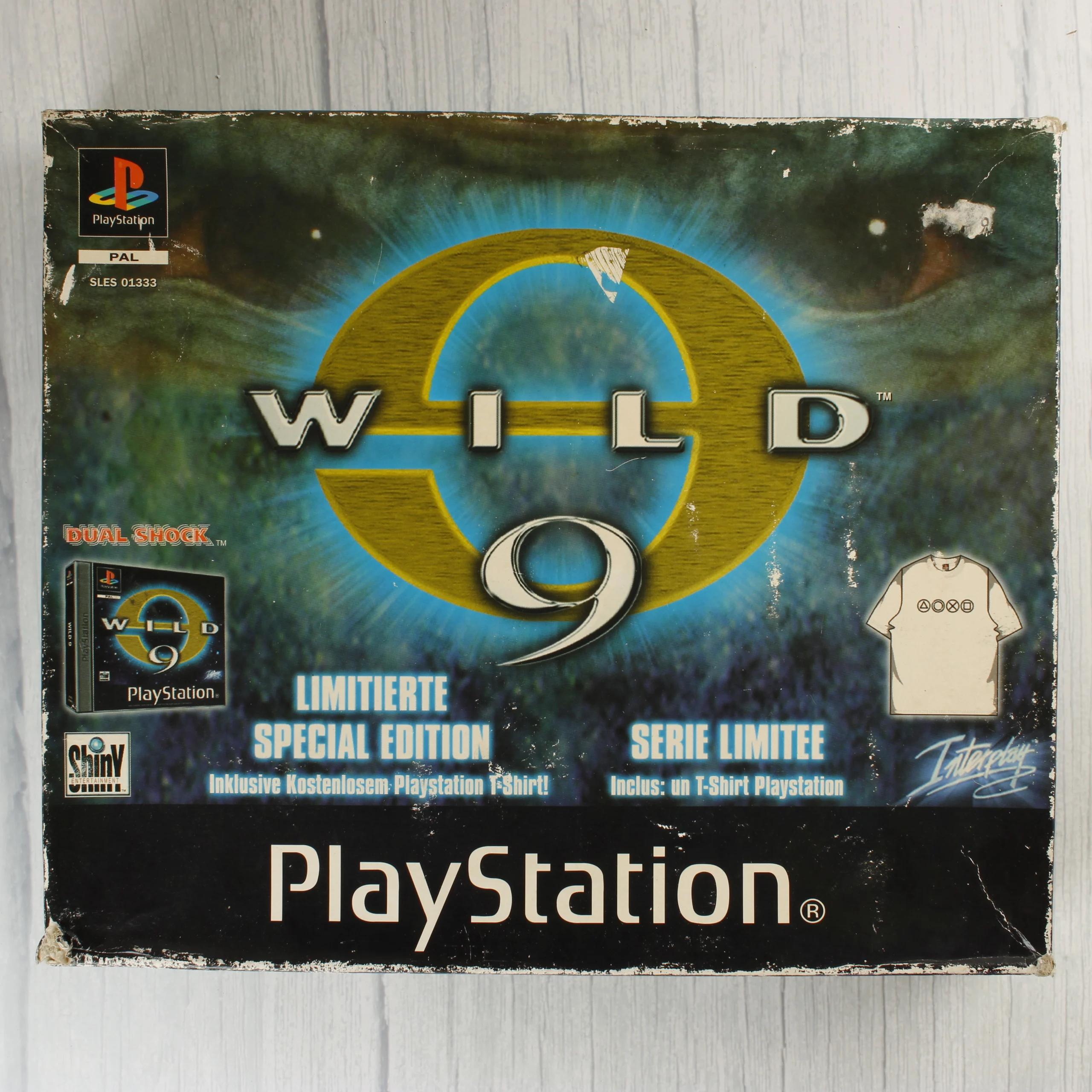 A Wild 9 című videójáték limitált különleges kiadása PlayStation konzolra. A csomag egy nagyméretű kartondobozban érkezik, amely tartalmazza a játékot egy normál CD-tokban, valamint egy fehér színű, PlayStation logóval és szimbólumokkal ellátott pólót. A külső papírdobozon német és francia nyelvű feliratok láthatóak, amelyek a mellékelt ajándék pólót hirdetik. A doboz elején a játék logója és a Shiny Entertainment, valamint az Interplay emblémái szerepelnek. A belső papírbélés a CD-tok körül több helyen beszakadt és sérült. A póló eredeti műanyag csomagolásában található. A külső doboz élei mentén fehér kopásnyomok és kisebb benyomódások láthatóak, különösen a sarkoknál.