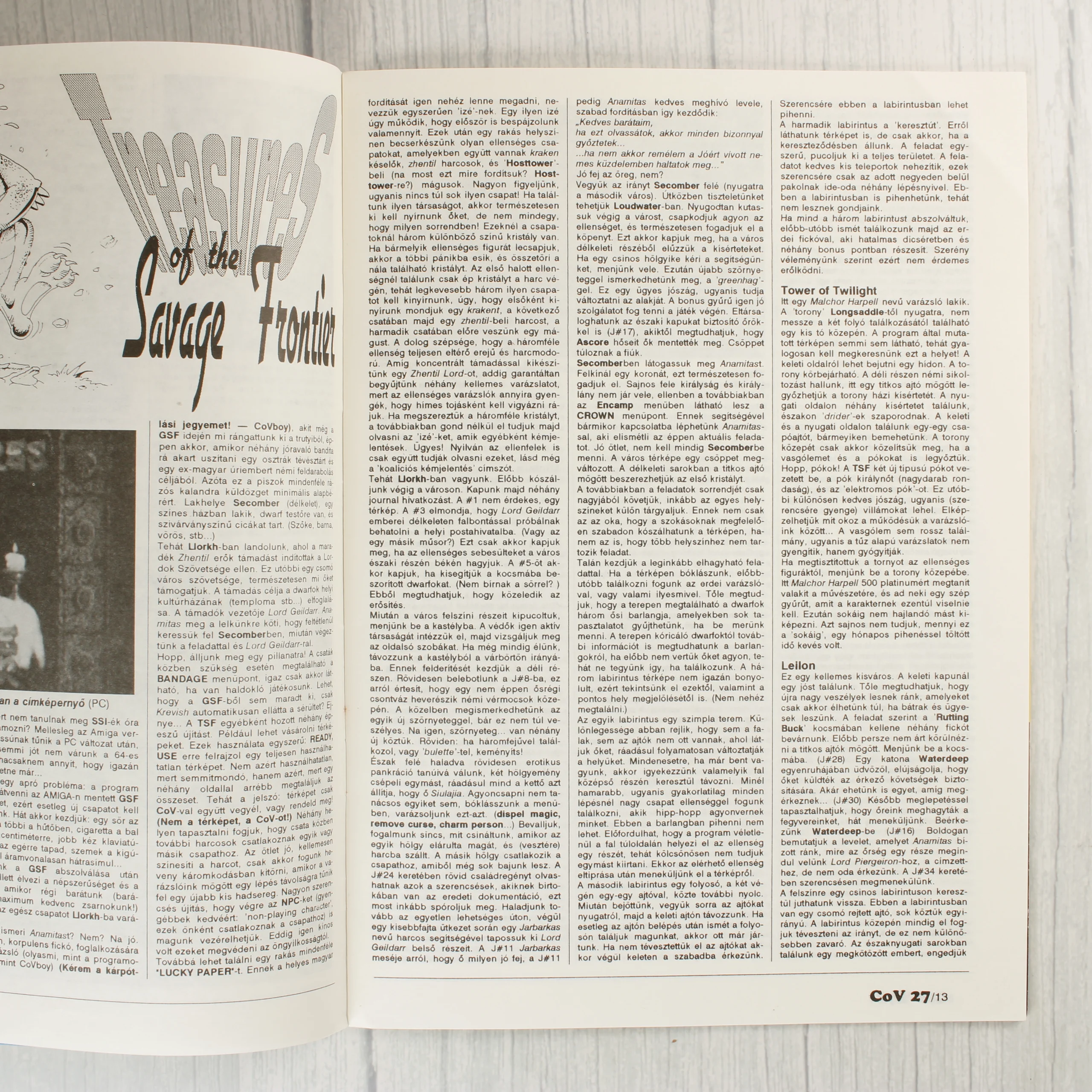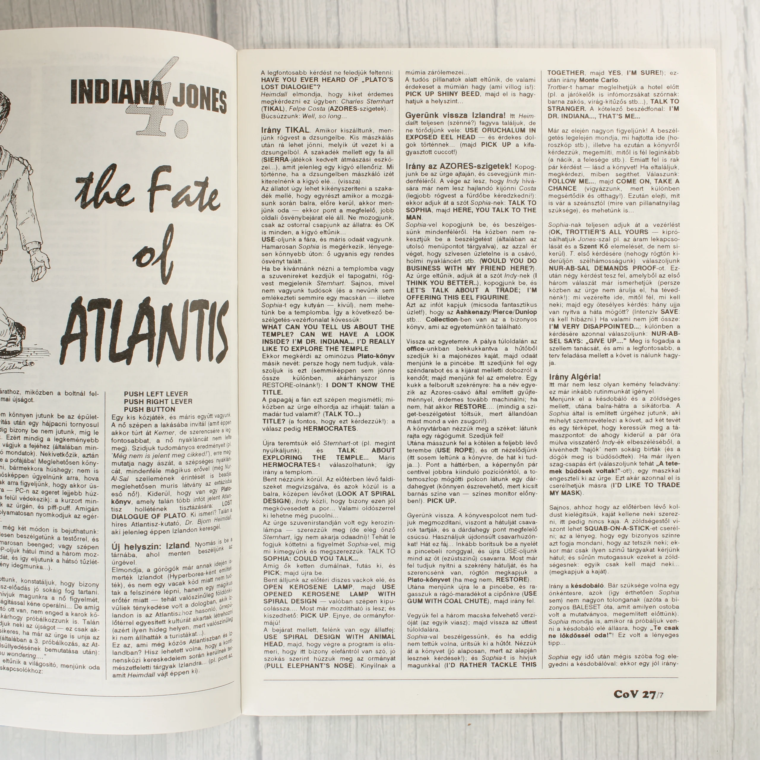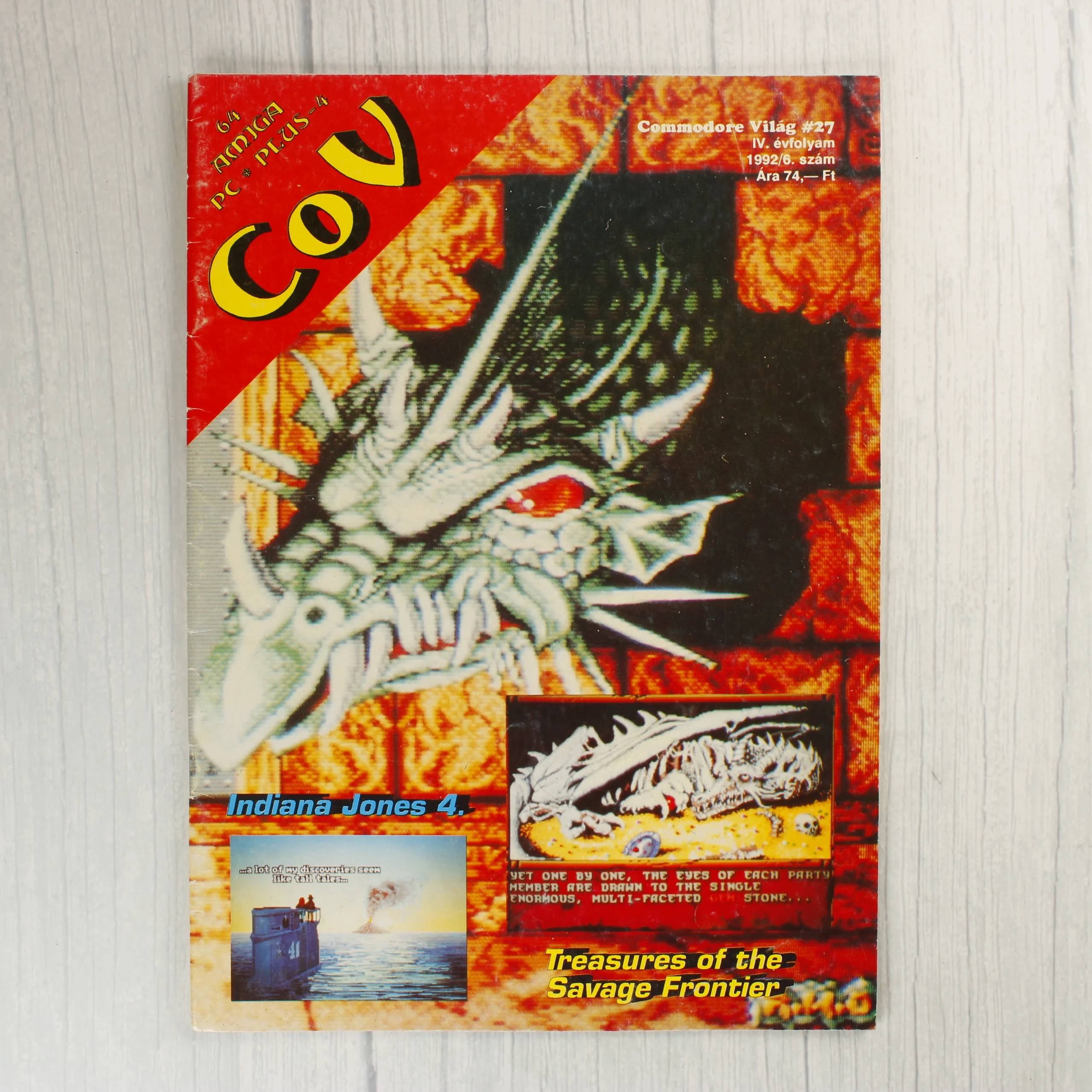 A Commodore Világ (COV) videójátékos magazin 27. száma, amely 1992 júniusában jelent meg (IV. évfolyam, 6. szám). A borítón egy részletgazdag, zöldes árnyalatú sárkányfej látható, alatta pedig az Indiana Jones 4. és a Treasures of the Savage Frontier játékokból származó képernyőmentések kaptak helyet. A magazin fejlécében a COV logó mellett a támogatott platformok (C64, Amiga, PC, Plus-4) listája olvasható. A belső oldalak fekete-fehér nyomtatásúak, sűrűn szedett szöveggel, amelyek részletes végigjátszásokat és tippeket tartalmaznak az említett kaland- és szerepjátékokhoz. A papír a korának megfelelő, enyhén sárgult állapotban van.