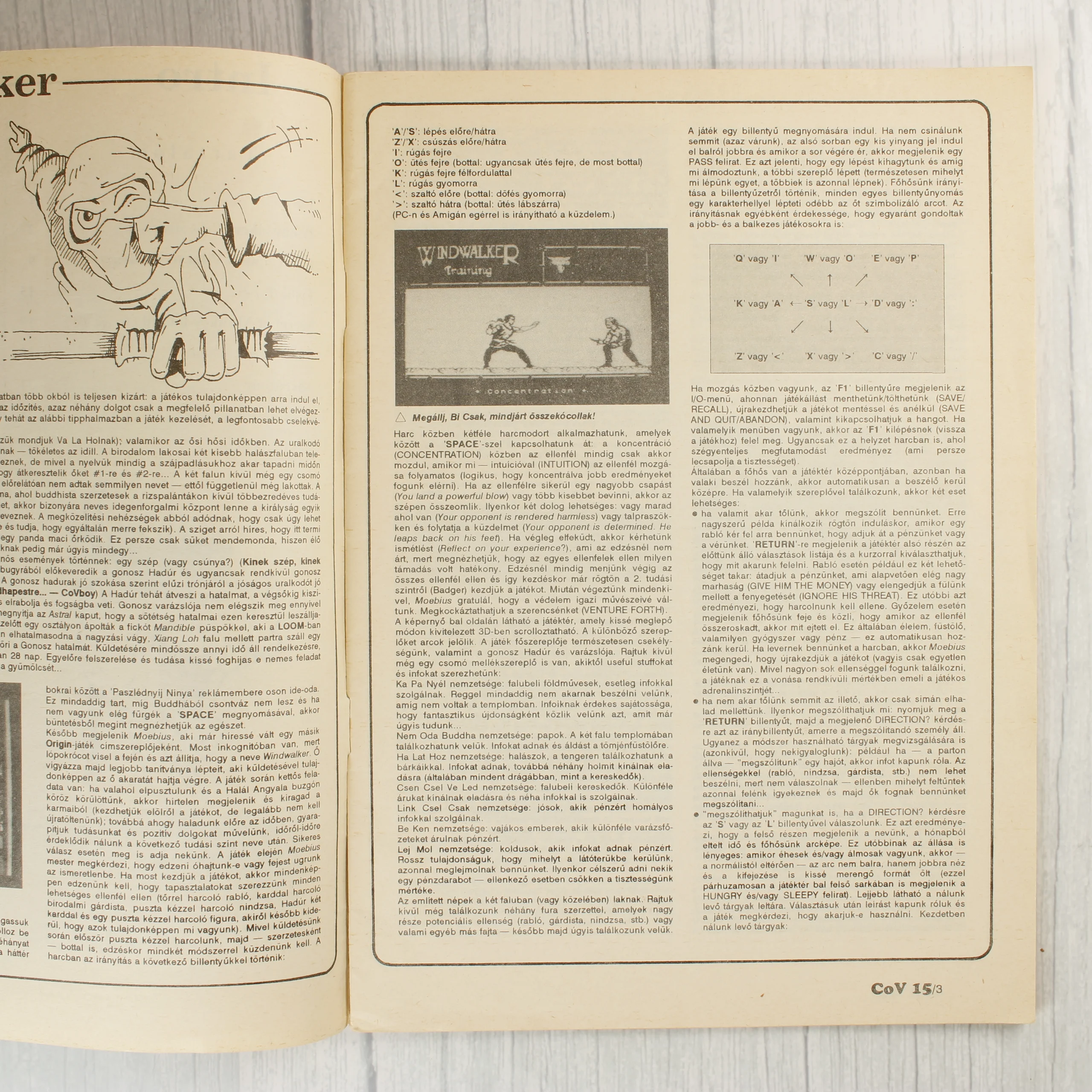 A Commodore Világ (CoV) videójáték-magazin 15. száma, amely 1991 áprilisában jelent meg. A borítón egy vadászrepülőgép és egy pilóta látható sárga, koncentrikus körökkel díszített háttér előtt. A címlapon olyan klasszikus játékok címei szerepelnek, mint a Secret of the Monkey Island, a Windwalker és a Combat Pilot. A magazin a Commodore 64, Amiga és Plus 4 platformokkal foglalkozik. A belső oldalakon részletes játékleírások és végigjátszások olvashatók fekete-fehér illusztrációkkal és szöveges táblázatokkal. A papír az éleknél enyhén sárgult, ami a korából adódó természetes jelenség. A borító színei élénkek, a fűzés épnek tűnik.