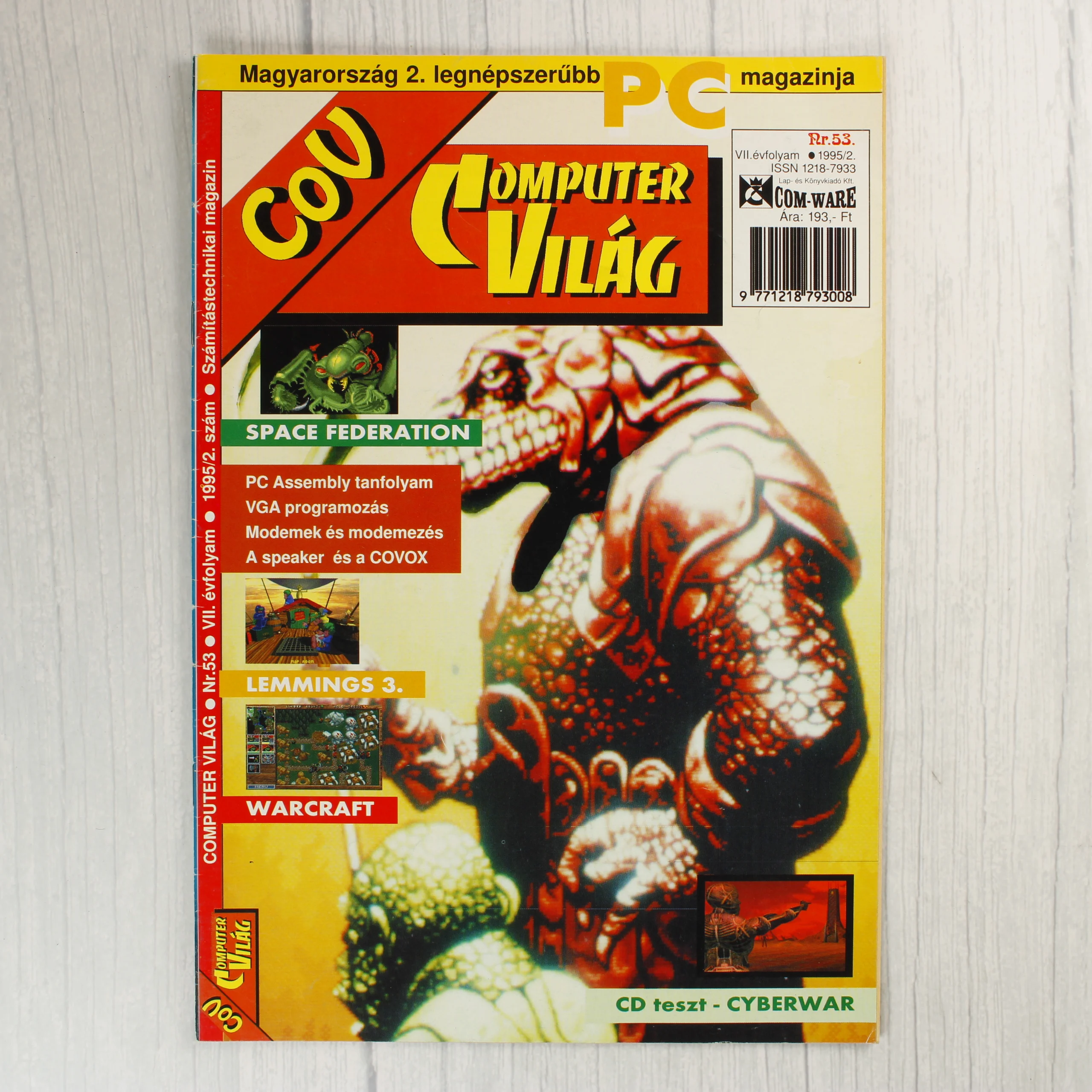 A Commodore Világ (COV) számítástechnikai magazin 53. száma, amely 1995 februárjában jelent meg. A címlapon egy páncélozott, hüllőszerű lény látható, amely a Space Federation videójátékhoz kapcsolódik. A borító sárga és piros alapszínű, rajta több játékcím olvasható, mint például a Lemmings 3 és a Warcraft. A magazin belső oldalai fekete-fehér és színes illusztrációkat tartalmaznak, többek között az Amiga News és különböző játékismertetők (pl. X-Com, BloodNet) rovataival. A kiadvány a Com-Ware Kft. gondozásában jelent meg, ára 193 Ft volt. A papír állapota a korának megfelelő, a széleken enyhe kopás látható.
