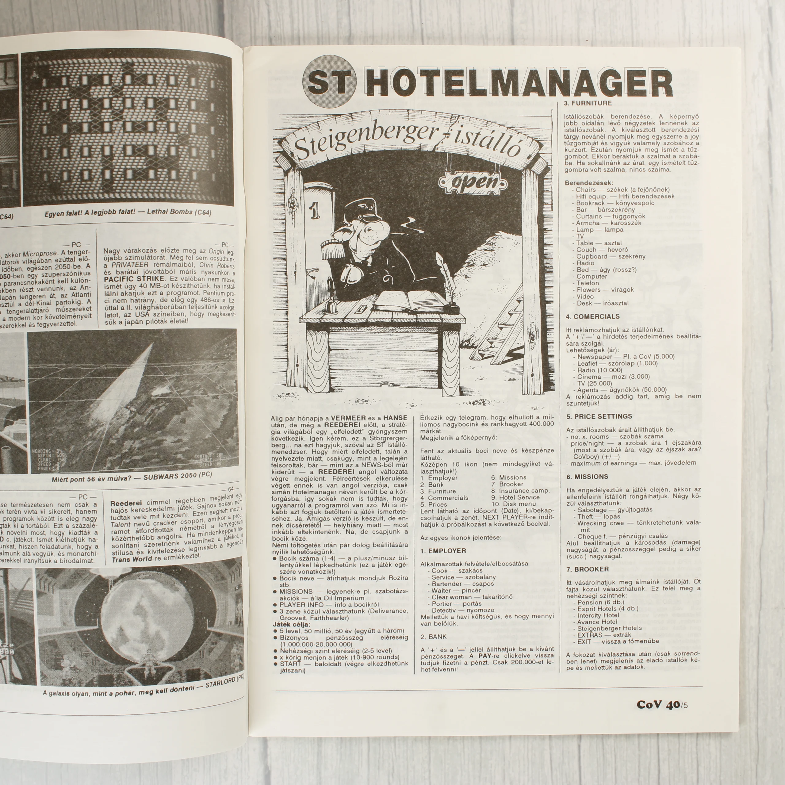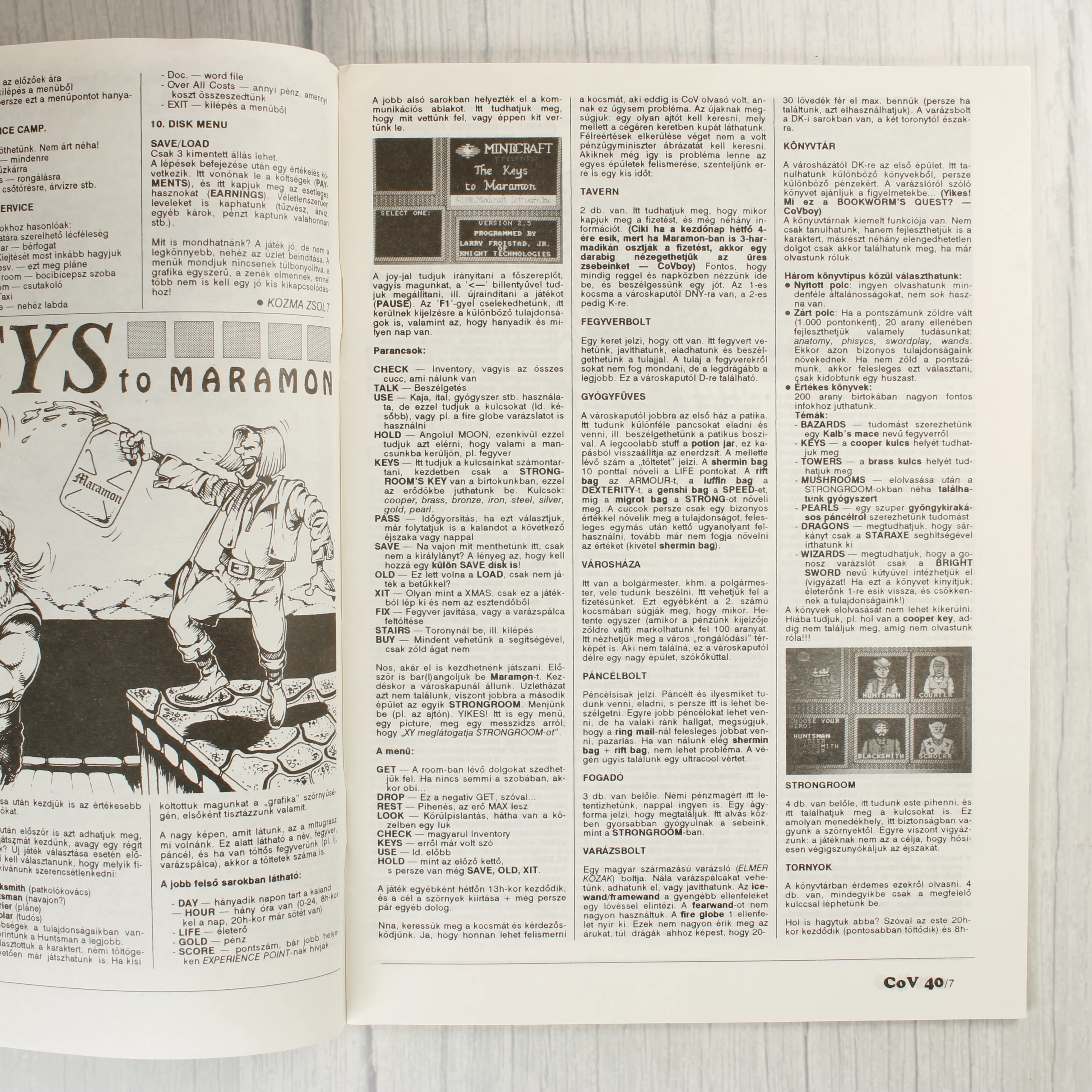 A Commodore Világ (COV) videójáték-magazin 40. száma, amely 1994 januárjában jelent meg. A színes borítón egy kigyúrt harcos látható, körülötte pedig különböző korabeli játékokból származó képernyőmentések kaptak helyet, mint például a Dark Sun, Ultima, és Inca. A magazin C64, Amiga, PC és Plus/4 platformokkal foglalkozik. A belső oldalak fekete-fehér nyomtatásúak, szöveges ismertetőket, játékleírásokat és képernyőfotókat tartalmaznak, például az ST Hotelmanager és a Keys to Maramon játékokról. A kiadvány tűzött kötésű, a borítón látható a vonalkód, az ár (139 Ft) és az ISSN szám. A papír a széleken enyhén sárgult, de a magazin egyben van.