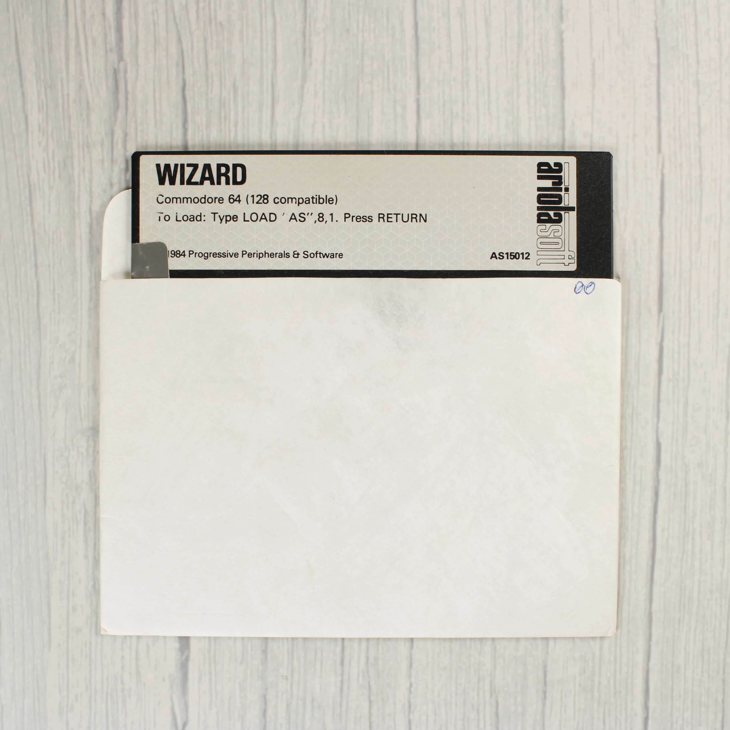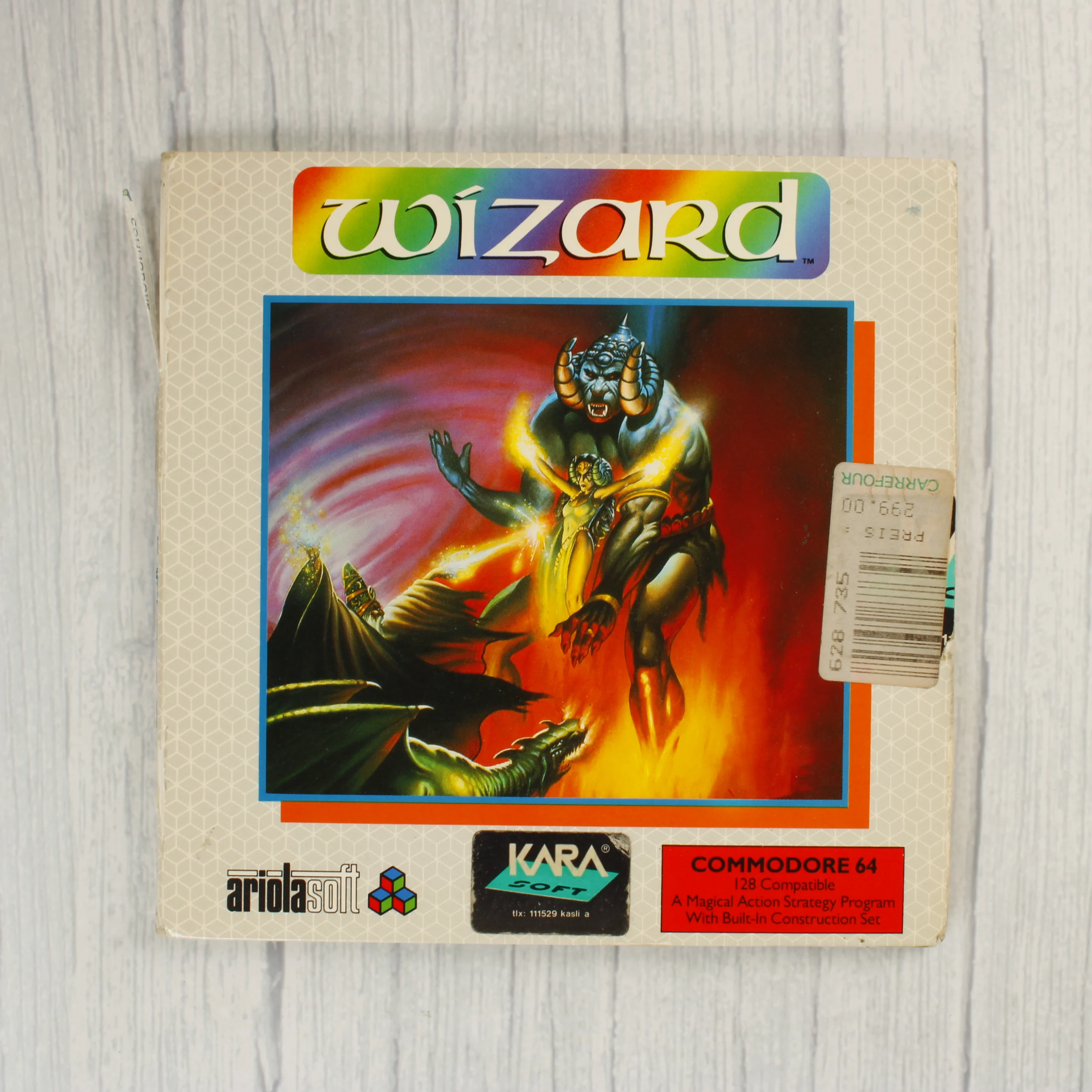 A Wizard egy 1984-es kiadású akció-stratégiai videójáték Commodore 64 platformra. A csomag tartalmazza az eredeti kartondobozt, amelyen színes, fantasy stílusú illusztráció látható egy démoni lénnyel és egy sárkánnyal. A doboz hátoldalán játékmenet-képernyőképek és a funkciók leírása olvasható angol nyelven. A készlet része egy 5,25 colos floppy lemez, amely fehér papírtokban helyezkedik el. A lemezen lévő címke szürke alapon fekete feliratokkal tartalmazza a betöltési utasításokat és az Ariolasoft logóját. A dobozon több helyen régi árcímkék és matricák maradványai láthatók, a sarkoknál és éleknél enyhe kopás tapasztalható.