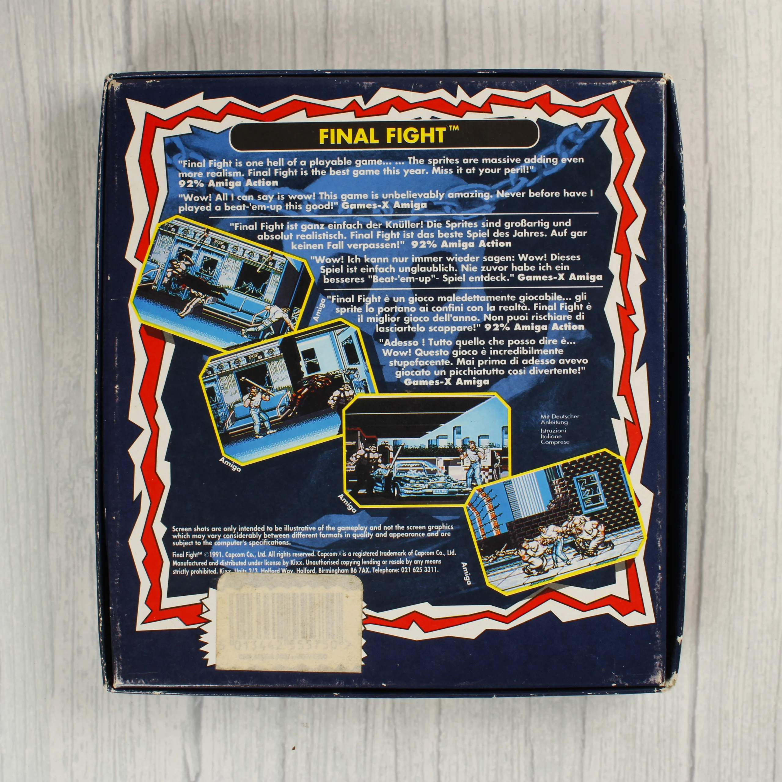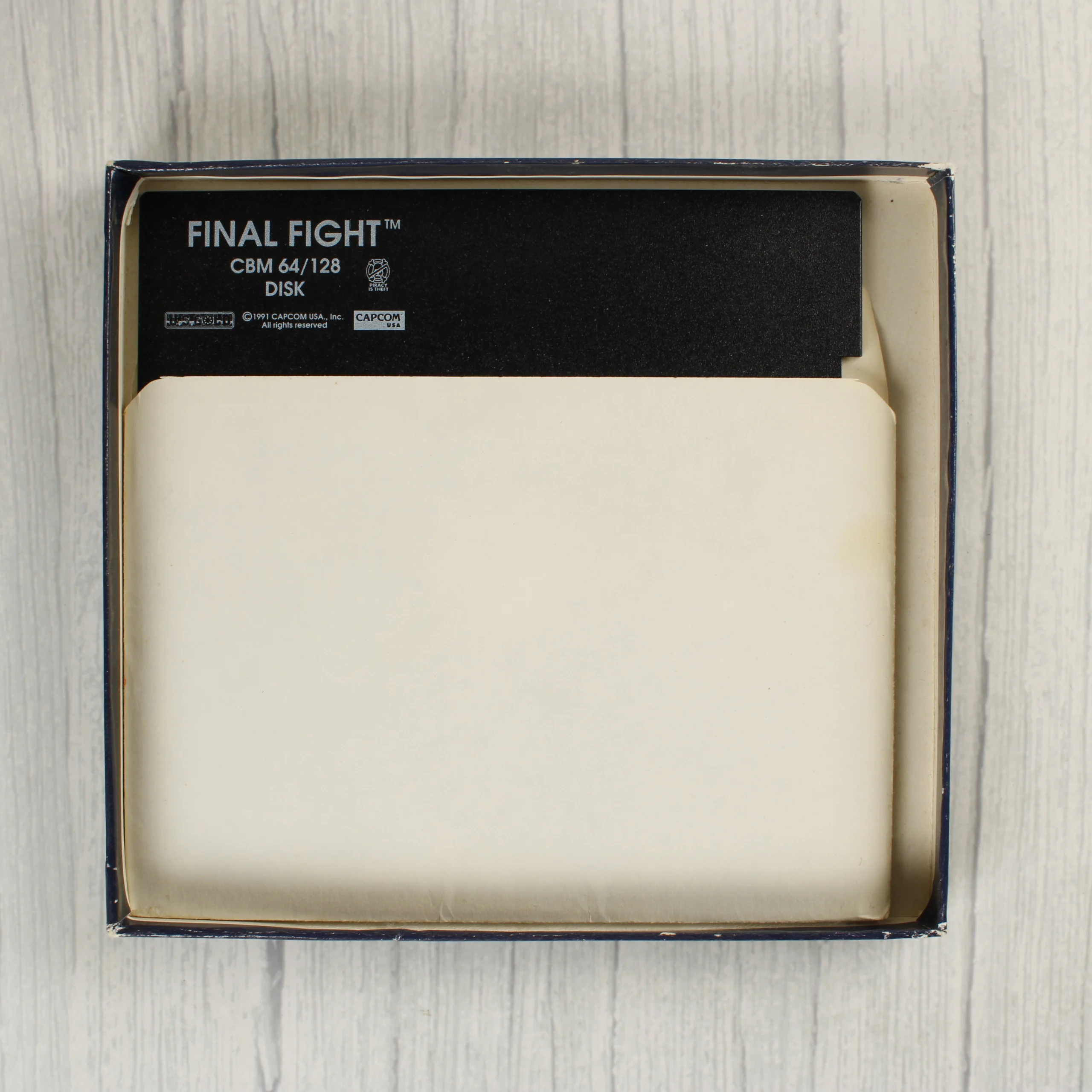 A Final Fight című videójáték Commodore 64/128 platformra kiadott változata, a Kixx kiadásában. A csomagolás egy színes illusztrációval ellátott kartondoboz, amelyen a játék főhősei és ellenségei láthatóak harc közben. A doboz elején egy sárga kör alakú matrica hirdet ingyenes játékajánlatot. A hátoldalon többnyelvű (angol, német, olasz) leírás és képernyőmentések találhatók a játékmenetből. A doboz belsejében egy 5,25 colos floppy lemez található, fehér papírtokban. A lemezen fehér felirat jelzi a címet és a kompatibilitást. A doboz élei mentén kisebb kopások és fehér foltok láthatóak, a hátoldalon pedig egy régi árcédula vagy vonalkód maradványa fedezhető fel.