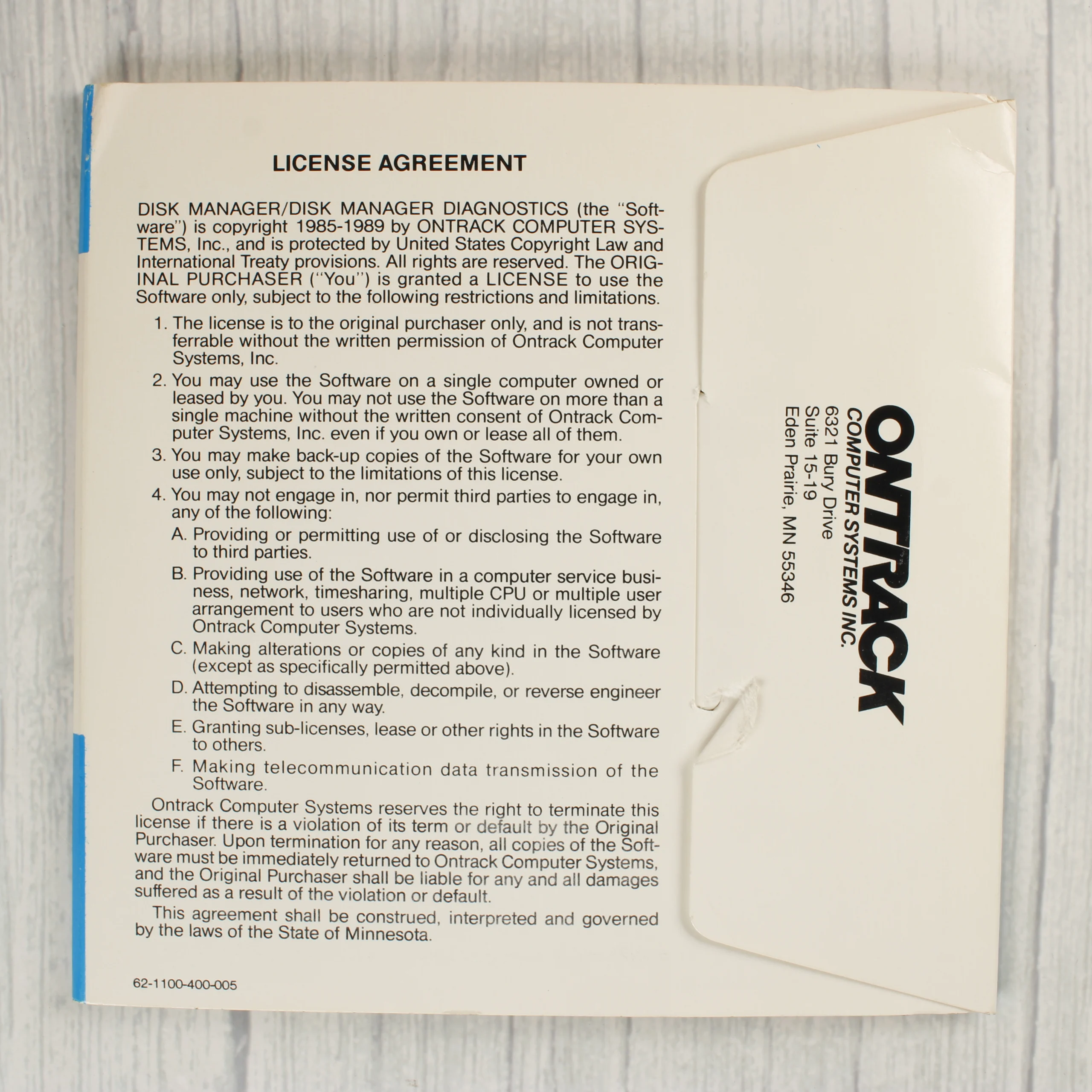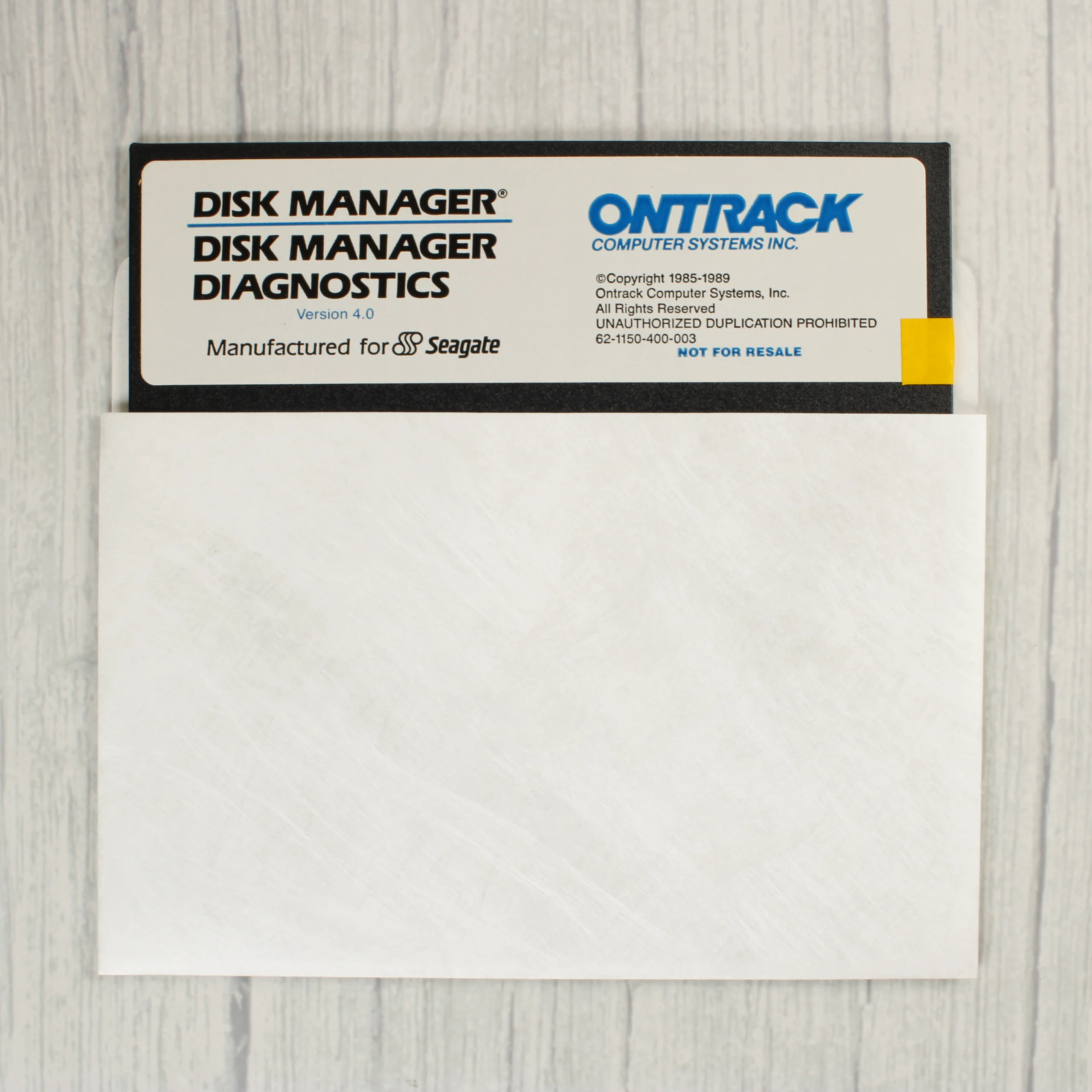 Az Ontrack Computer Systems által fejlesztett Disk Manager és Disk Manager Diagnostics szoftver 4.0-s verziója, amelyet a Seagate számára gyártottak. A csomag tartalmaz egy 5,25 colos floppy lemezt, amely egy fehér papírtokban helyezkedik el. A szoftver lemeztelepítő és karbantartó funkciókat lát el. A kék és fehér színekkel díszített külső papírtok elején jól látható a terméknév és a verziószám, hátoldalán pedig a licencszerződés szövege olvasható. A lemezen fekete alapon fehér címke található, rajta a gyártói információkkal és a másolásvédelmi figyelmeztetéssel. A termék fizikai állapota megkímélt, a papírtok élei és sarkai enyhén kopottak, de szerkezetileg ép.