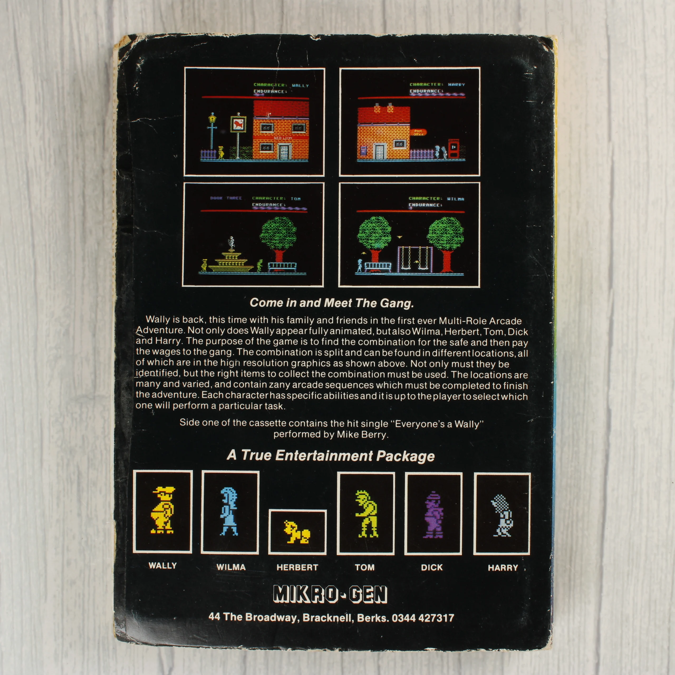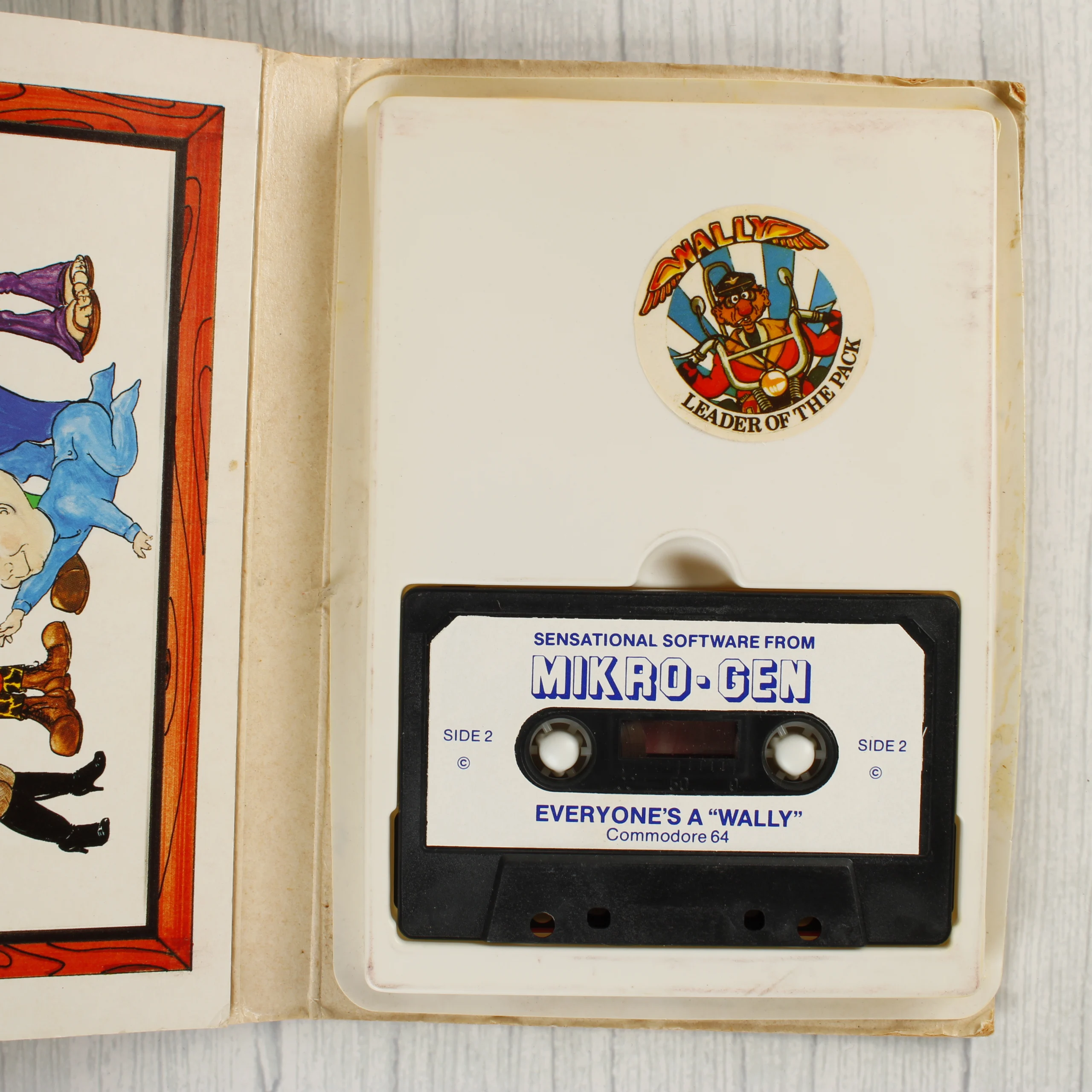 A Mikro-Gen által kiadott Everyone's a Wally című videójáték Commodore 64 platformra. A csomagolás egy színes, illusztrált kartonborítóból áll, amely egy fekete színű mágnesszalagos kazettát tartalmaz. A borító elején egy rajzolt jelenet látható a játék karaktereivel, a hátoldalon pedig képernyőképek és a játék leírása olvasható. A belső részben egy fehér műanyag tálca tartja a kazettát, felette pedig egy kerek matrica található. A kazetta címkéje fehér, kék feliratokkal. A termék használt állapotú, a papírborító élein és sarkain kopások, gyűrődések láthatóak, a belső műanyag részek enyhén sárgultak.